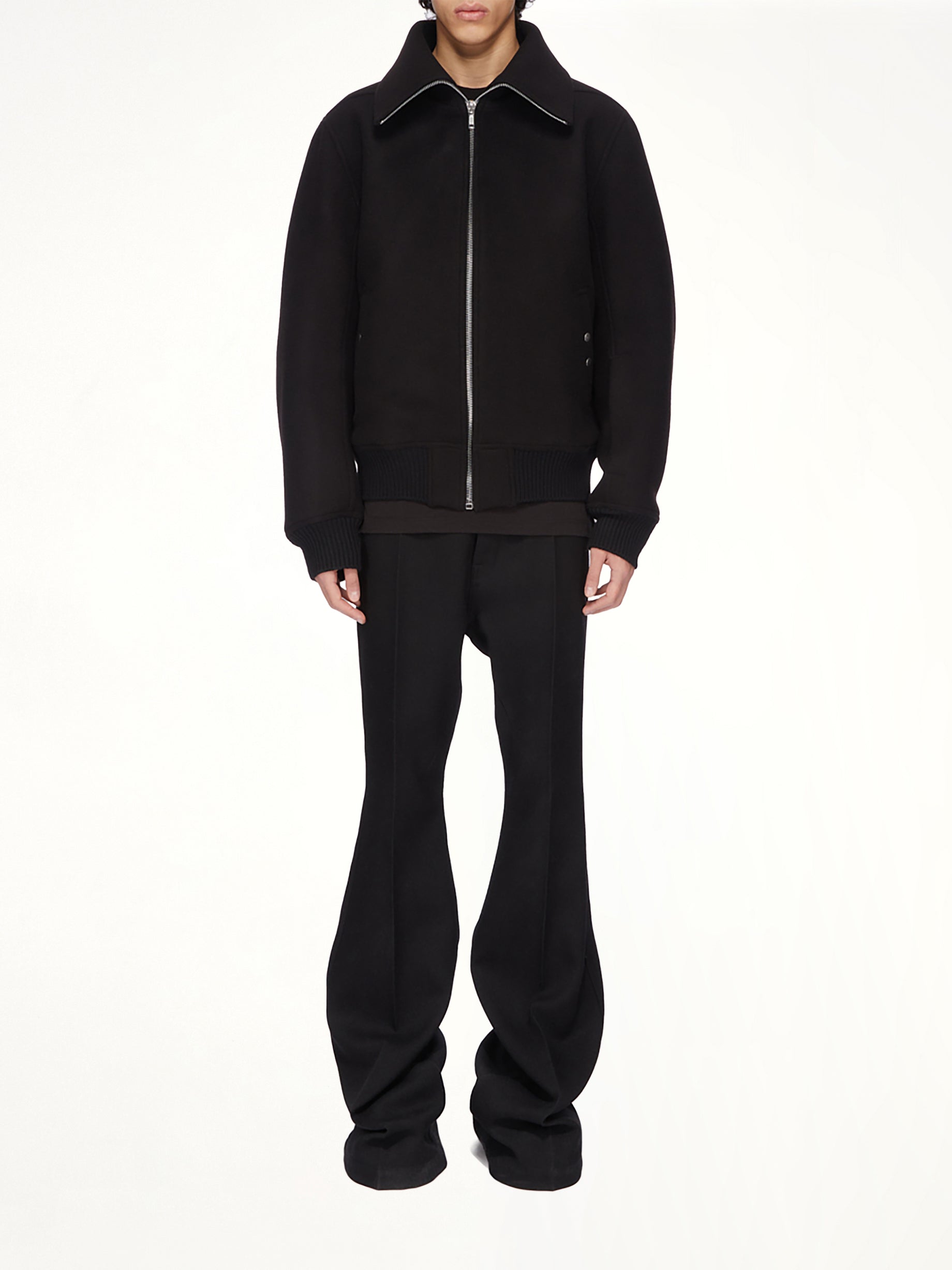 Rick Owens's Dracucollar Jacket in Black is a striking piece that combines avant-garde design with a timeless silhouette. This jacket is perfect for those who appreciate bold fashion statements and meticulous craftsmanship.