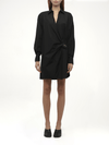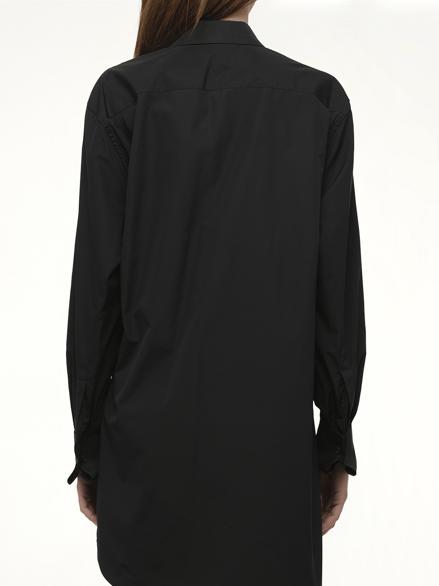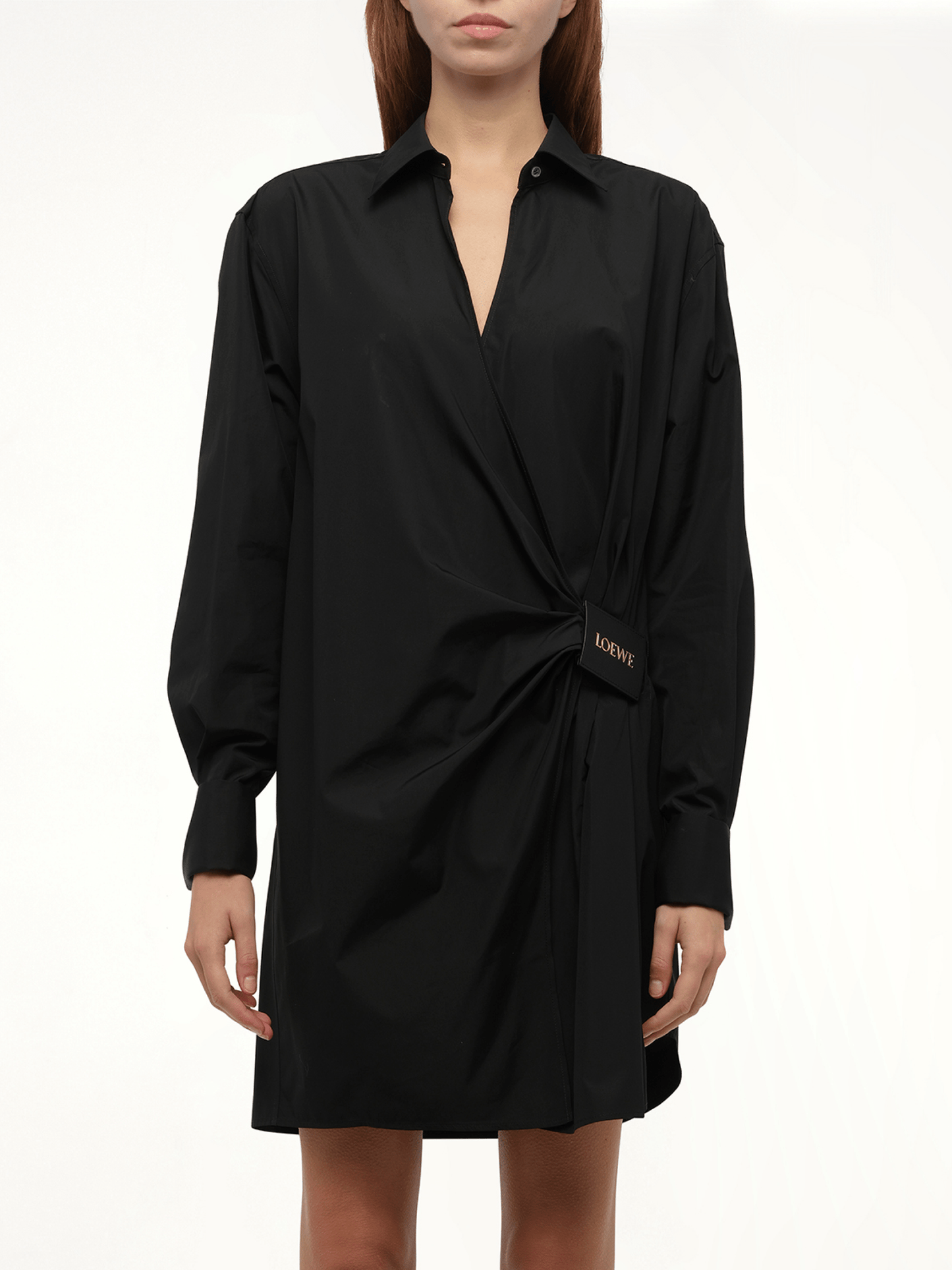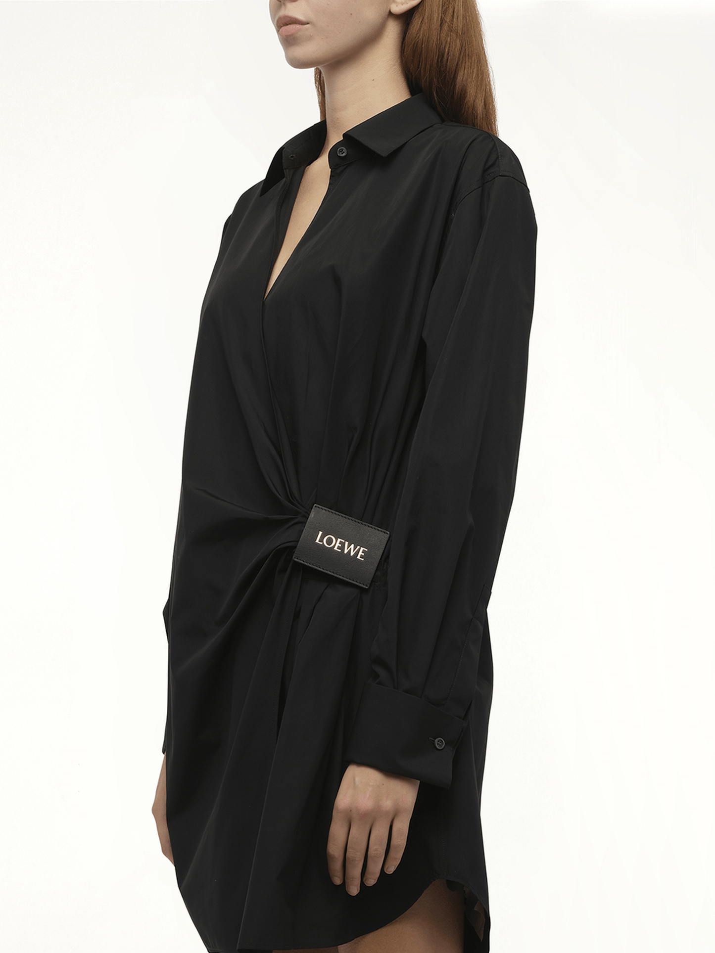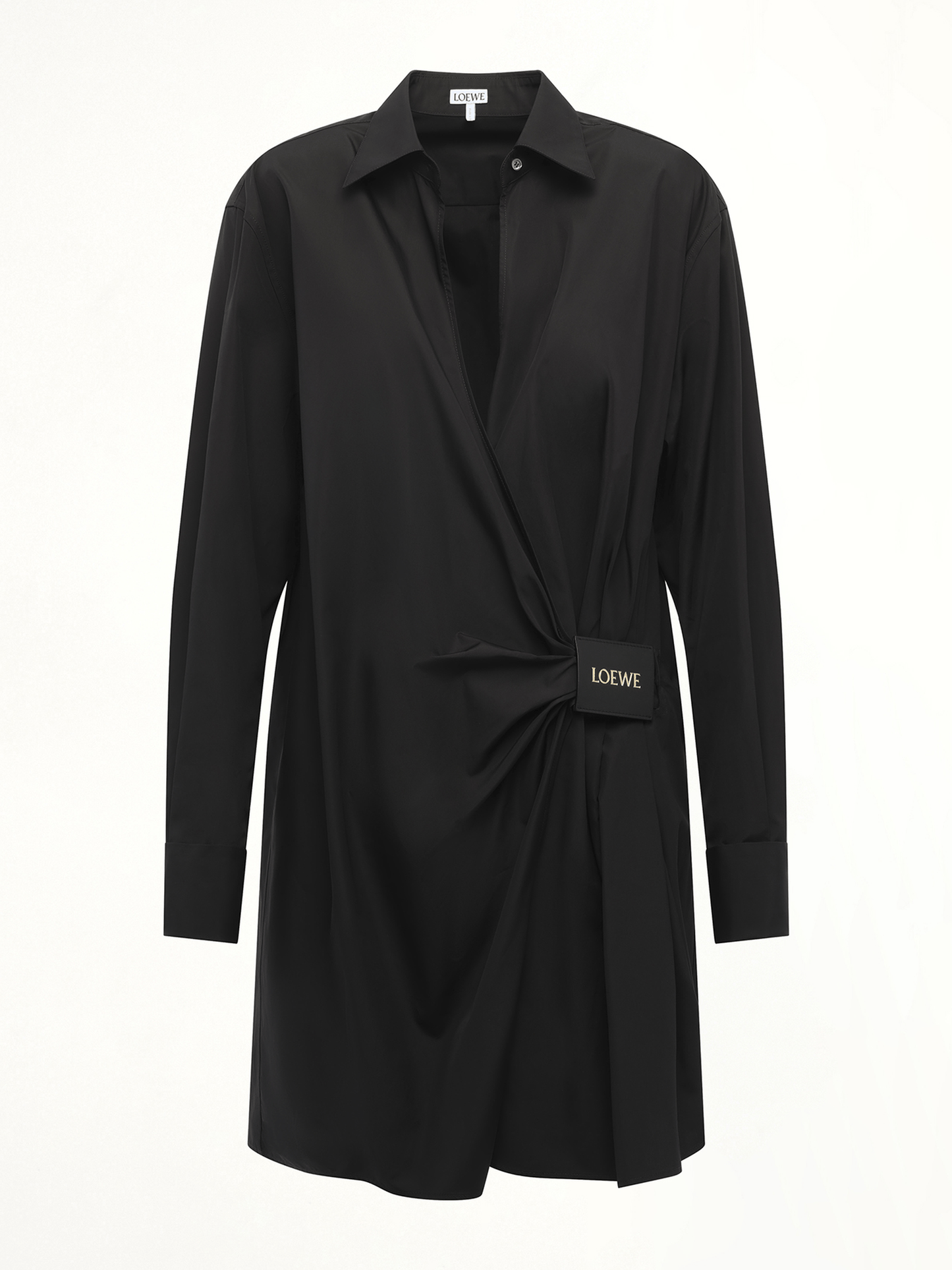 Loewe's Draped Shirt Dress in Black, a modern take on a classic shirt dress with flowing, dramatic draping for an elegant silhouette. This versatile piece offers a polished yet relaxed vibe, ideal for layering or wearing on its own.