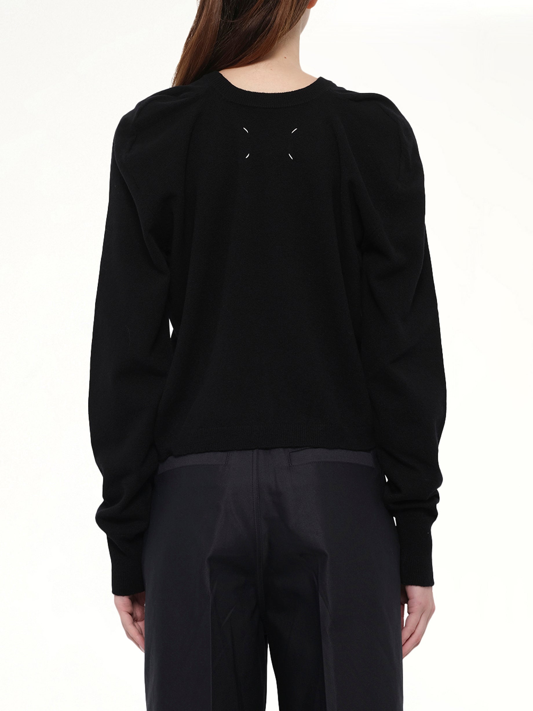 Maison Margiela's Gauge 14 Gathered Sweater in Black is a sophisticated piece that combines modern design with timeless elegance. This sweater features a unique gathered detail that adds texture and depth to its classic silhouette.