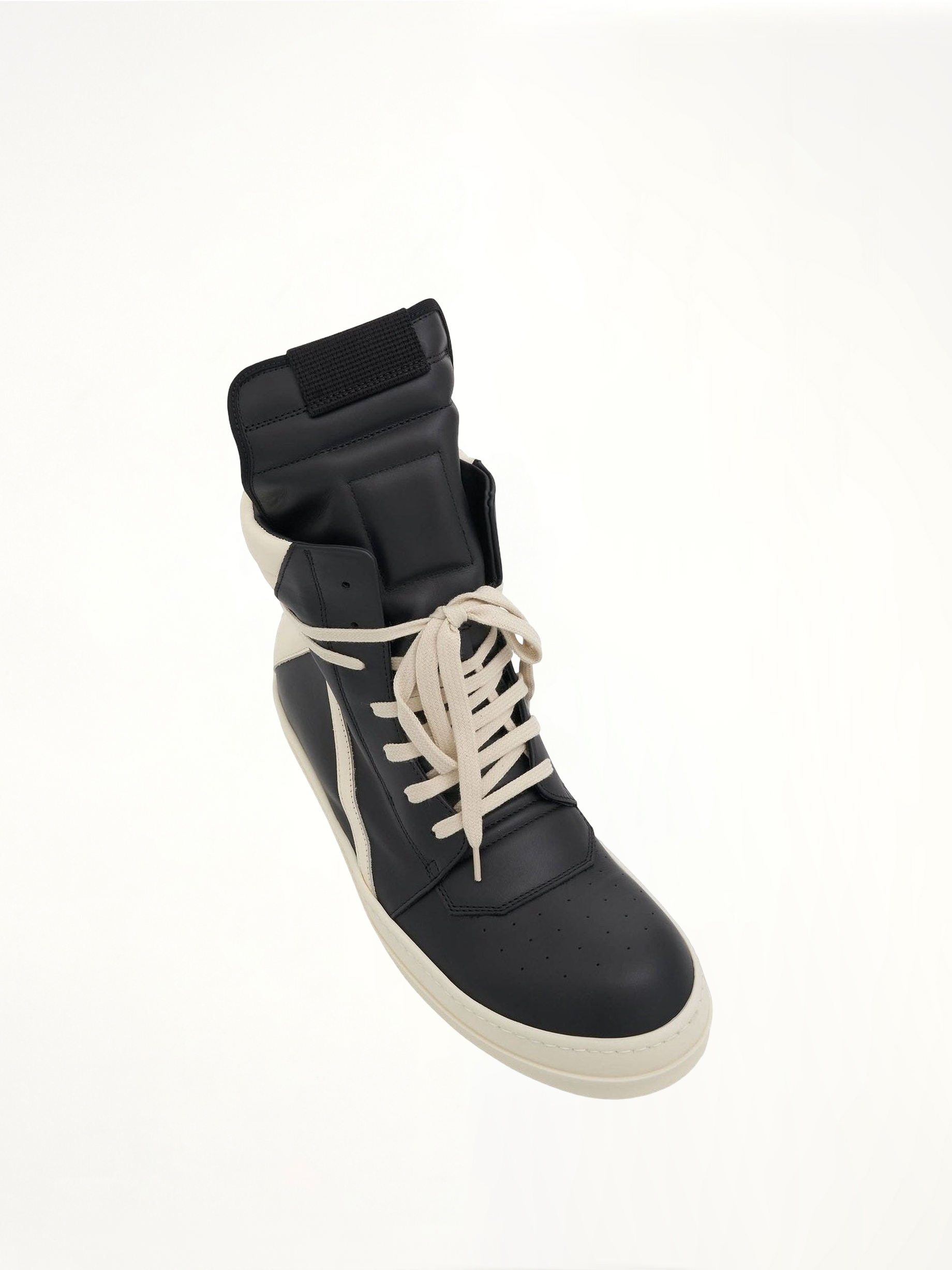 Geobasket sneakers are an eccentric staple from the label's latest drop. Premium leather uppers in a black and milk colourway with dramatic soles with thick tread for added traction.