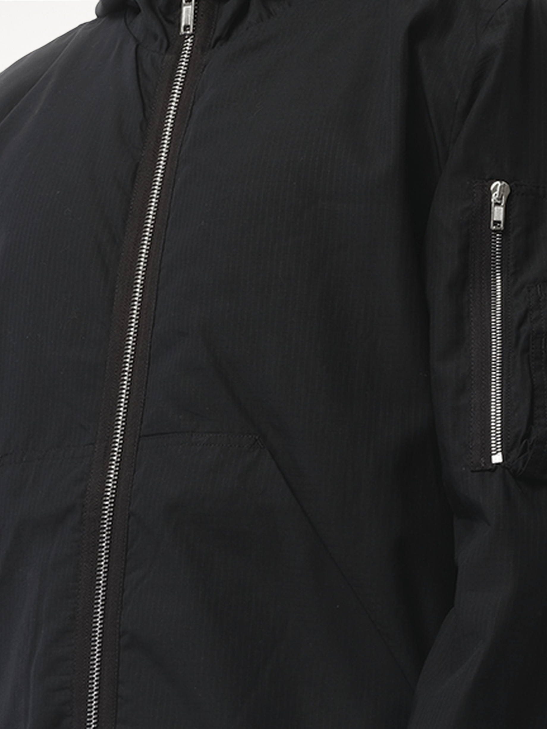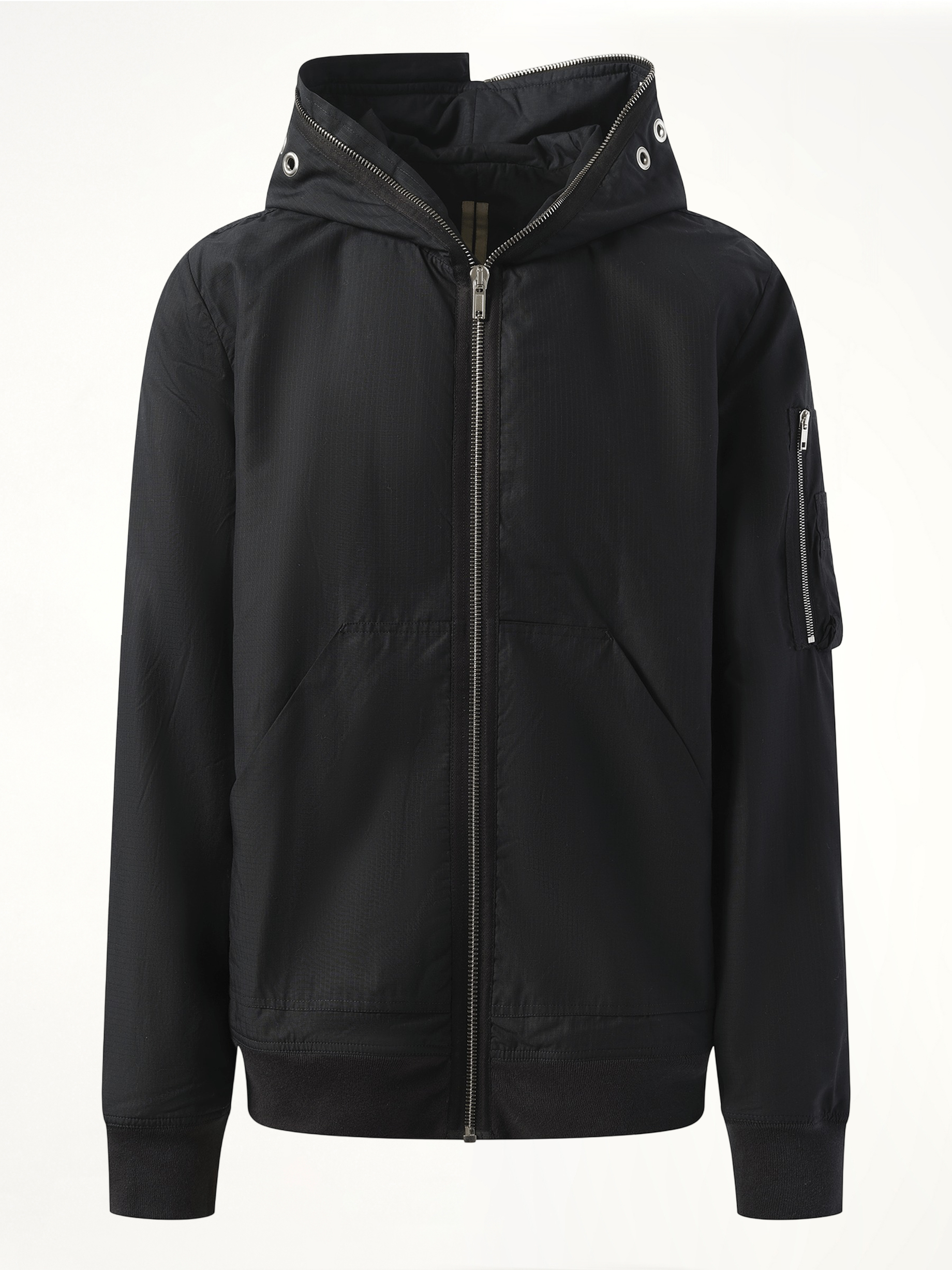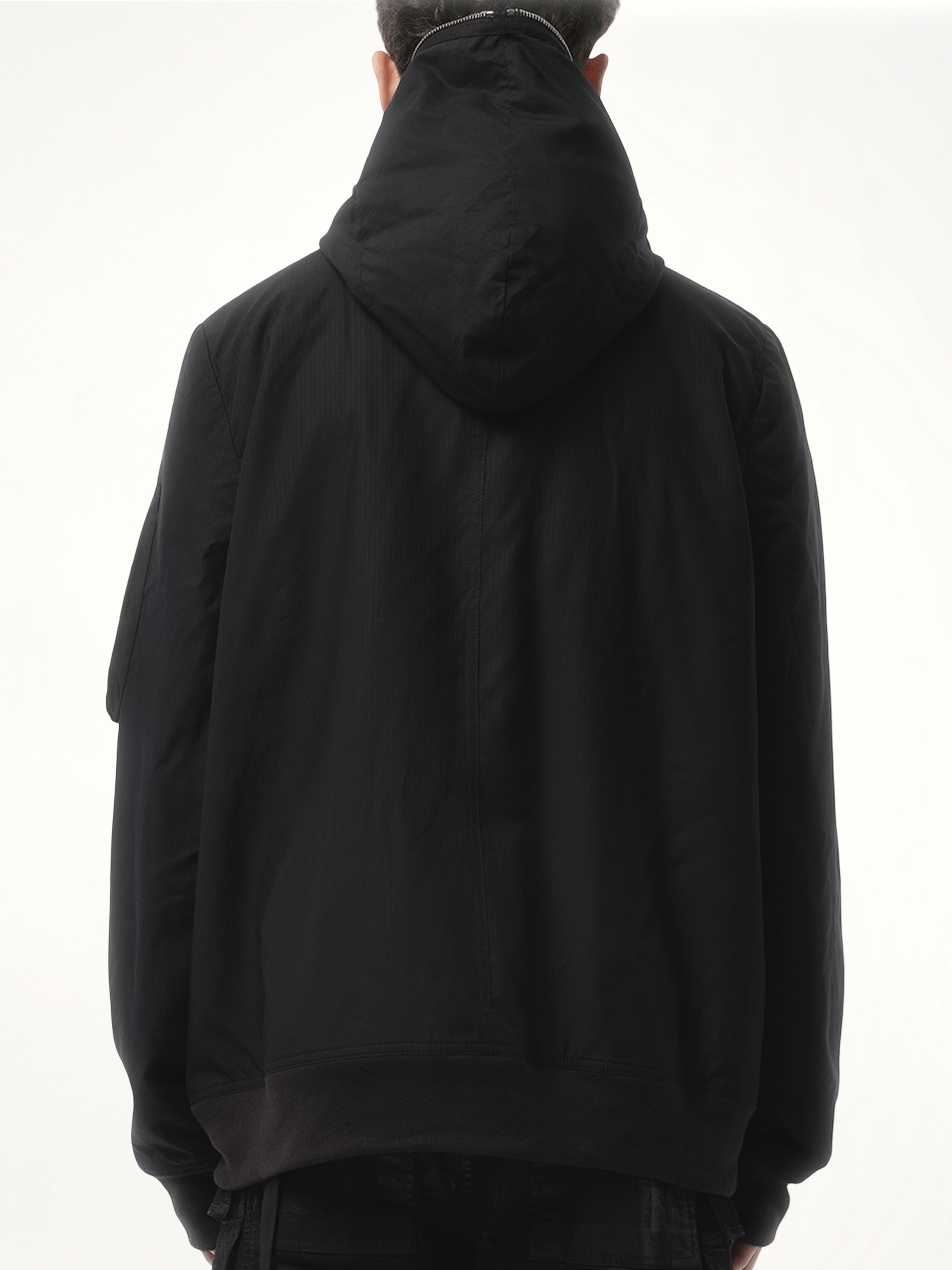 The Rick Owens DRKSHDW Gimp Flight Bomber Jacket in Black combines functional design with a touch of avant-garde style. This jacket features a regular fit, long sleeves, and a front zip fastening with a slouchy hood. The jacket also includes practical storage with two side patch pockets and a zip pocket on the sleeve.