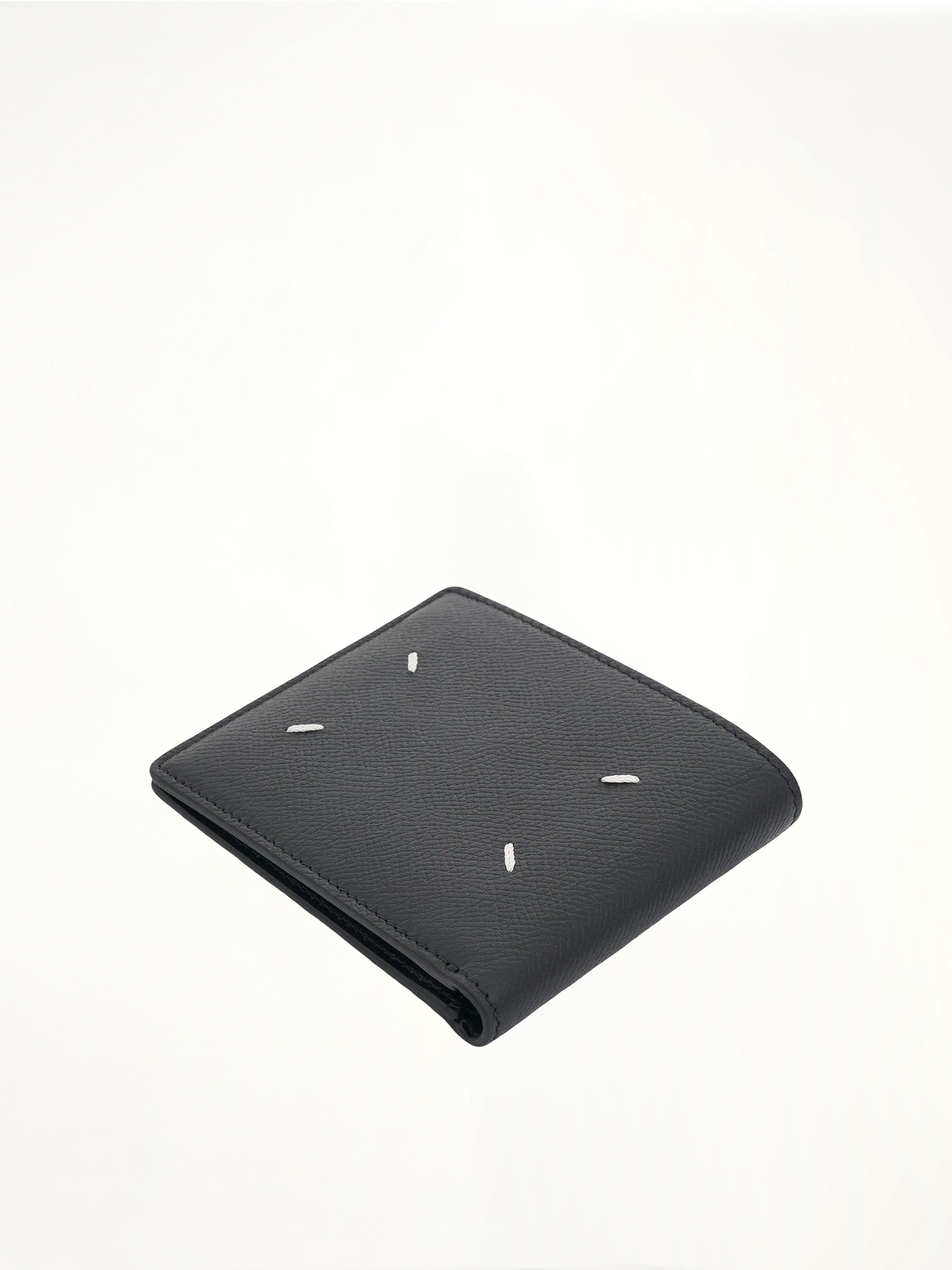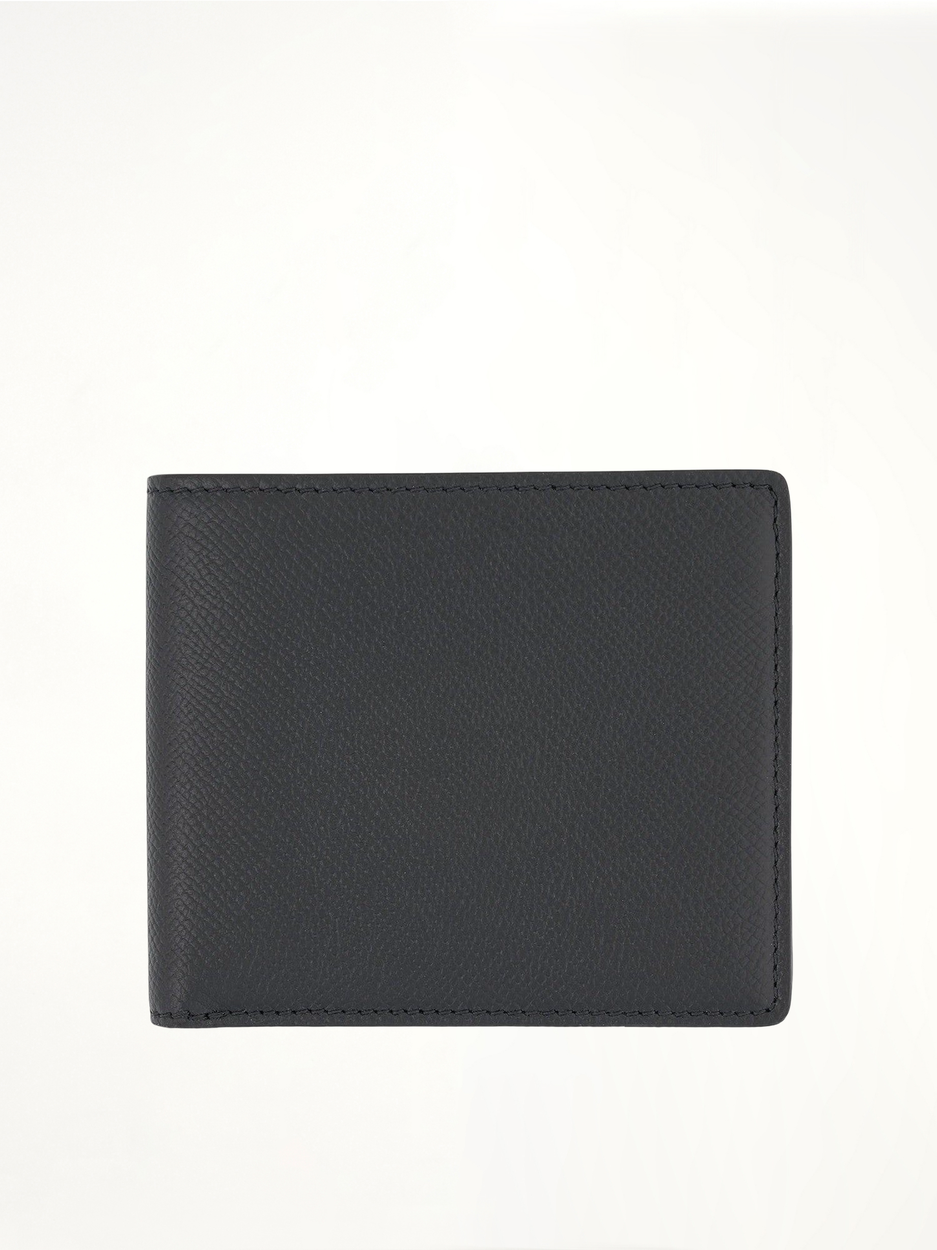 Grained slim bi-fold wallet in black with leather construction and brand’s signature four-stitch logo