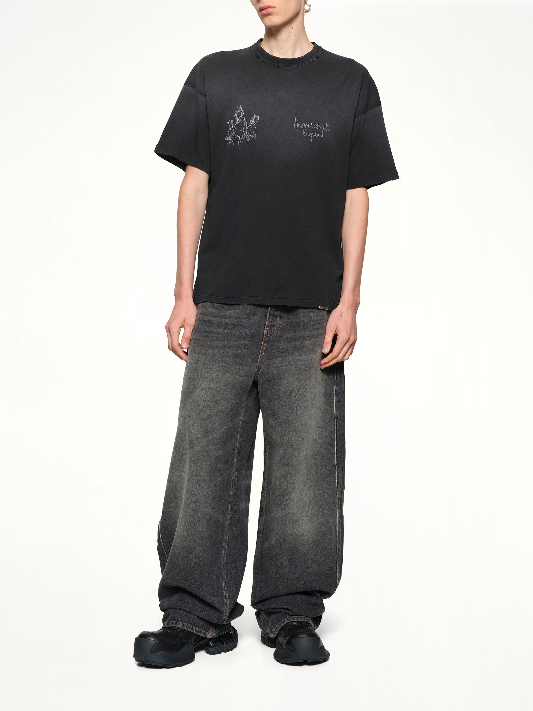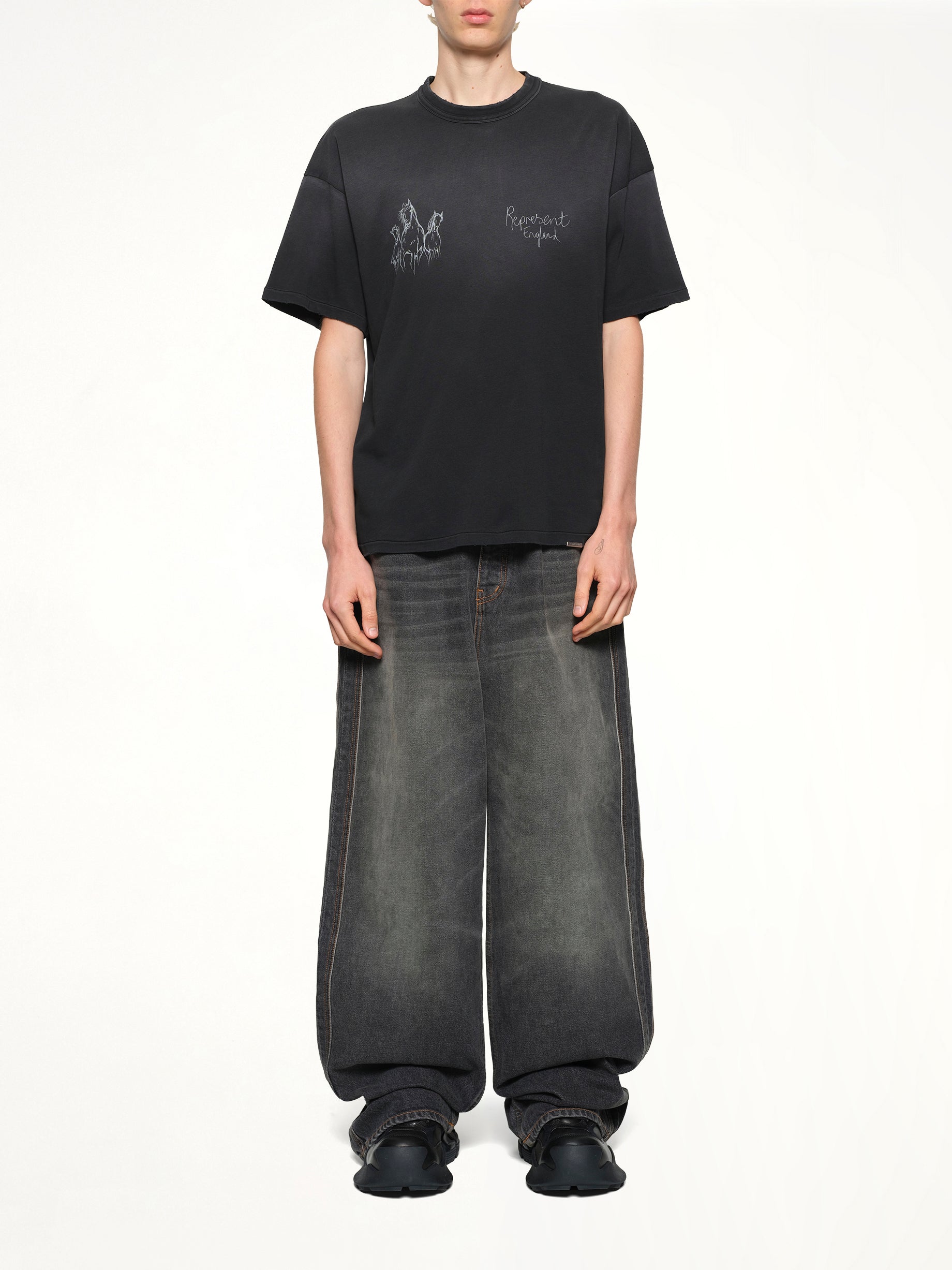 Represent's Hand Drawn Thoroughbred Horse T-Shirt in Aged Black is a unique piece that combines artistic flair with casual style. This t-shirt features a detailed hand-drawn design that captures the elegance of a thoroughbred horse.