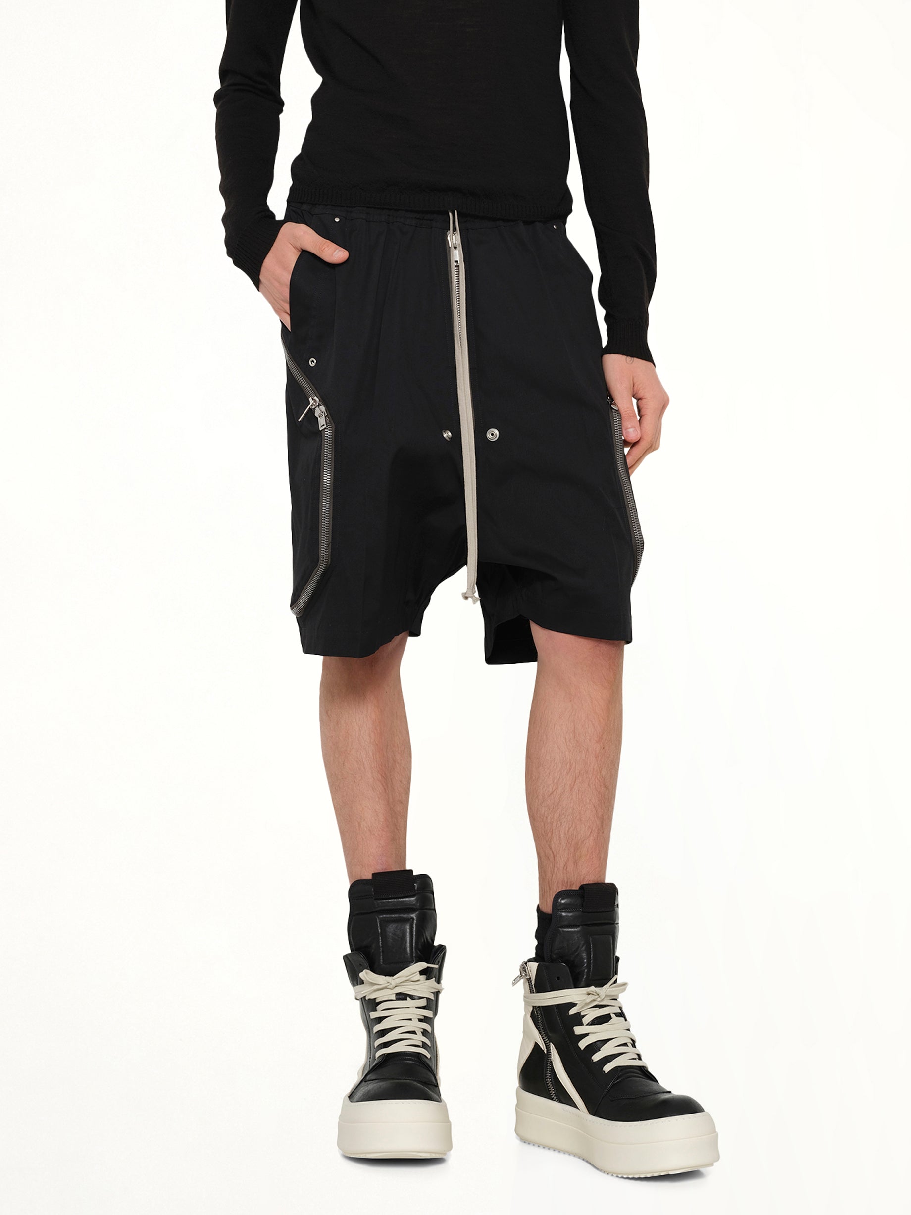 Rick Owens's Heizer Bela in Black is a striking piece that embodies the designer's signature avant-garde aesthetic. This item is perfect for those who appreciate bold fashion statements and unique design elements.