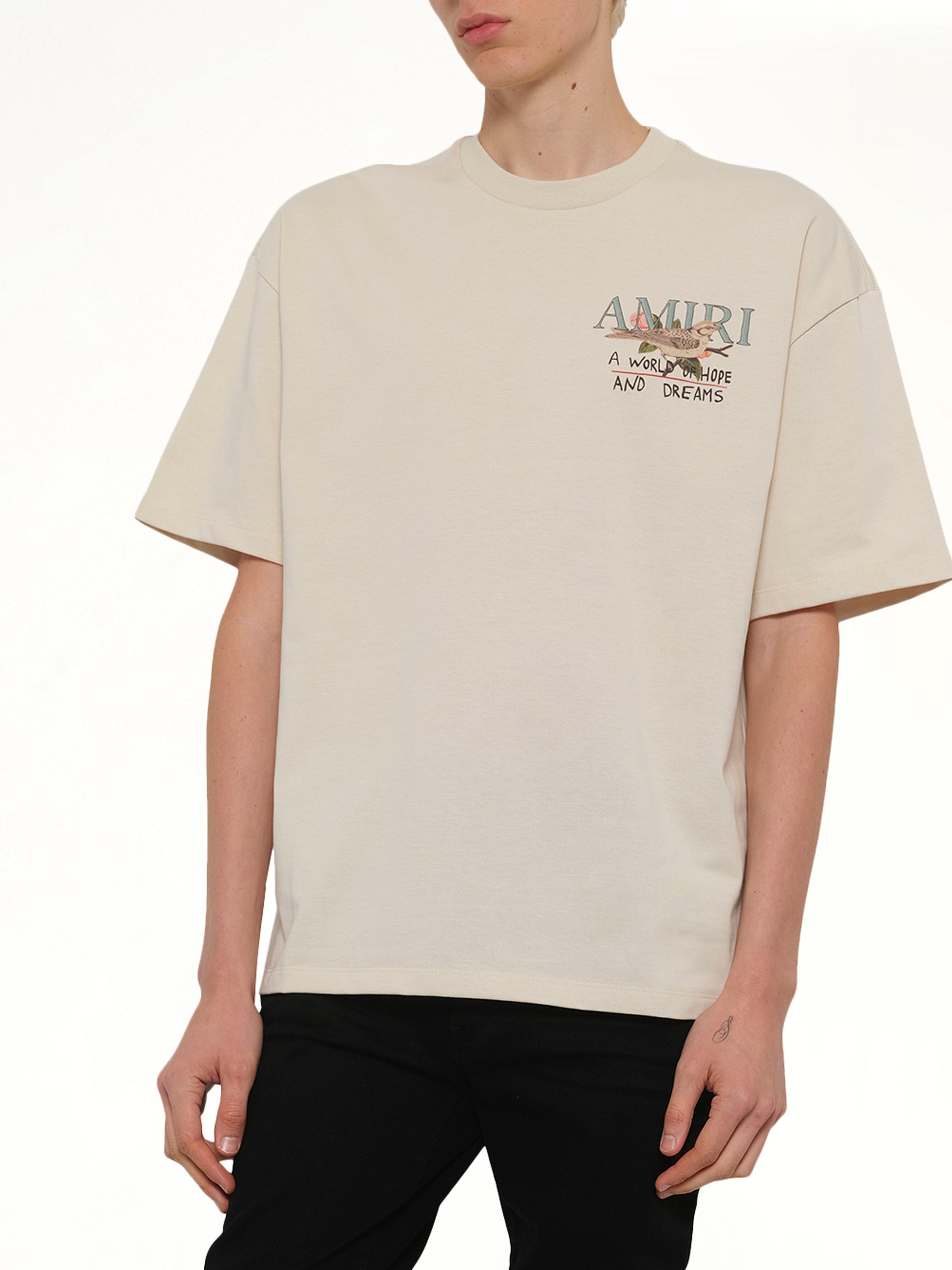 Amiri's Hope and Dreams Oversized T-Shirt in Alabaster is a stylish and comfortable addition to any wardrobe. This t-shirt offers a relaxed fit, perfect for casual outings or lounging at home.