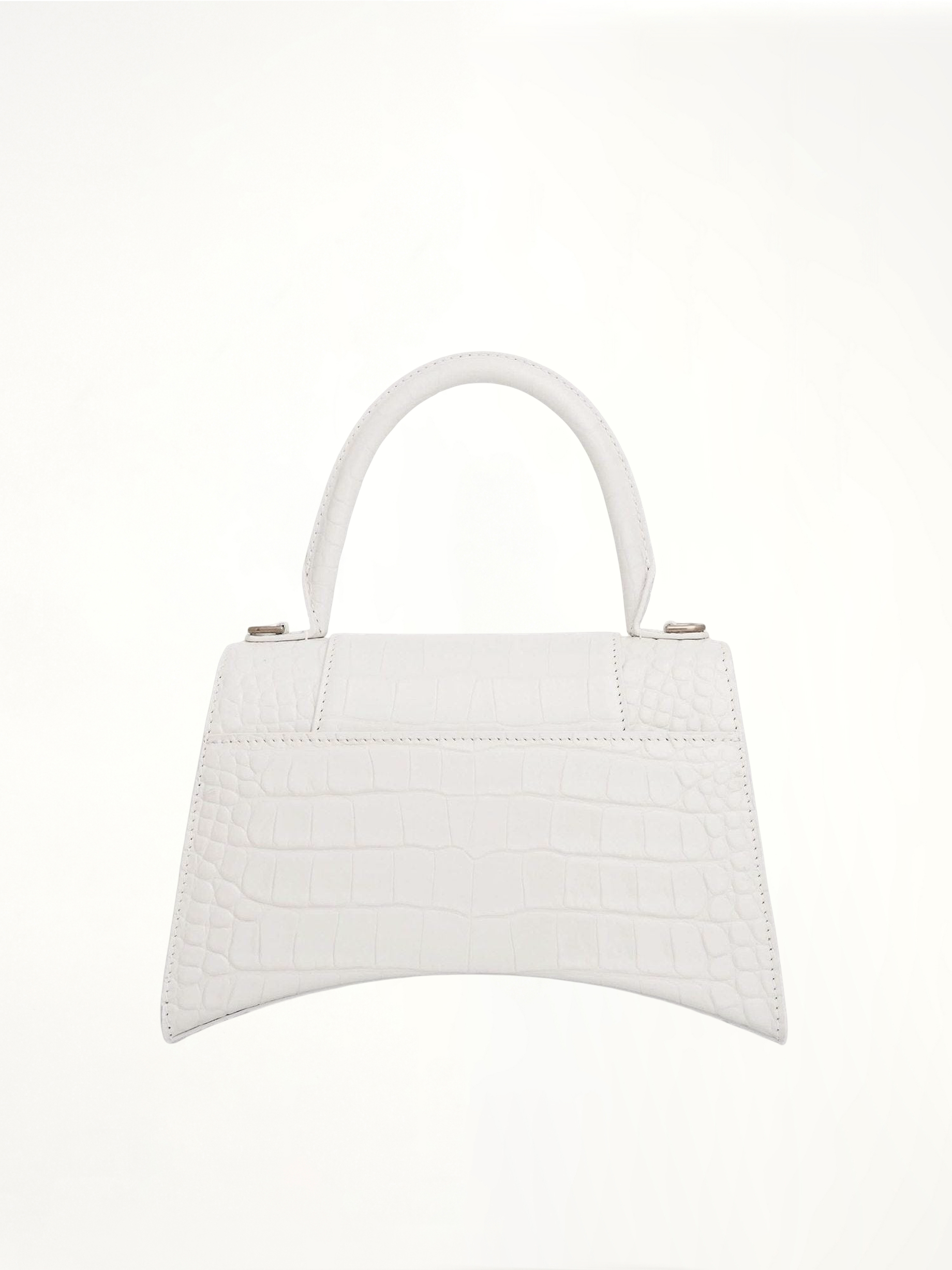 Hourglass small handbag crafted from shiny crocodile embossed calfskin; this bag exudes a luxurious appeal. Its hourglass shape and curvilinear base add a touch of elegance and create a visually striking silhouette.
