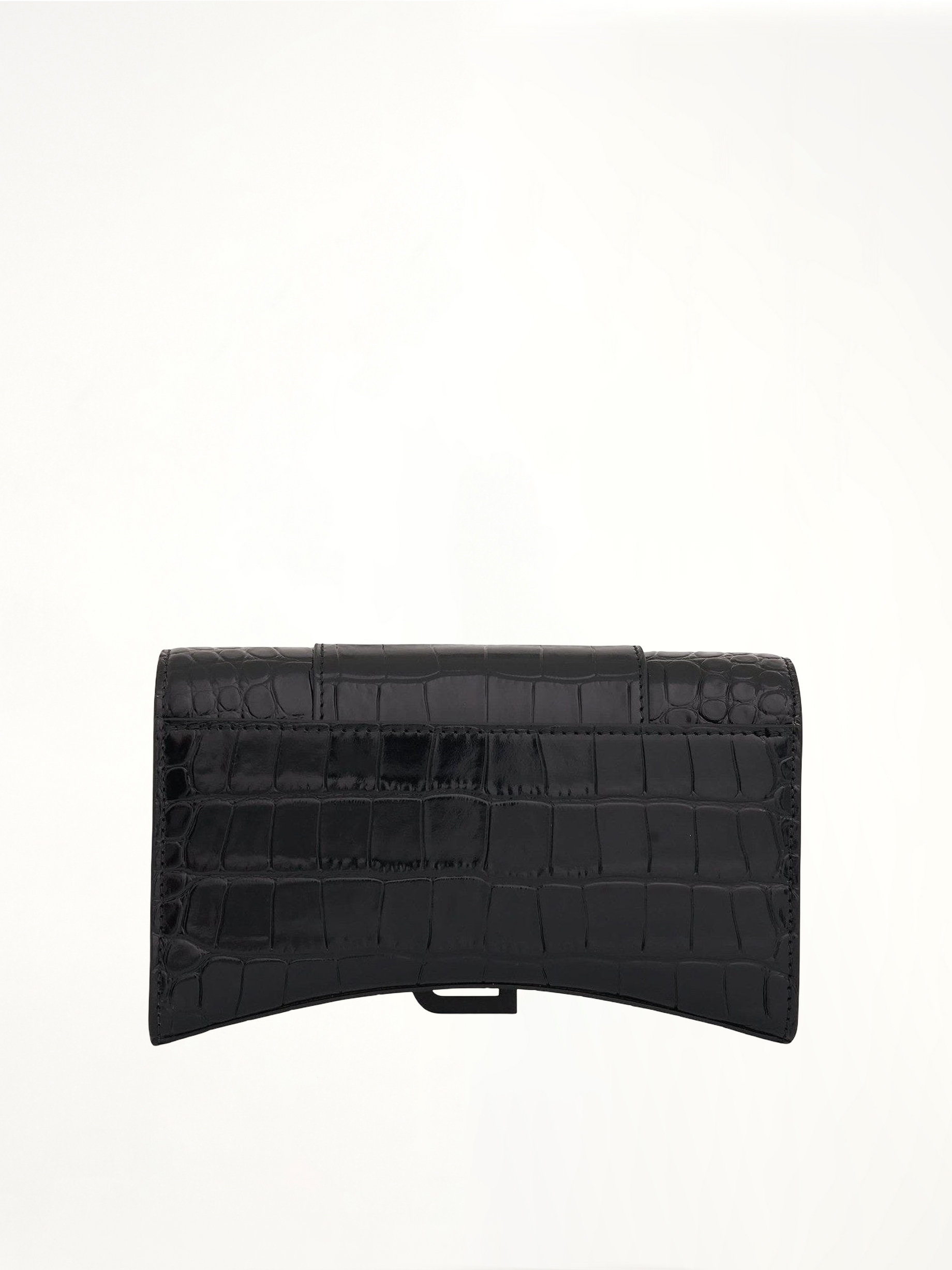 Hourglass wallet on chain in black shiny croco with magnetic fastening, chain-link shoulder strap, internal zip pocket, internal card slots and internal logo stamp