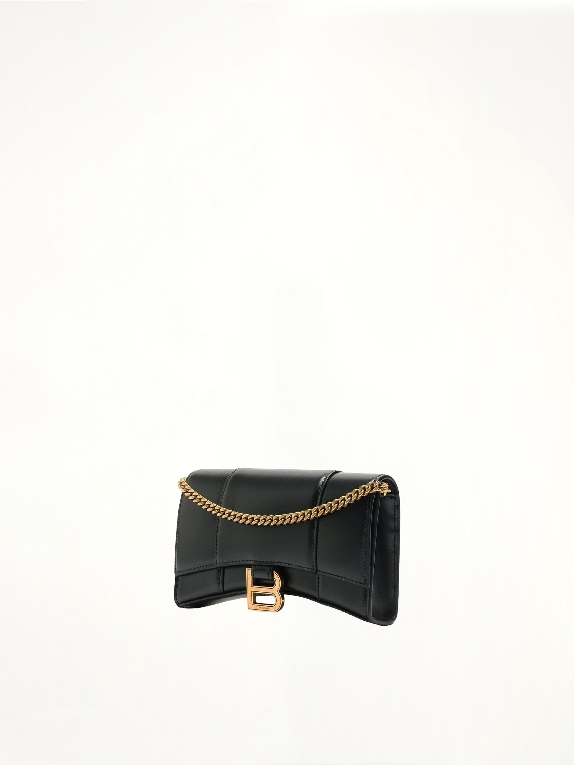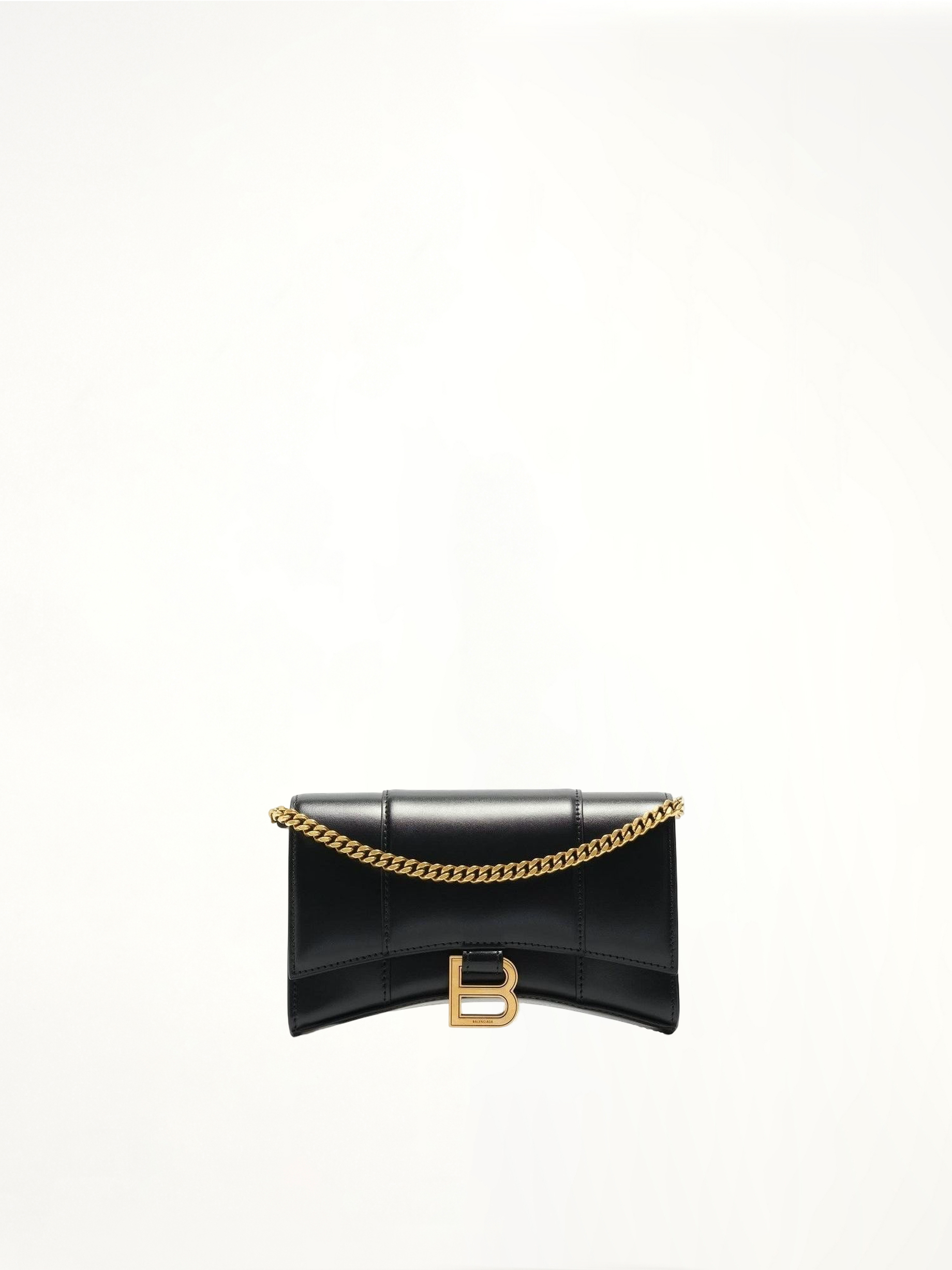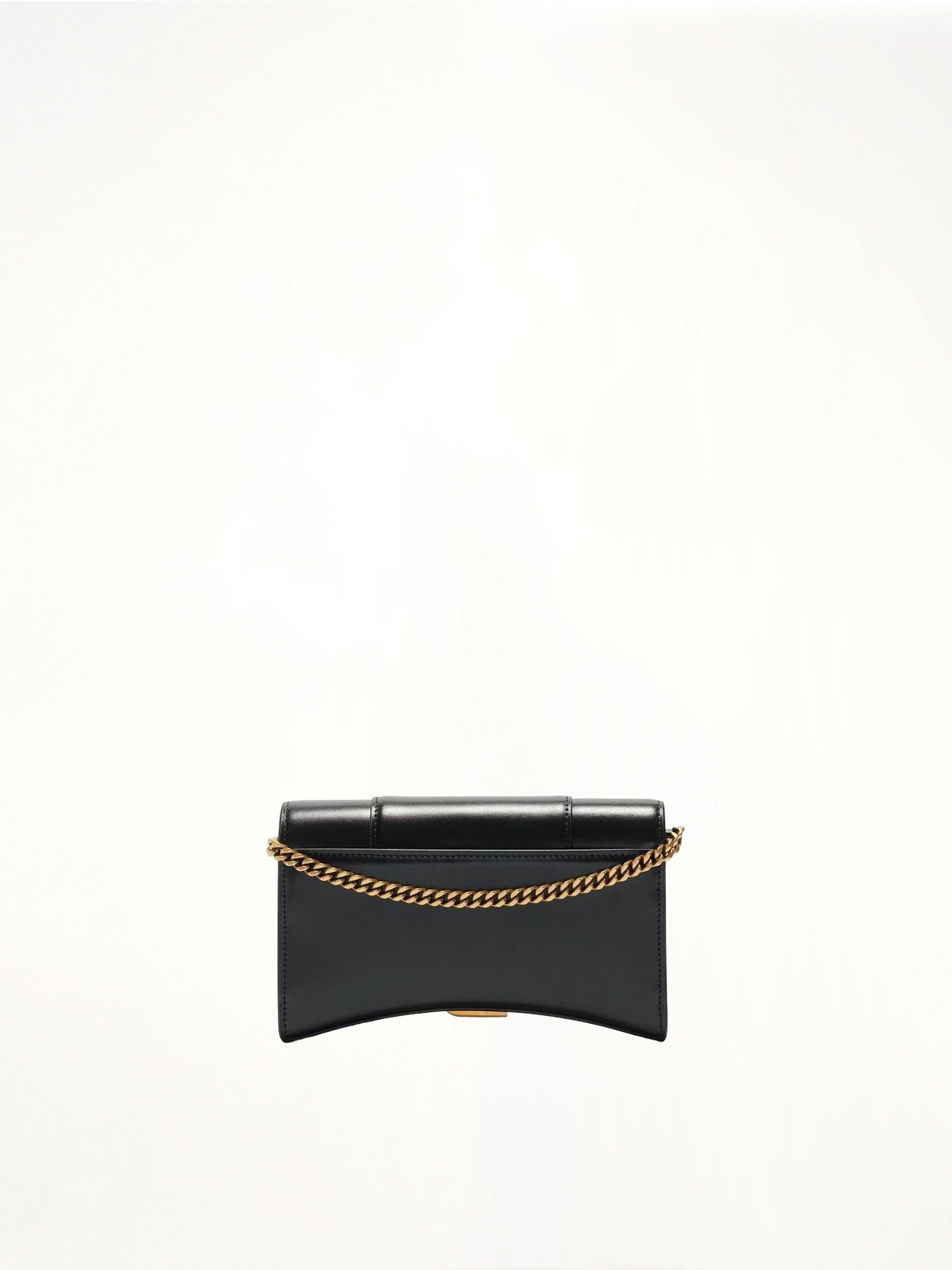The Hourglass Wallet On Chain in Black Smooth Leather is a timeless classic. Crafted from luxe, smooth leather, it is perfect for carrying all your essentials with ease and style. Its elegant shape and secure metal chain make this an ideal choice for any fashionista.
