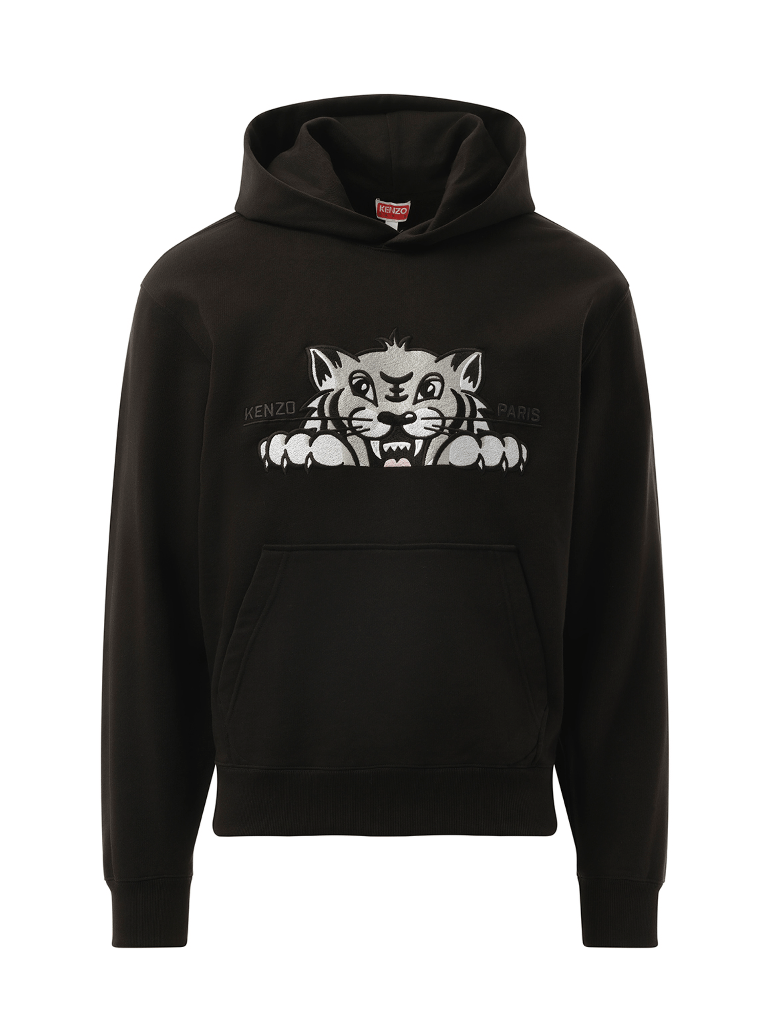 The Kenzo Happy Tiger Embroidered Classic Hoodie in Black features intricate tiger embroidery on a classic black hoodie. Made with high-quality materials, this hoodie offers both style and comfort. Perfect for adding a touch of luxury to any casual outfit.