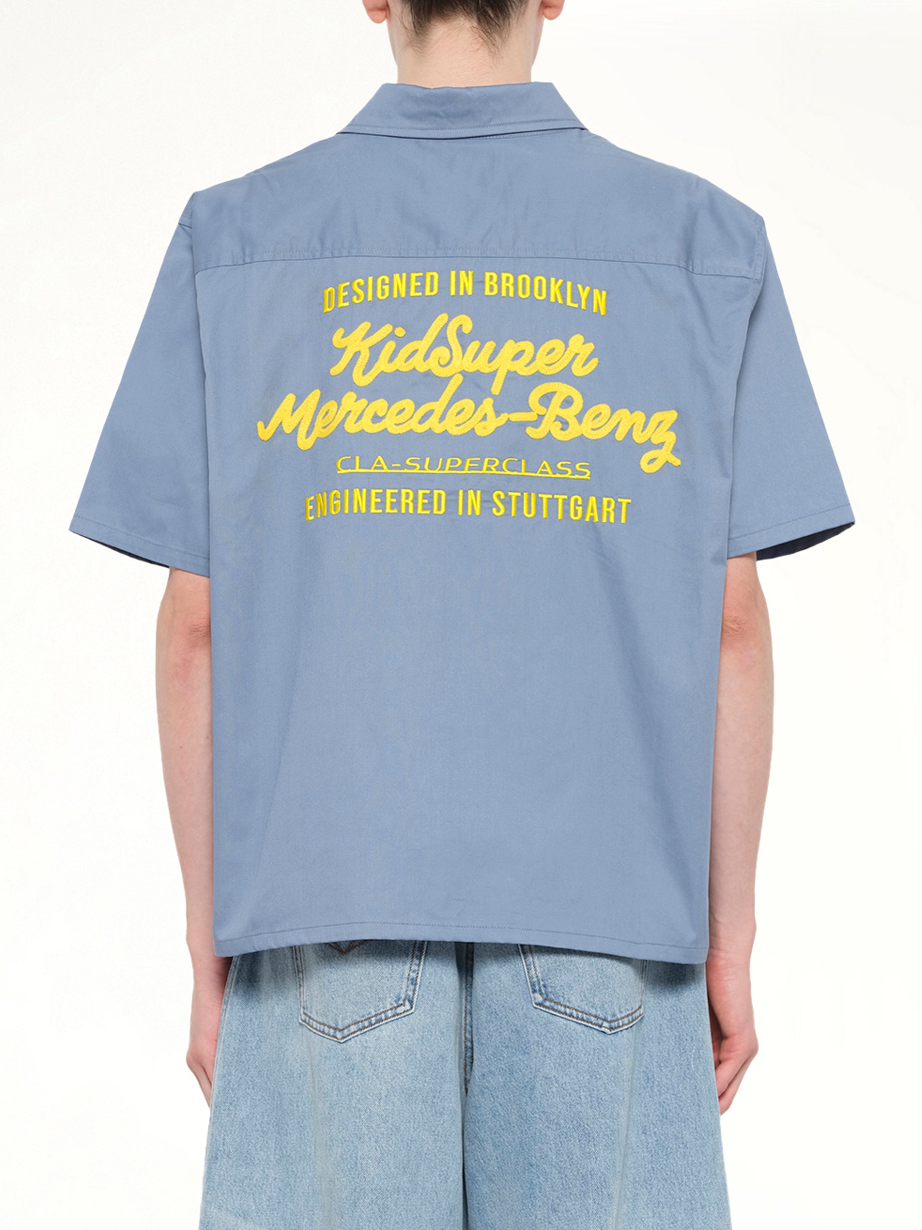 KidSuper x Mercedes Benz's Kidsuper X Mercedes Benz Cropped Work Shirt in Blue is a stylish and unique collaboration piece. This shirt combines the creative flair of KidSuper with the iconic branding of Mercedes Benz.
