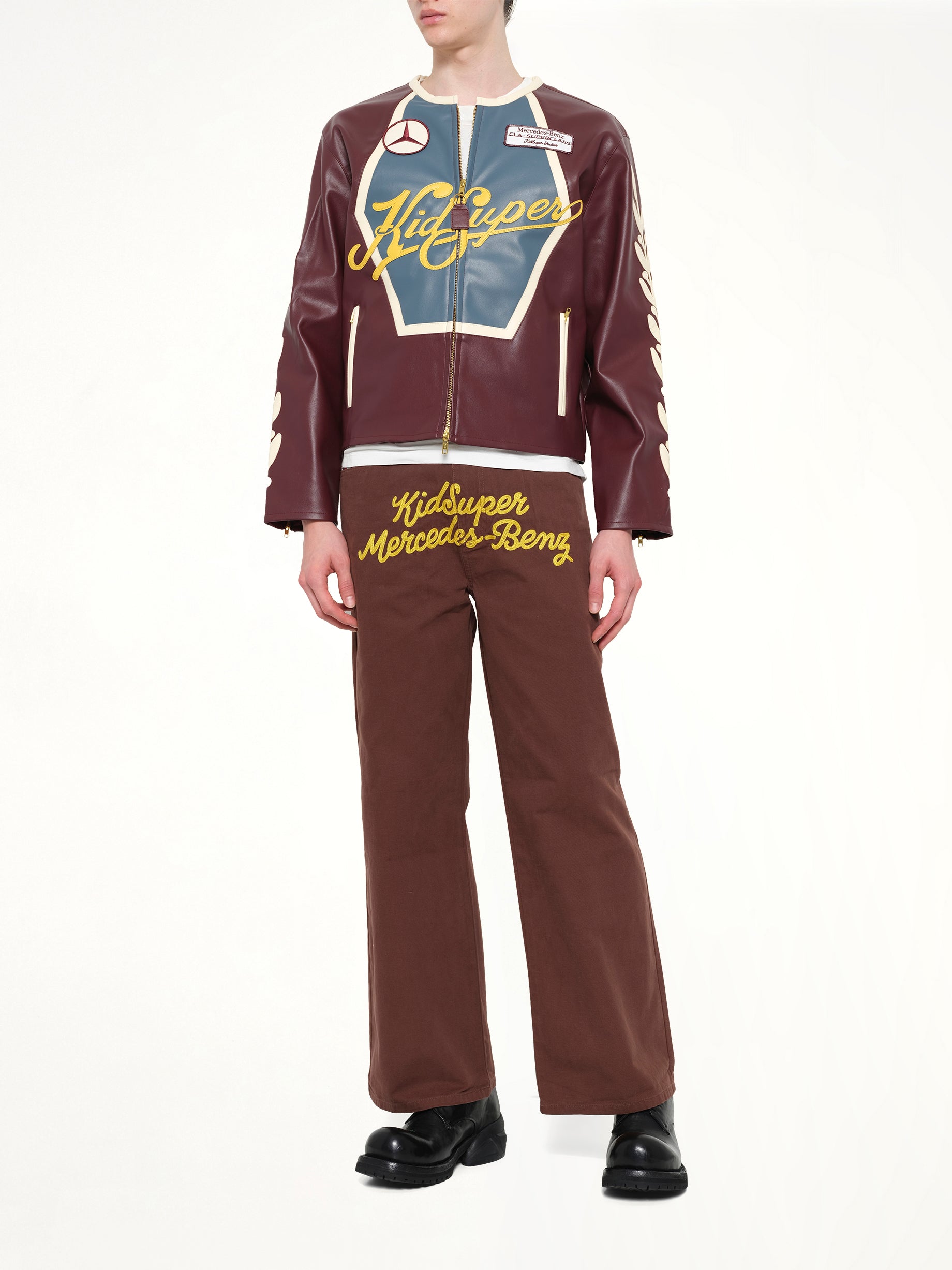 KidSuper x Mercedes Benz's Kidsuper X Mercedes Benz Racer Jacket in Burgundy is a stylish collaboration piece that combines automotive heritage with contemporary fashion. This jacket is perfect for those who appreciate unique design and high-quality craftsmanship.