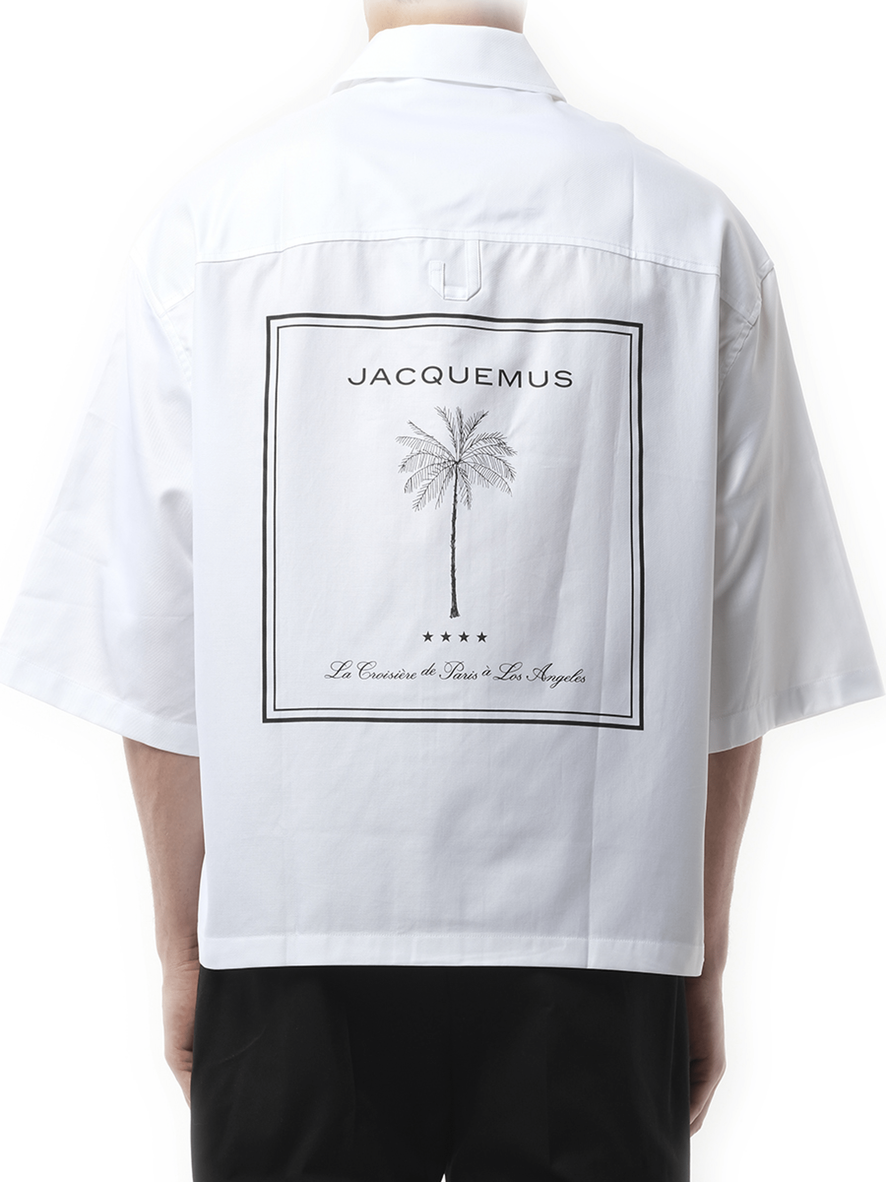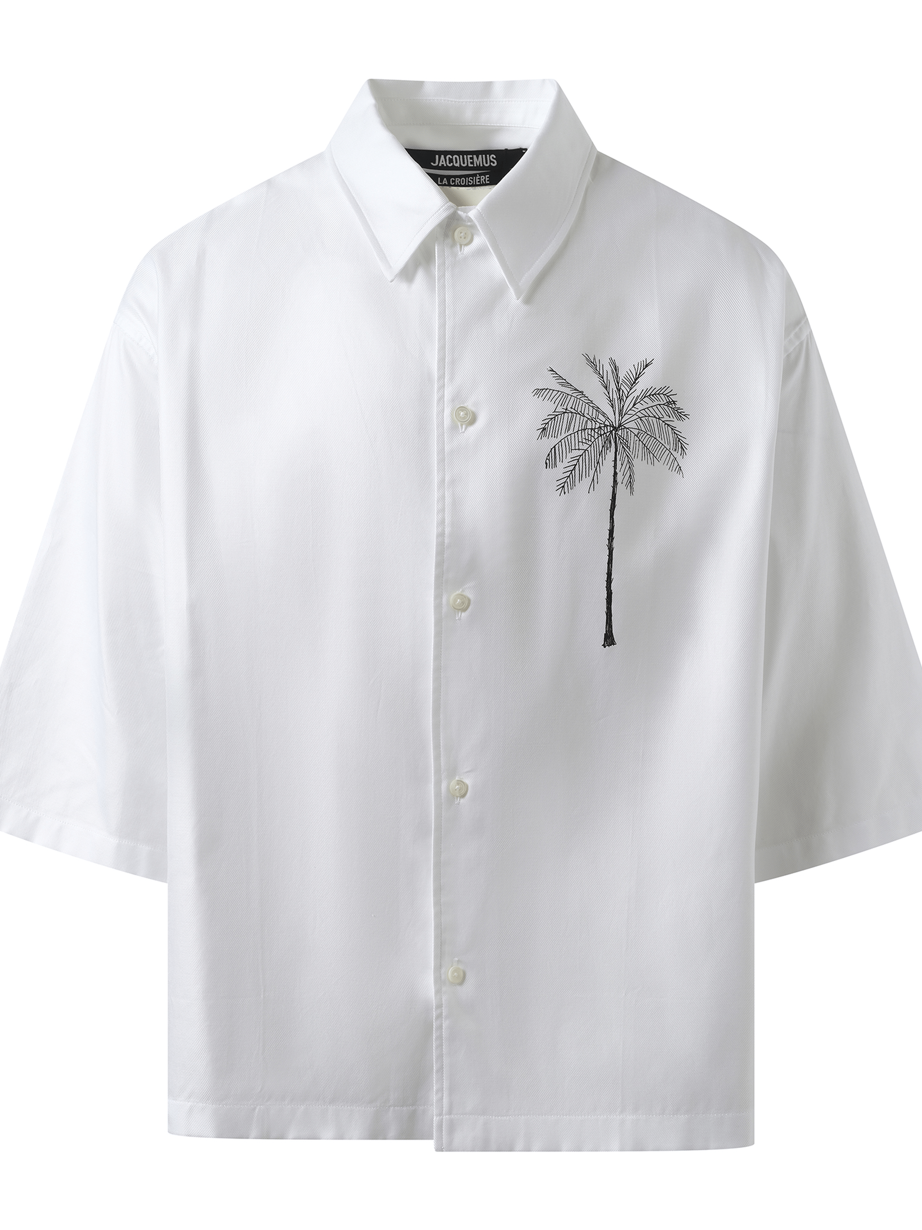 Jacquemus' La Chemise Aloe Palm Tree in White/Black, crafted from lightweight cotton with an eye-catching palm tree print, offering a modern, tropical flair. This shirt features a relaxed fit, long sleeves, and a button-down closure, creating a laid-back yet stylish look.