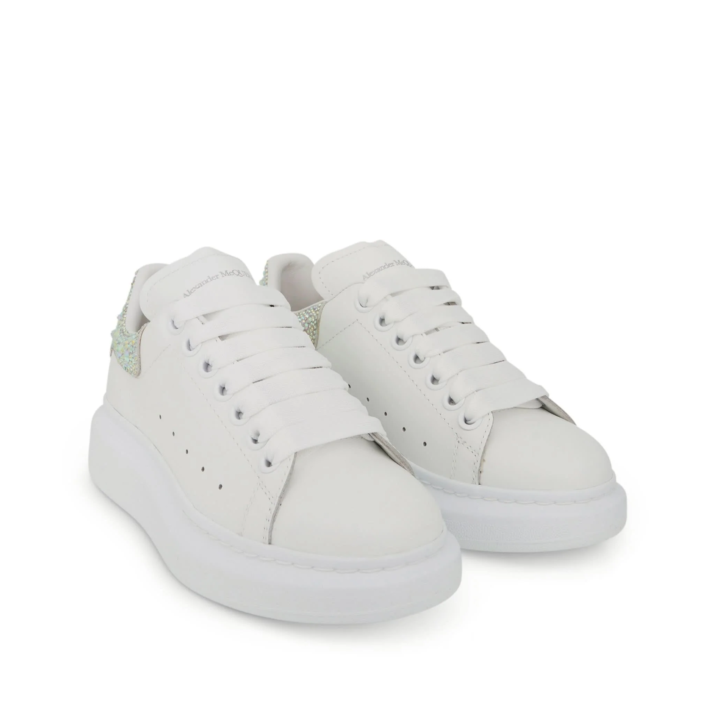 Larry oversized heel sneaker in white/white/crystal in white/crystal smooth calf leather lace-up sneaker with rounded toe and trimmed with crimson red suede heel detail. Large flat laces and Alexander McQueen signature on tongue and heel counter.