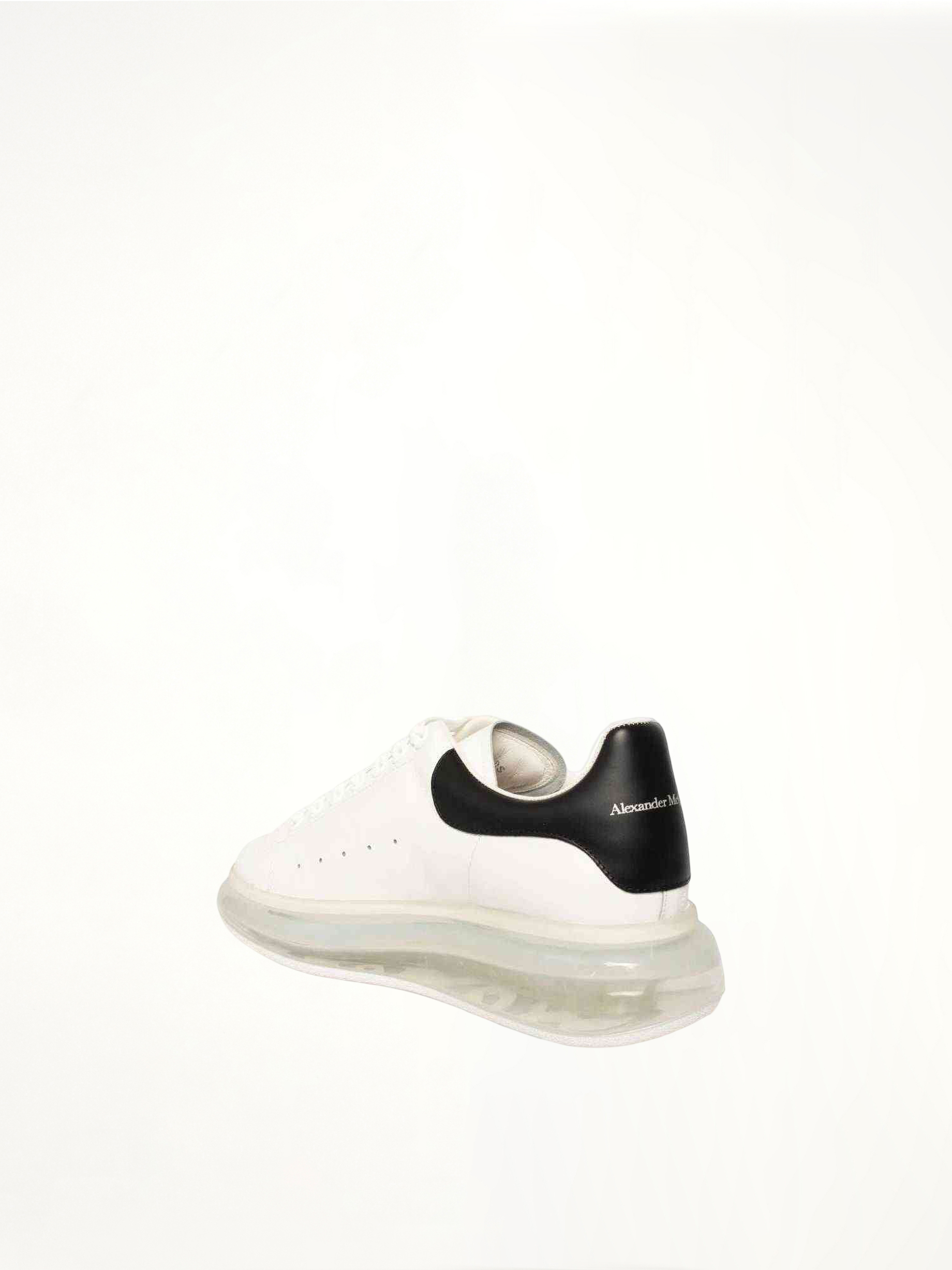 Alexander McQueen Larry white calf leather lace-up sneaker featuring a transparent oversized sole and black calf leather heel detail with an Alexander McQueen signature on the tongue and heel counter. Enjoy the perfect blend of style, comfort, and luxury with every step.
