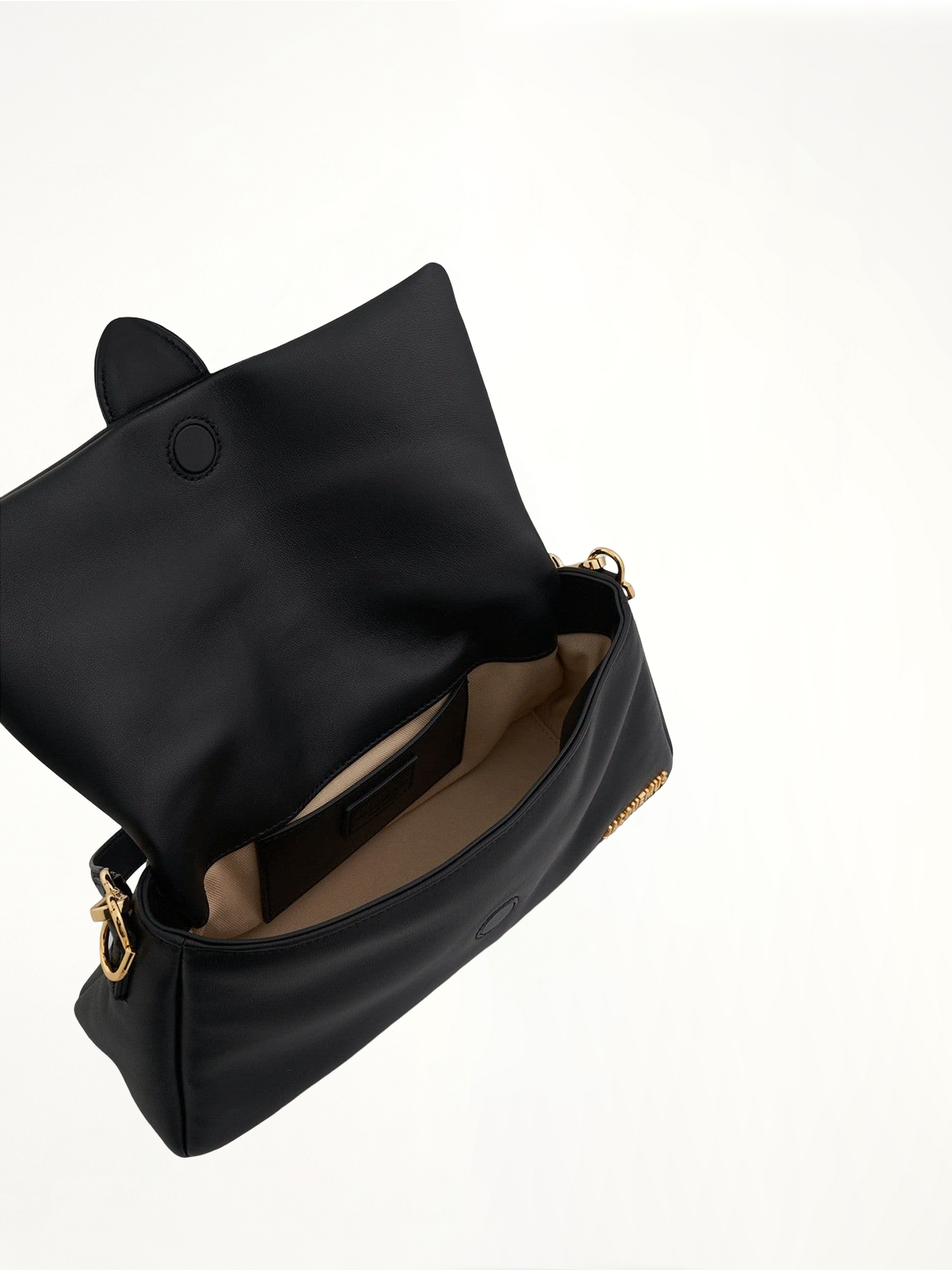 - Gold metal logo and hardware