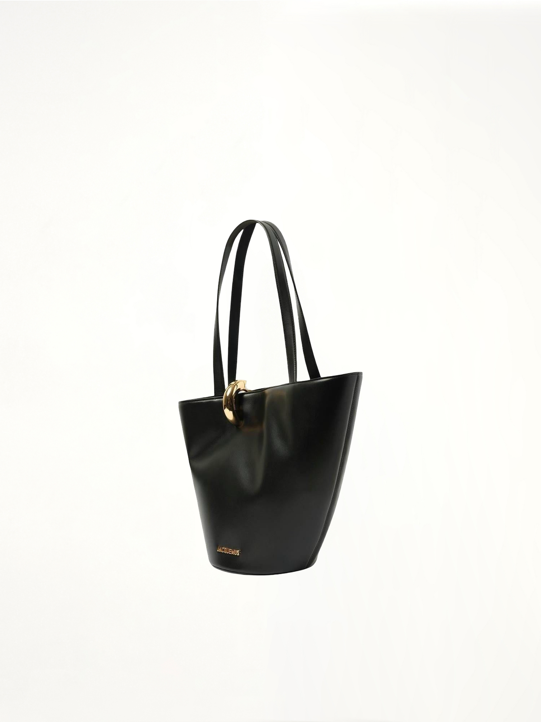 Jacquemus's Le Bambola Moyen in Black, an asymmetric bucket bag made from smooth cow leather with double top handles and a removable shoulder strap for easy carrying.