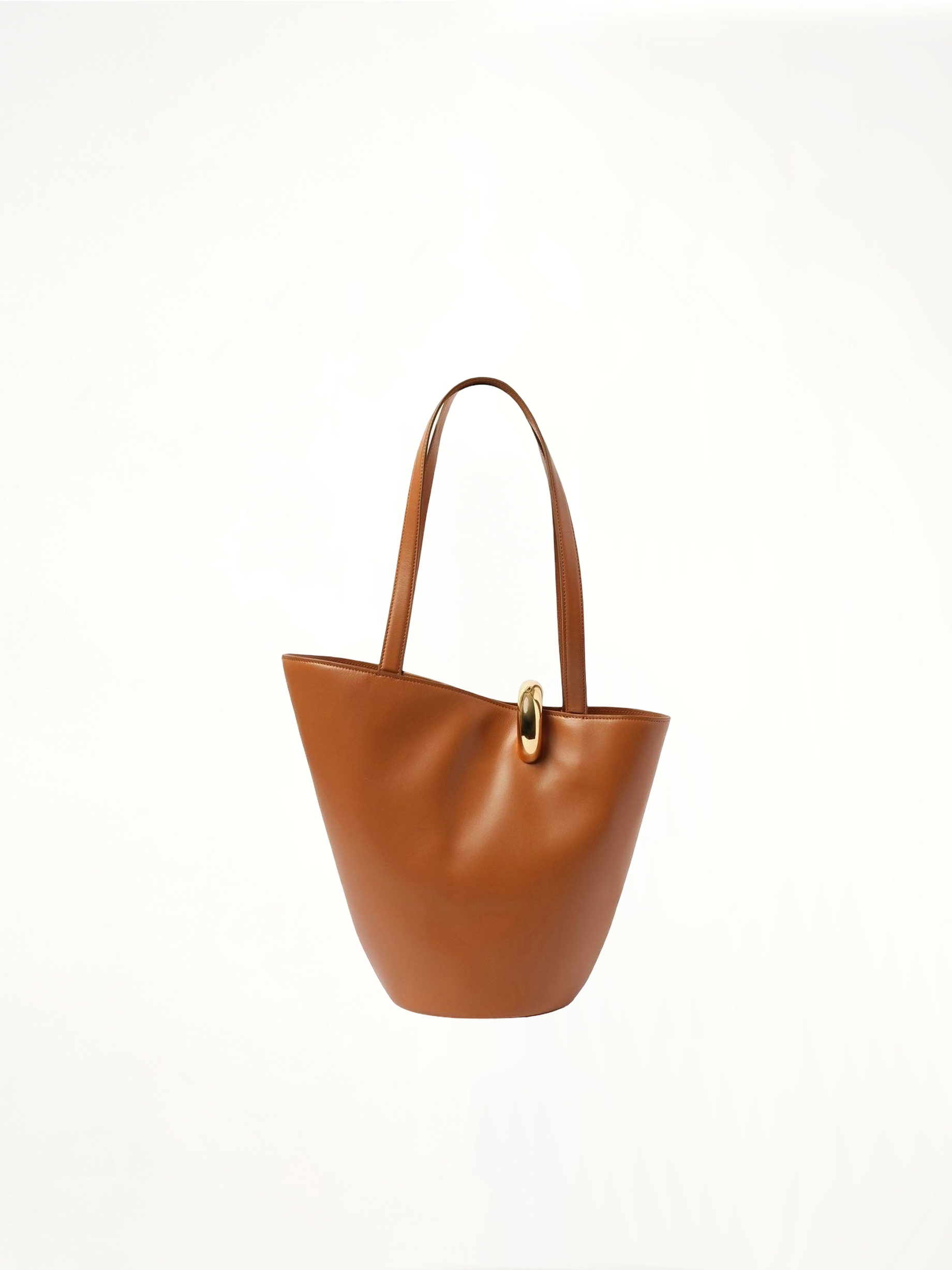 Jacquemus' Le Bambola Moyen in Light Brown is a sculptural, asymmetric bucket bag crafted from smooth calf leather. This medium-sized tote features double top handles and a removable shoulder strap, offering versatile carrying options. The gold-tone ring clasp and logo plaque add a refined finish to its minimalist silhouette.