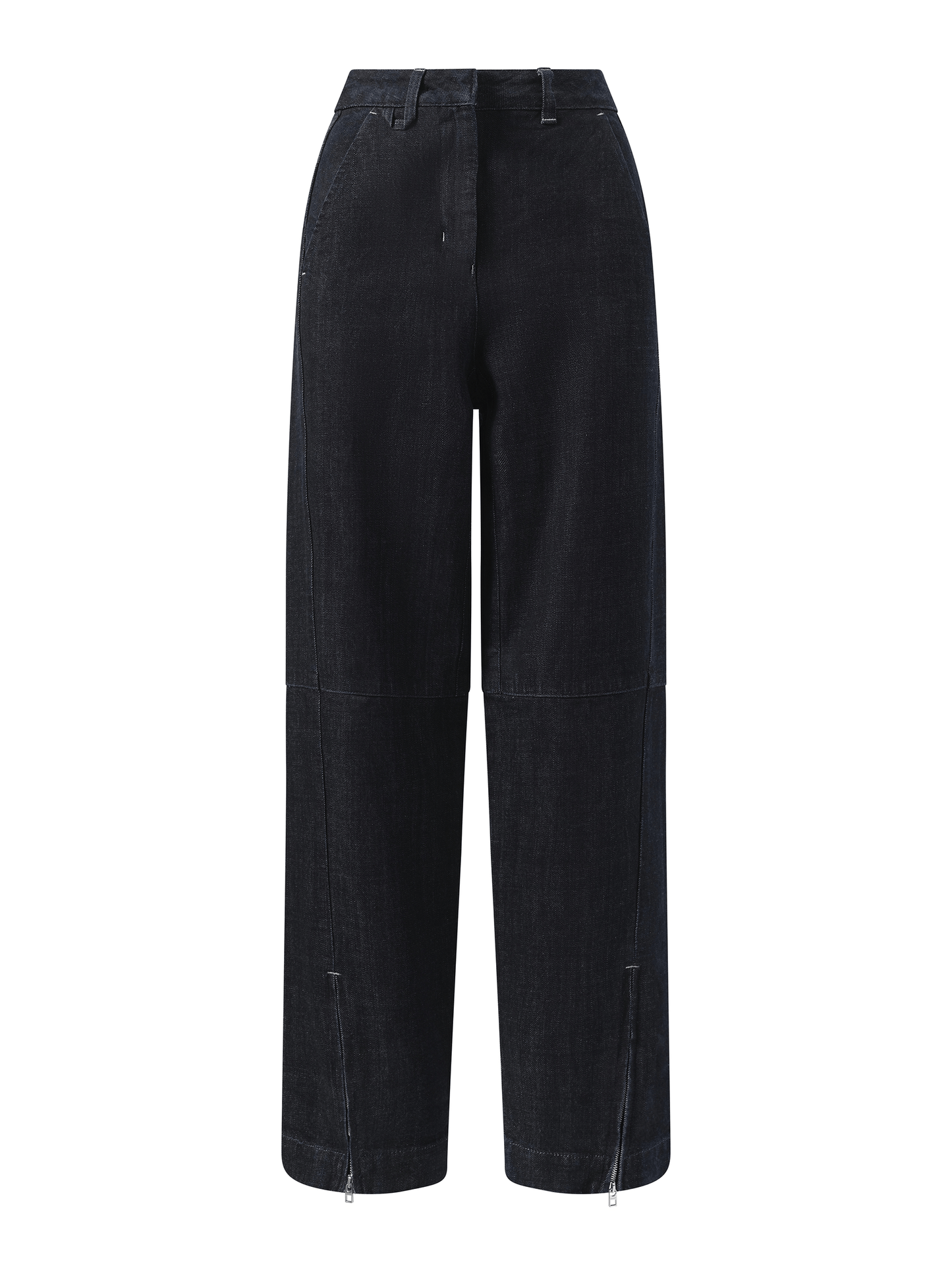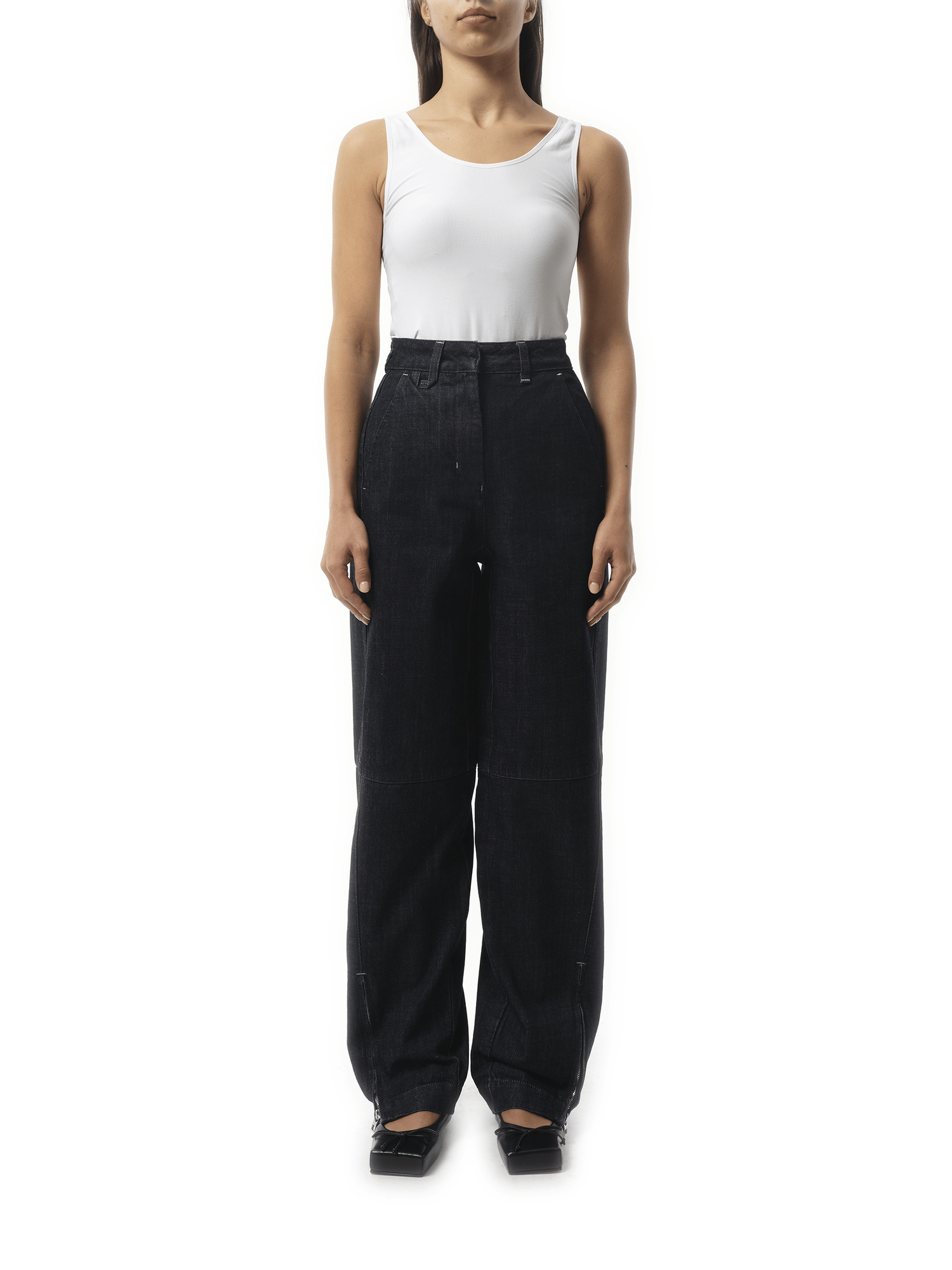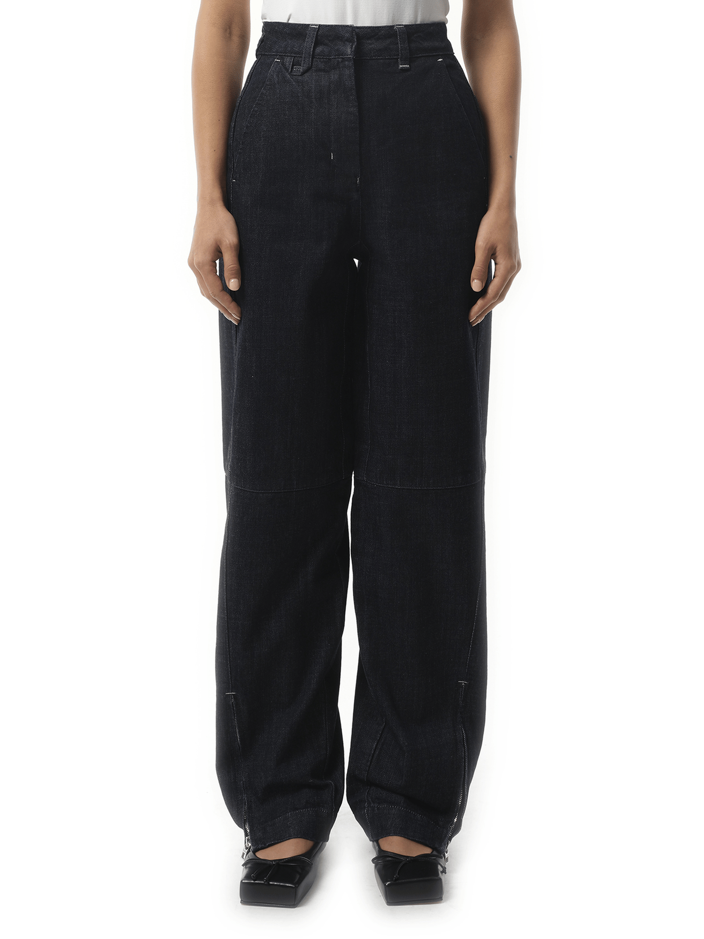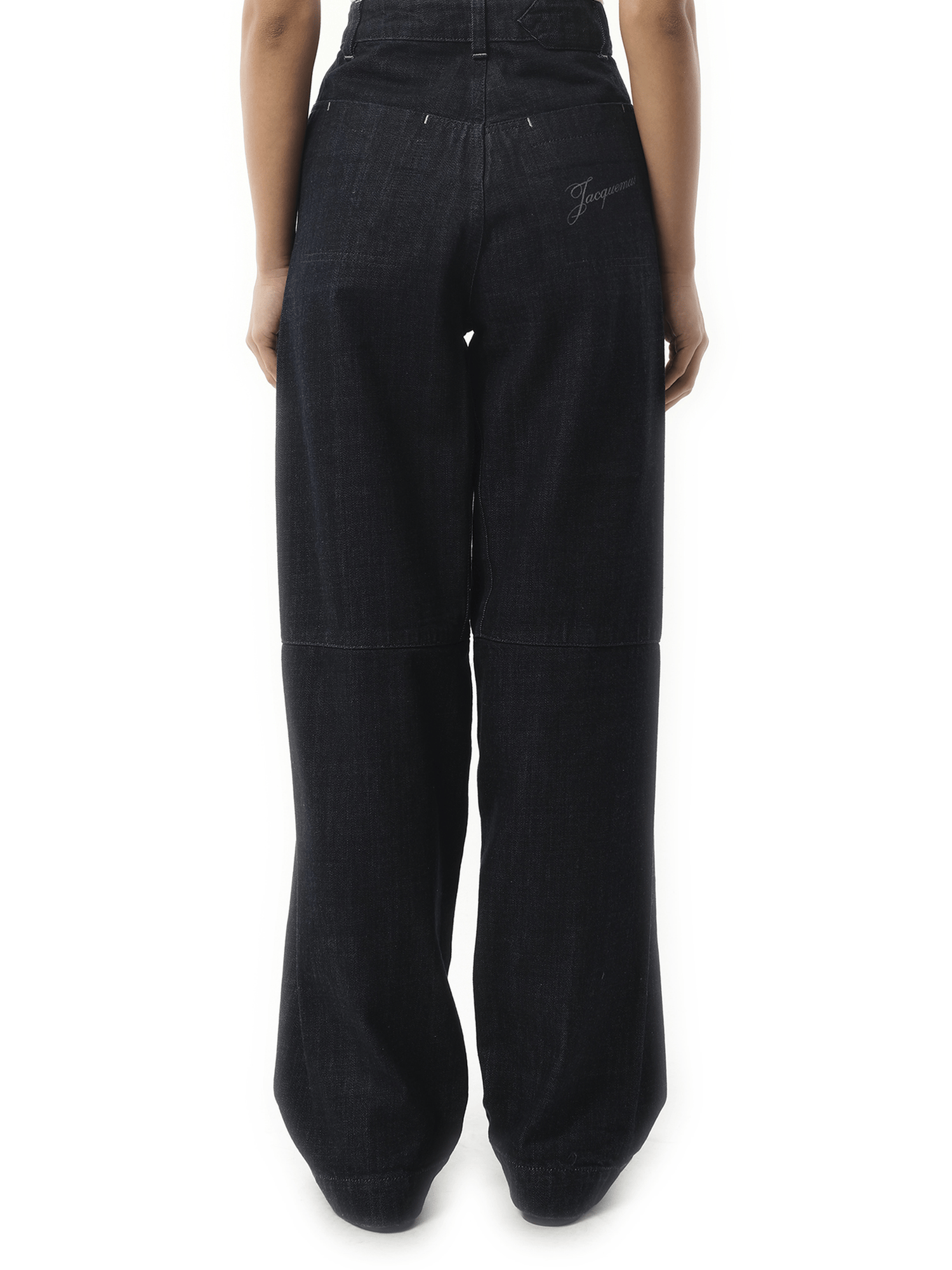 Jacquemus's Le Cargo Denim in Dark Navy, a contemporary take on the utilitarian cargo pant. Crafted in dark navy denim, these high-rise jeans feature a curved leg and practical pocket detailing.