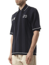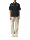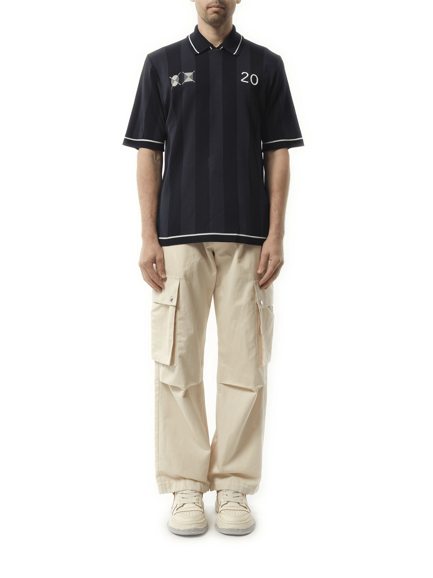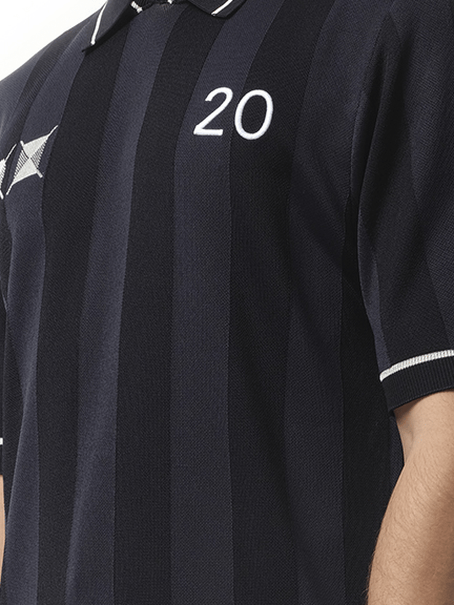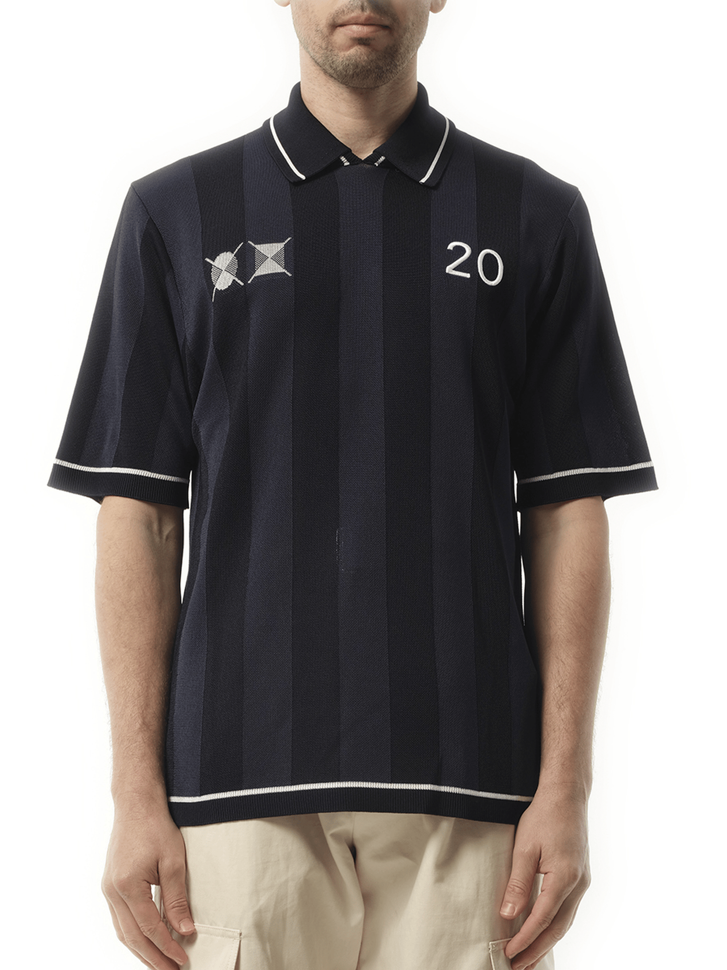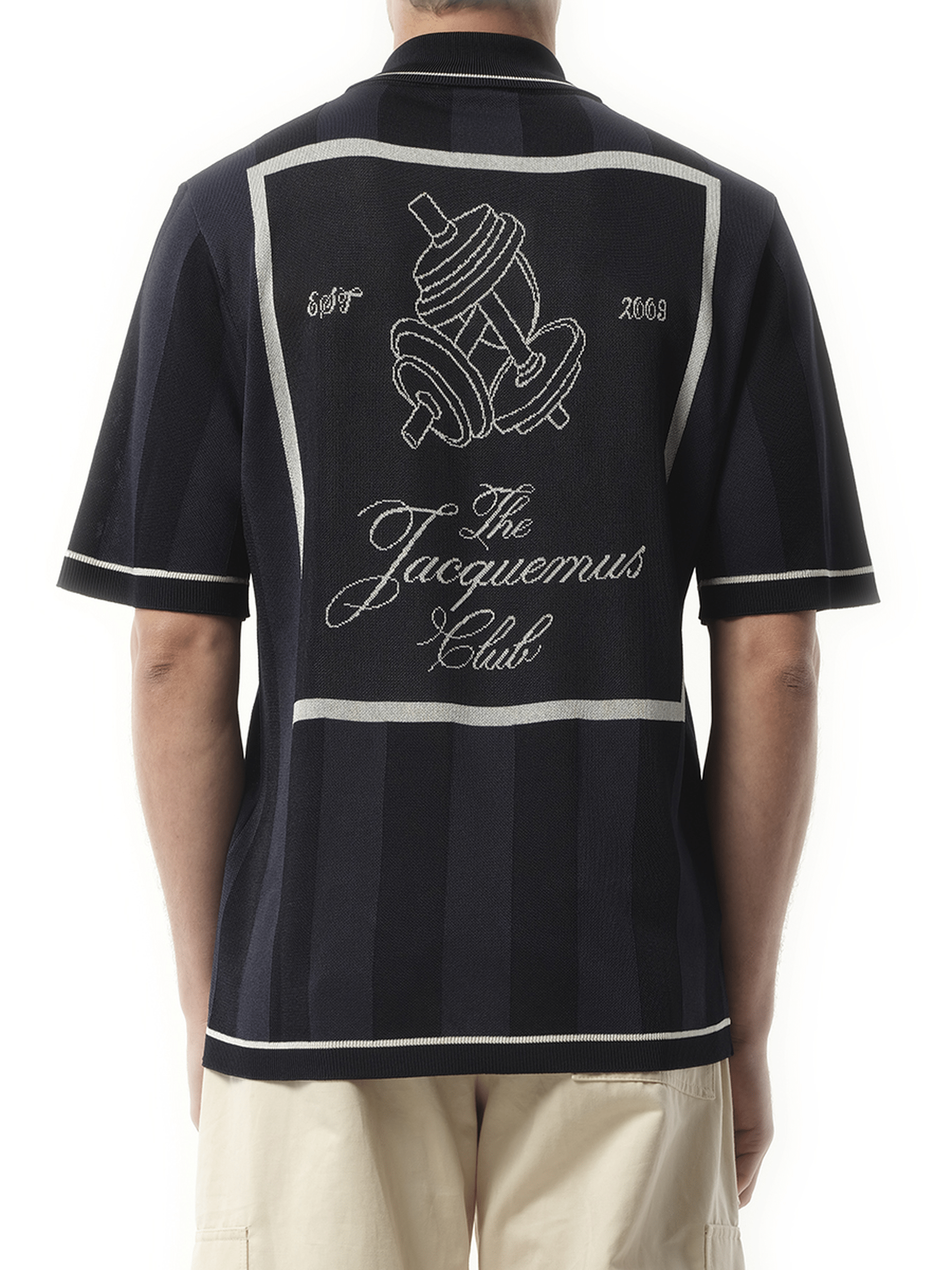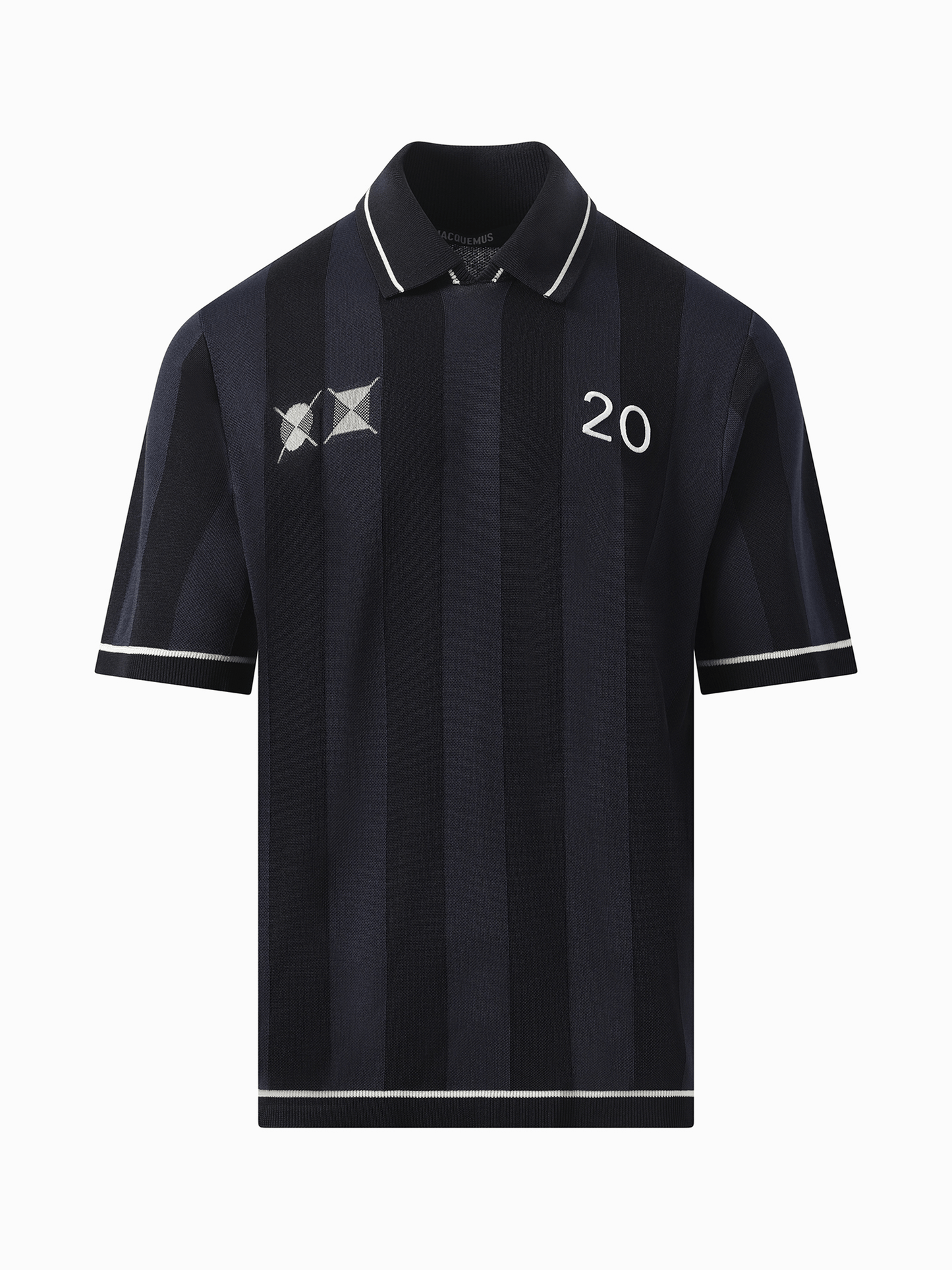 Jacquemus' Le Polo Liga in Dark Navy offers a refined, sporty aesthetic with its distinctive design. It features matte and shiny vertical stripes, boxy elbow-length sleeves, and ribbed details at the collar, cuffs, and hem for a structured yet comfortable fit.