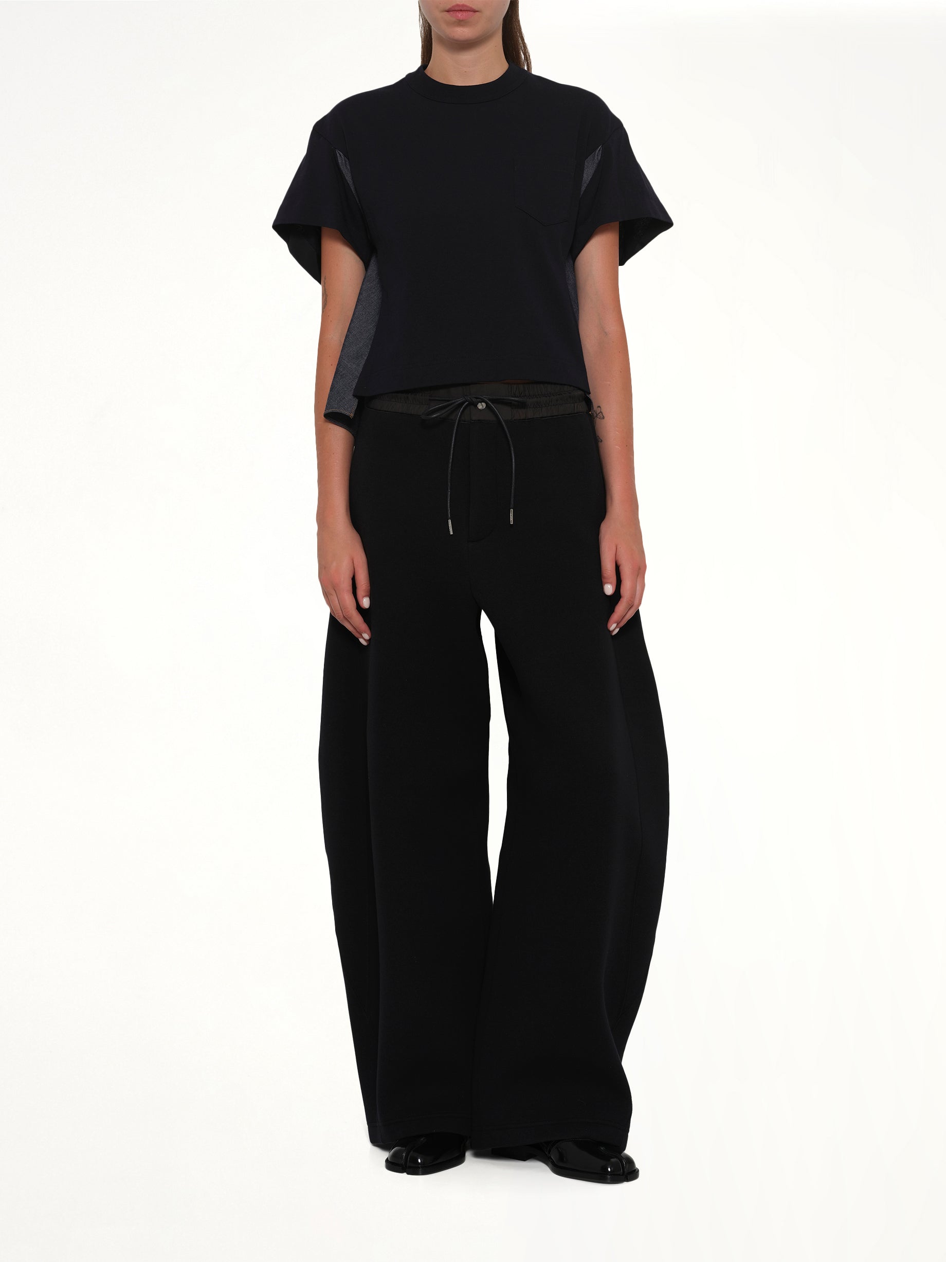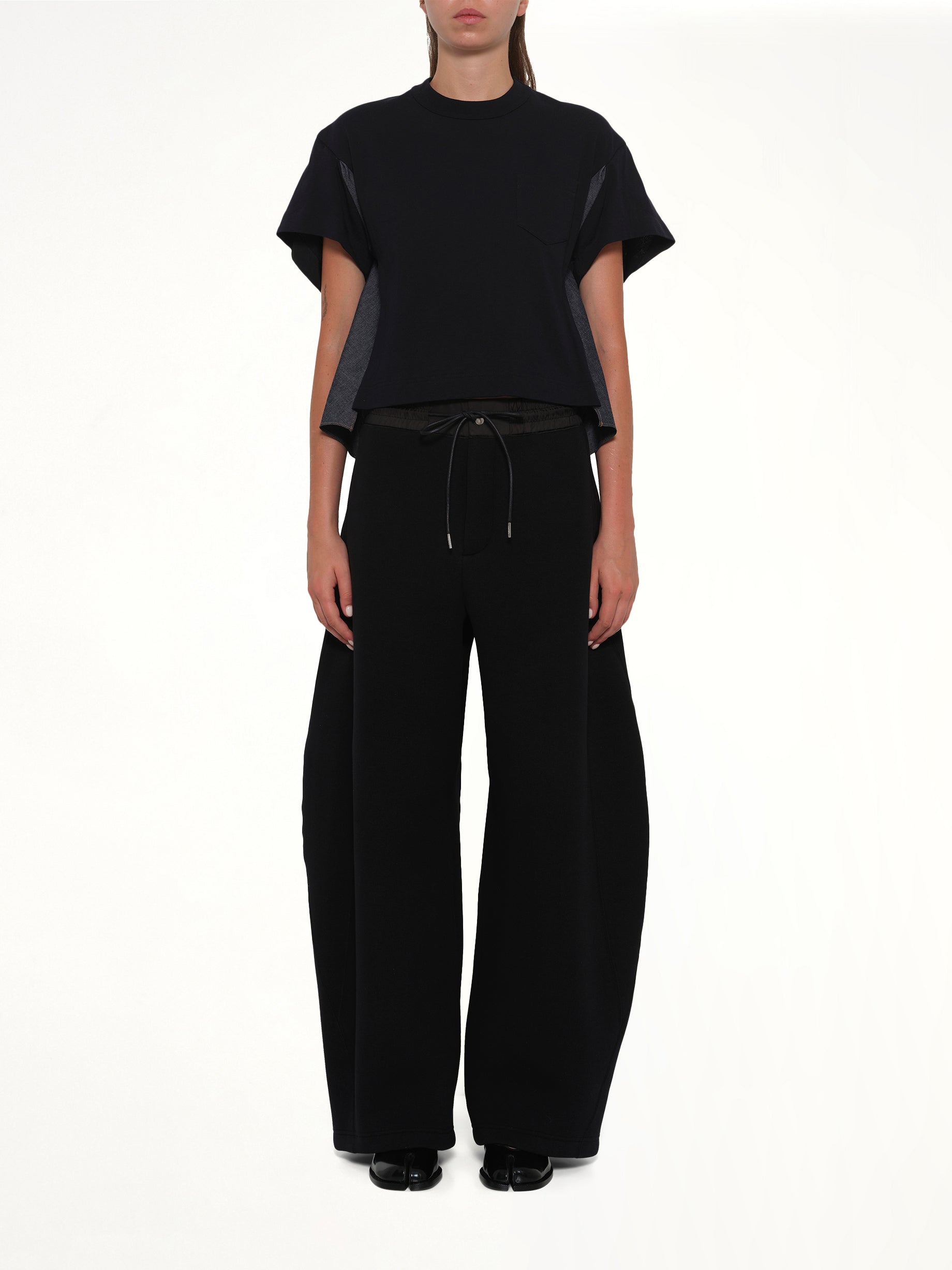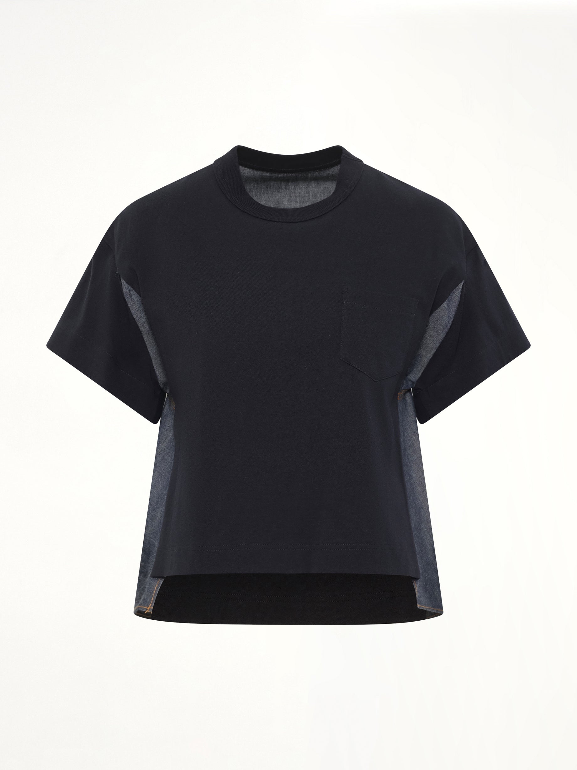 Sacai's Light Weight Denim x Poplin Jersey T-Shirt in Navy/Blue is a unique blend of casual and chic, offering a modern twist on a classic silhouette. This versatile piece is perfect for elevating your everyday wardrobe with its innovative design.