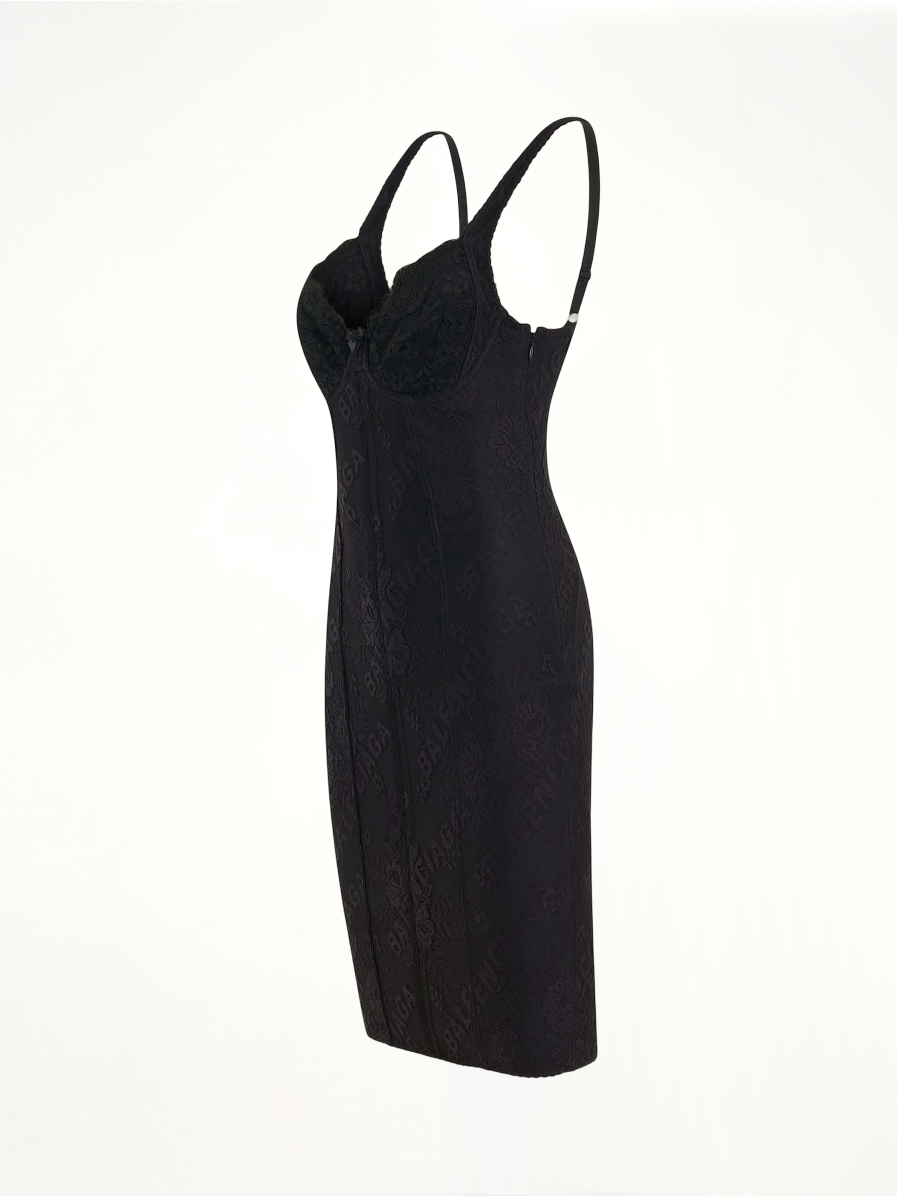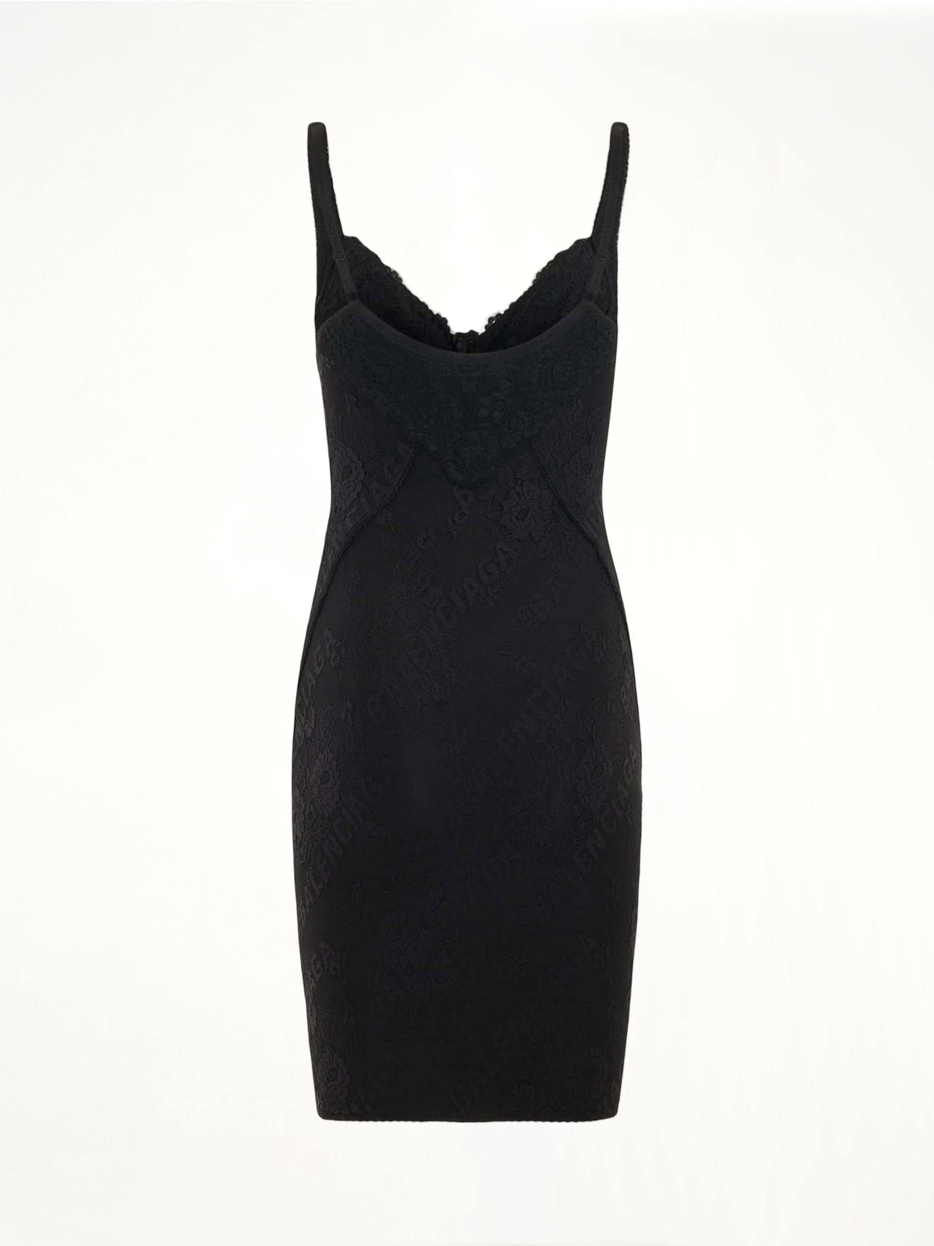 Designed in a bodycon fit, it accentuates your curves for a flattering silhouette. The dress features two adjustable logo bra straps, adding a touch of branding to the overall design. The fine lace detailing at the chest adds a delicate and feminine touch to the dress, while the worn-out effect gives it a unique and contemporary twist.