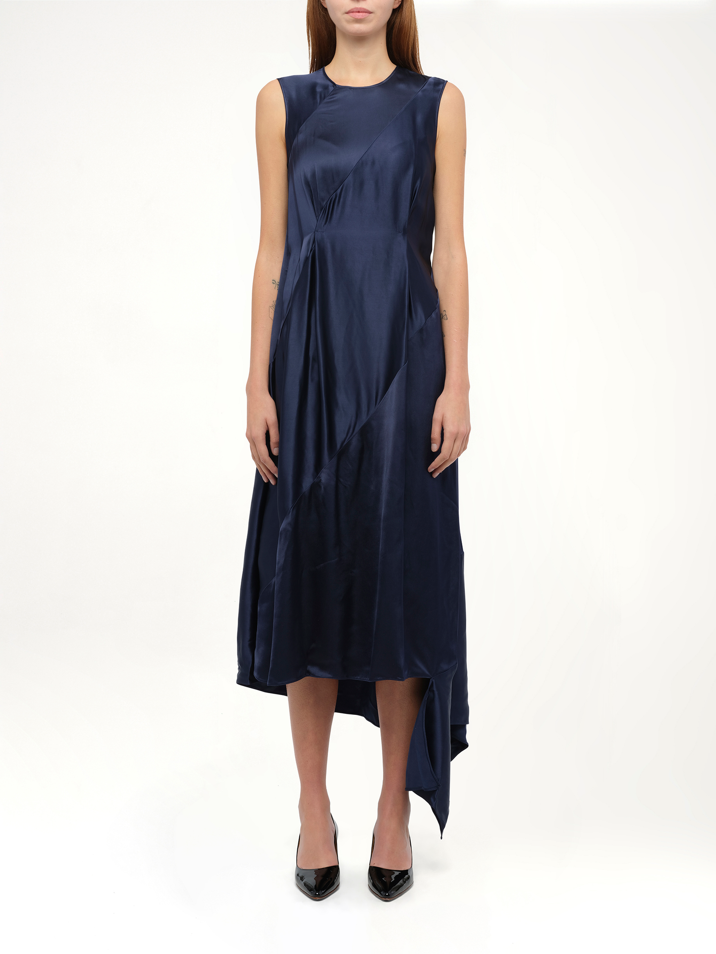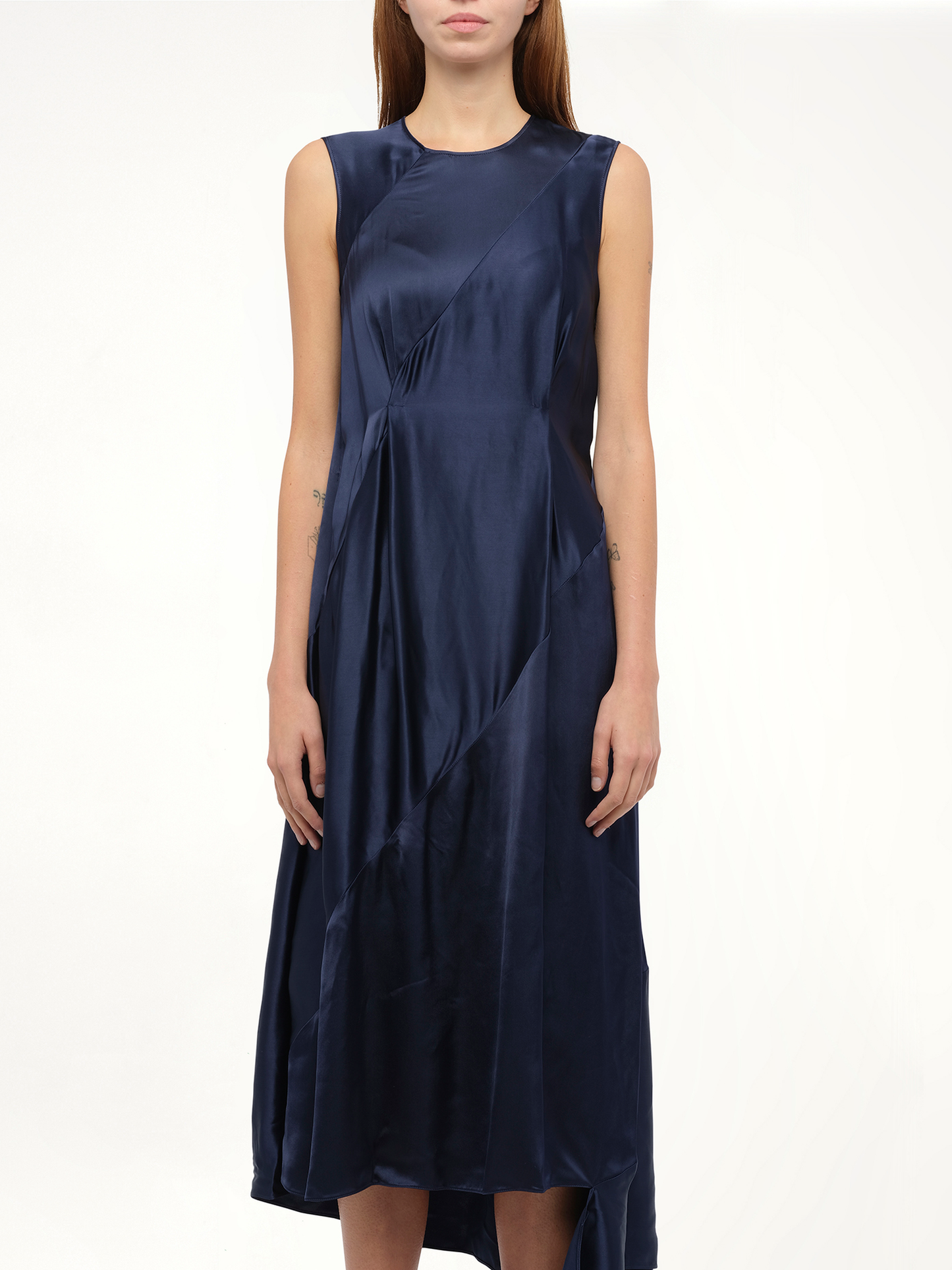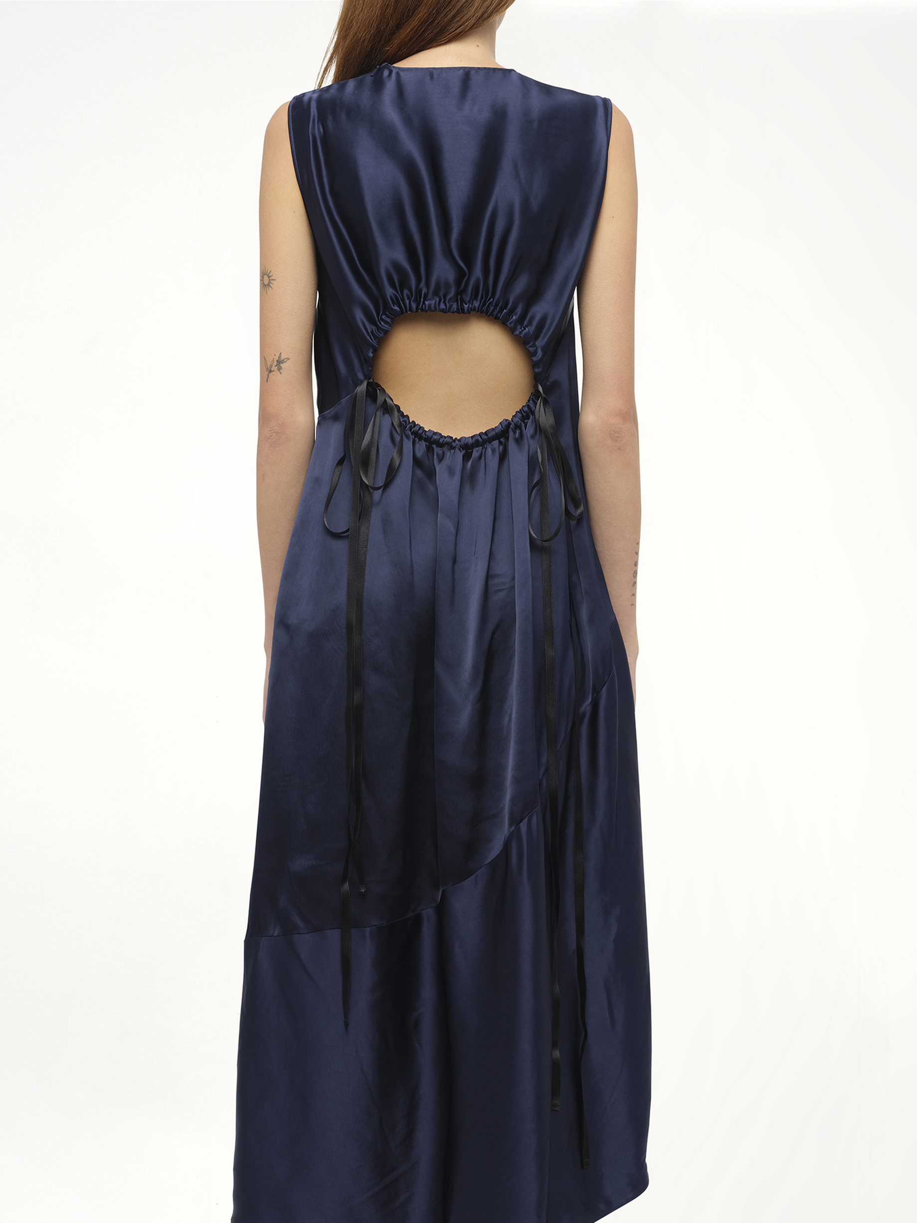 Loewe's sleeveless navy satin dress is perfect for any occasion. The elegant design and smooth satin fabric provide a sophisticated look while the sleeveless style offers comfort and breathability. Elevate your wardrobe with this versatile and timeless piece.
