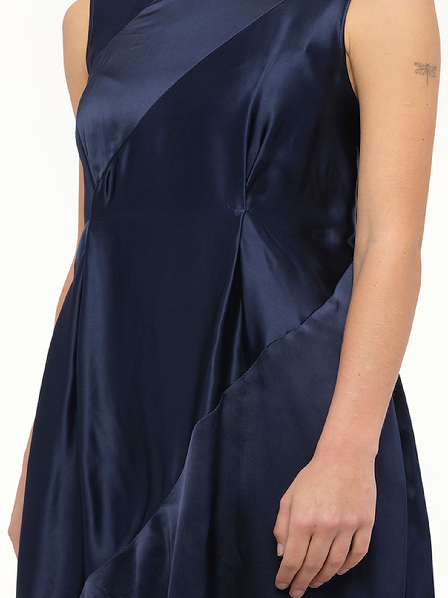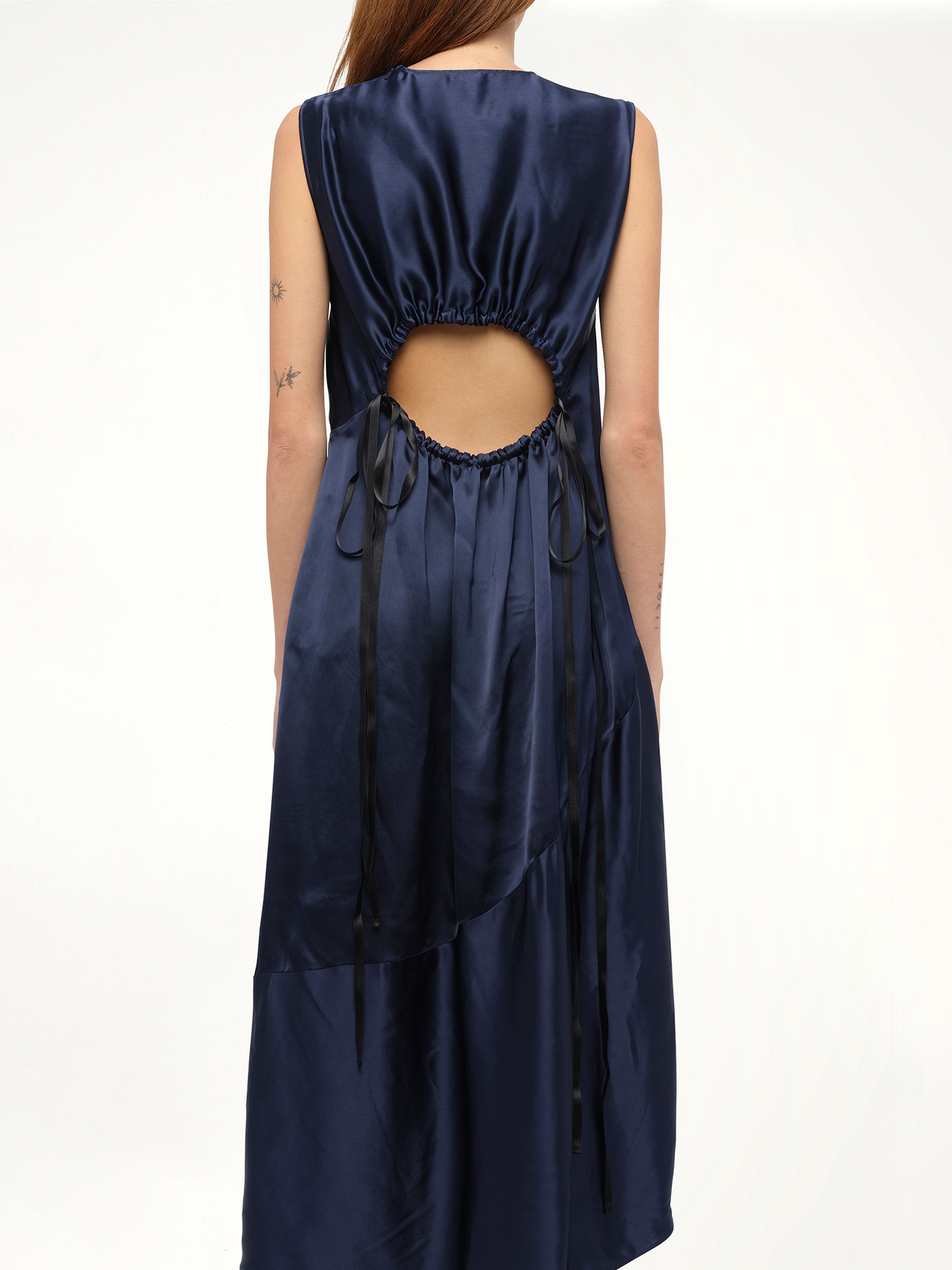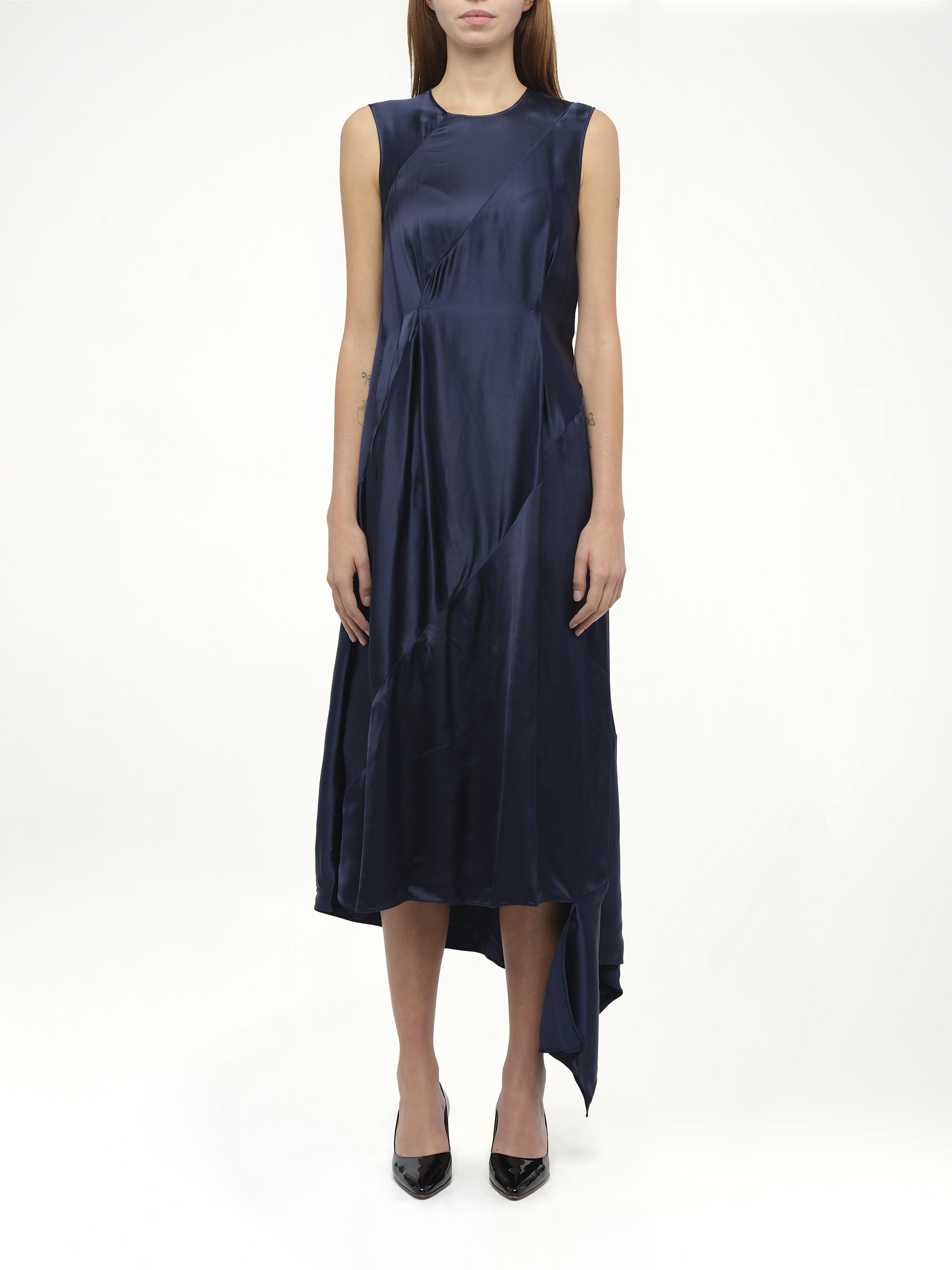 Loewe's sleeveless navy satin dress is perfect for any occasion. The elegant design and smooth satin fabric provide a sophisticated look while the sleeveless style offers comfort and breathability. Elevate your wardrobe with this versatile and timeless piece.