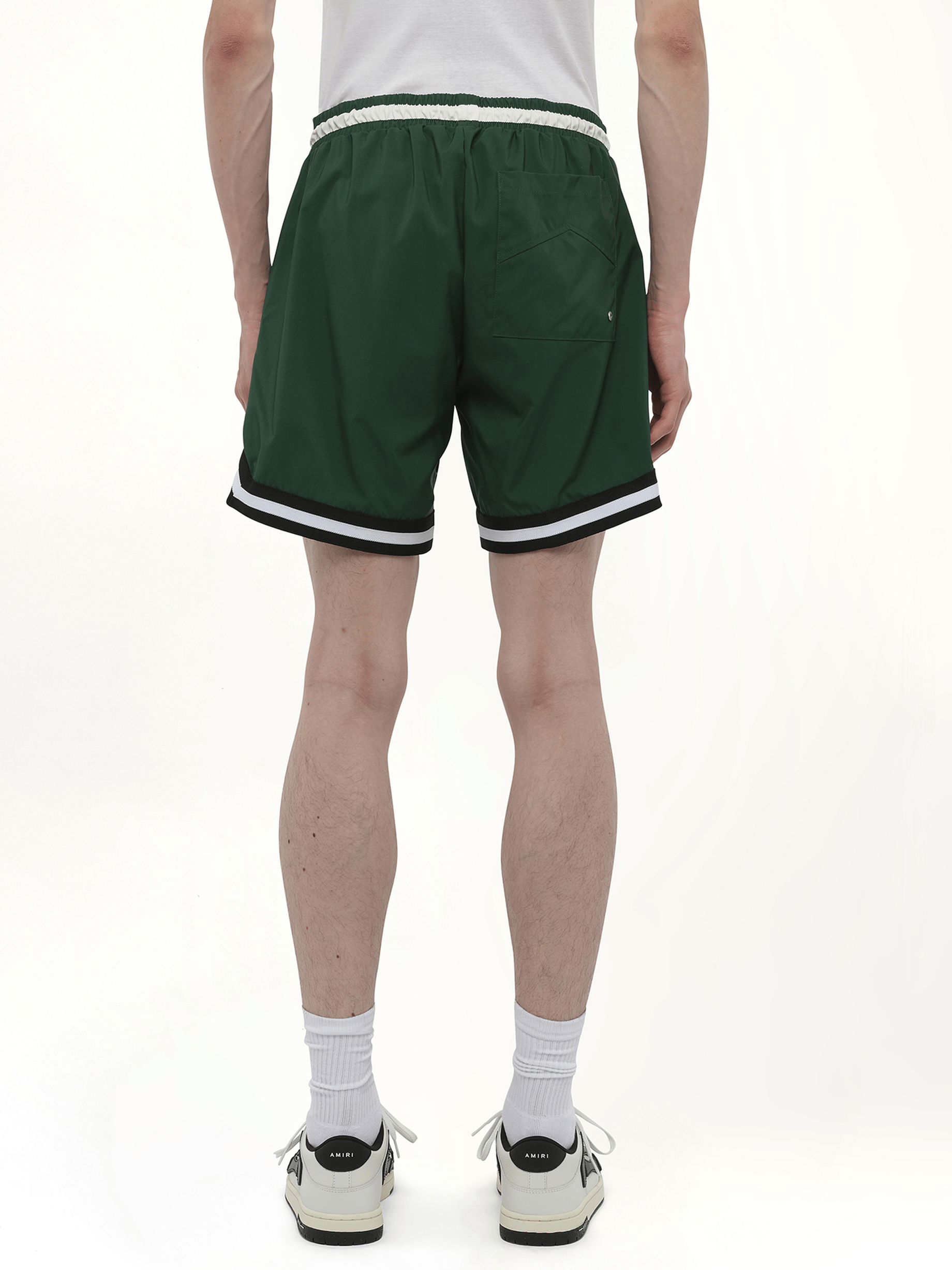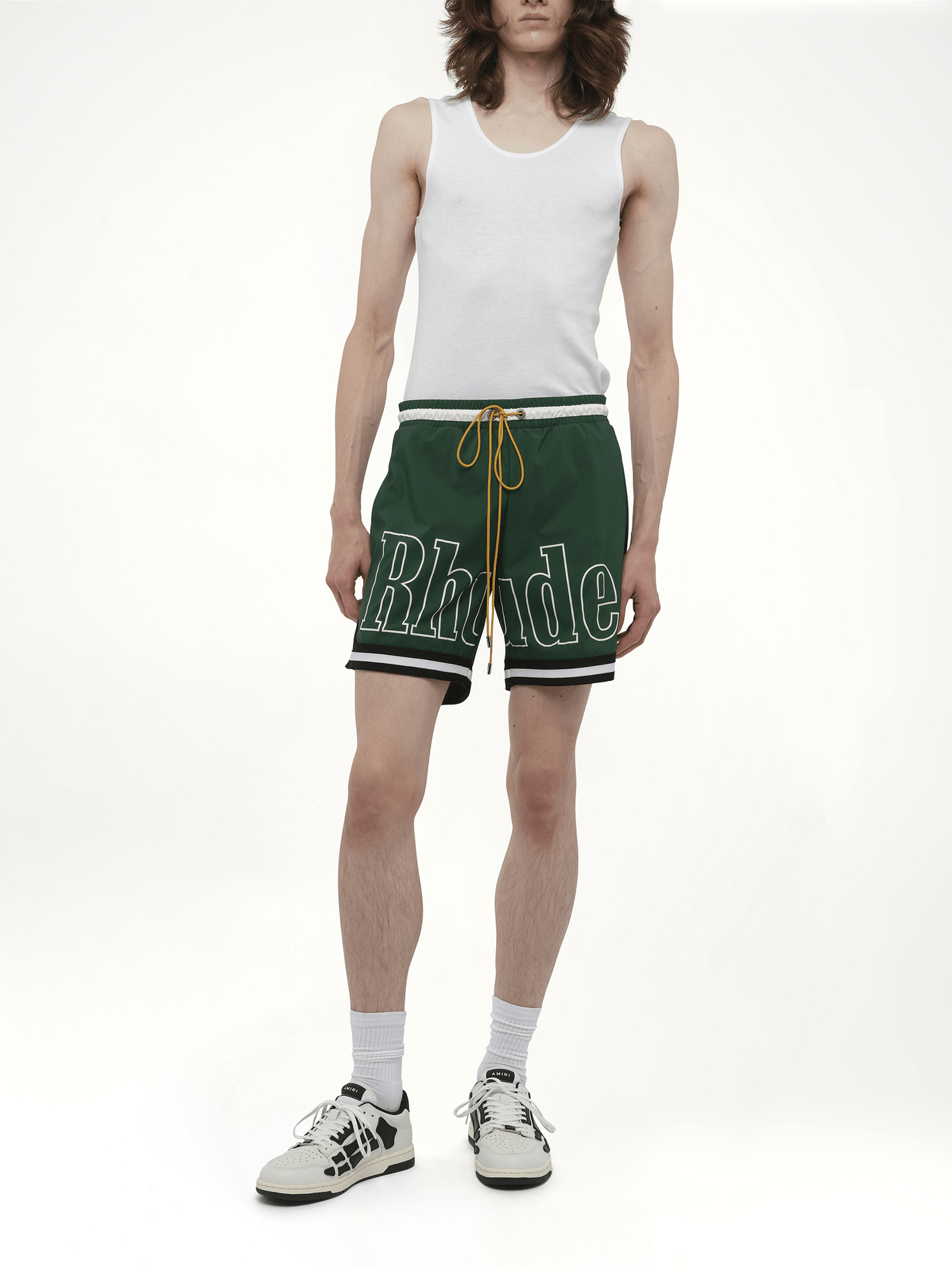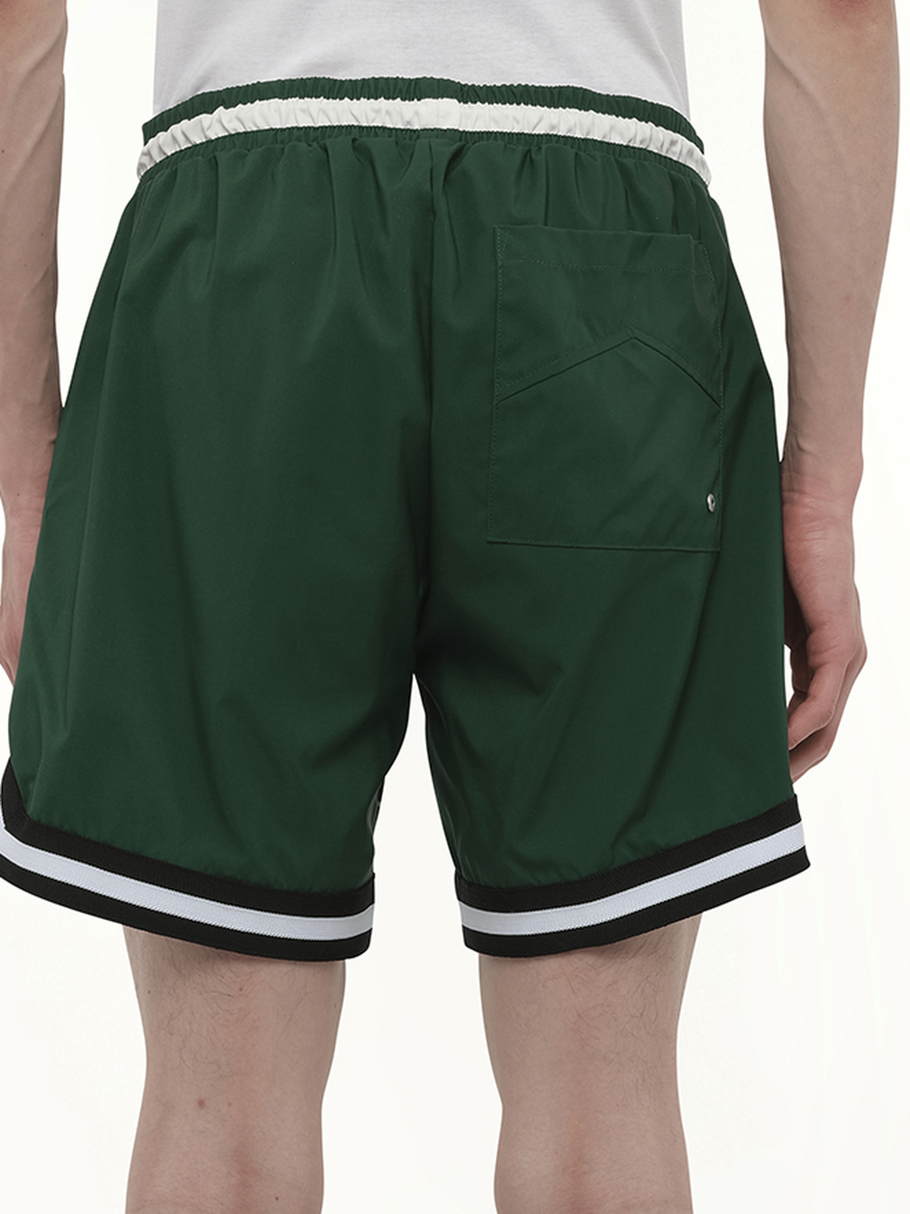 RHUDE's Logo Basketball Swim Short in Forest Green/Black/White offers a stylish blend of athletic and casual wear, perfect for both poolside lounging and active days. Elevate your swimwear collection with this versatile piece.
