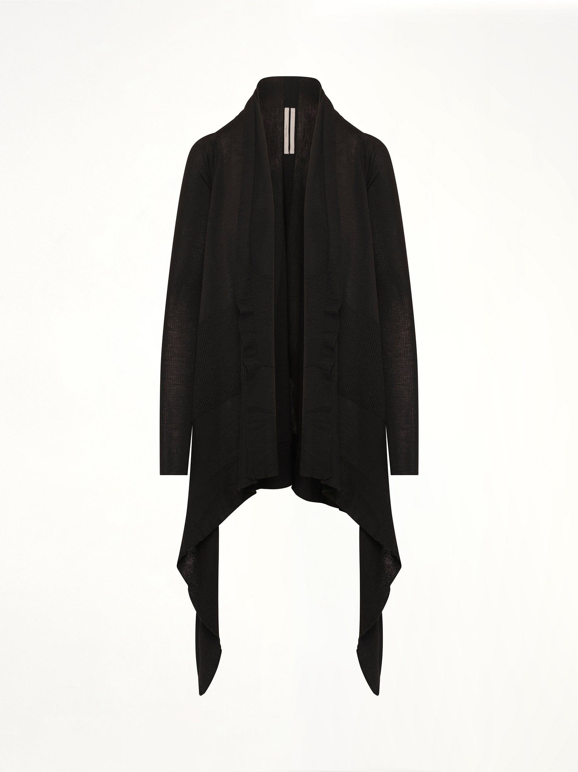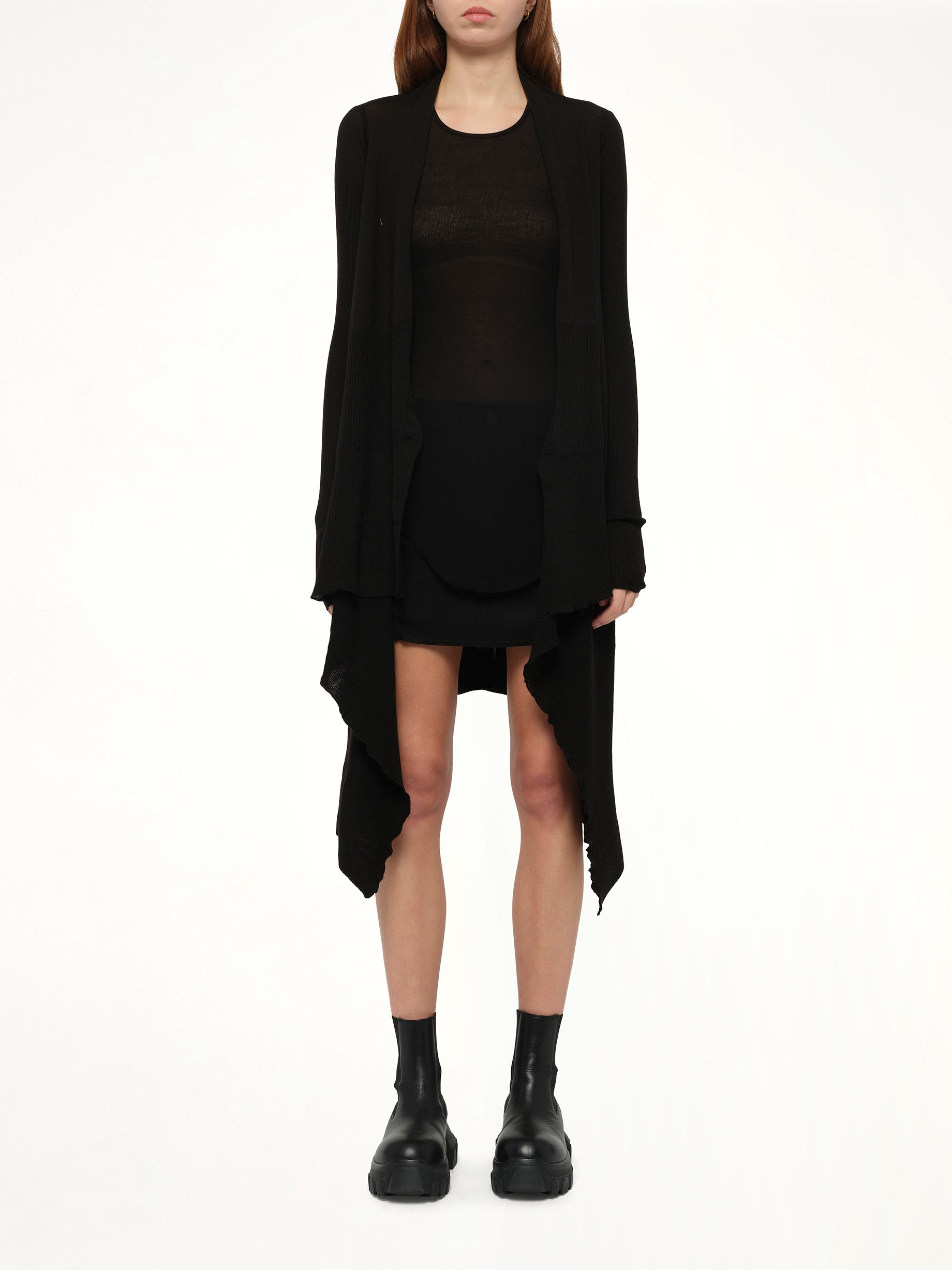 Rick Owens's Long Wrap Cardigan in Black is a versatile and stylish addition to any wardrobe. This elegant piece offers both comfort and a modern aesthetic.