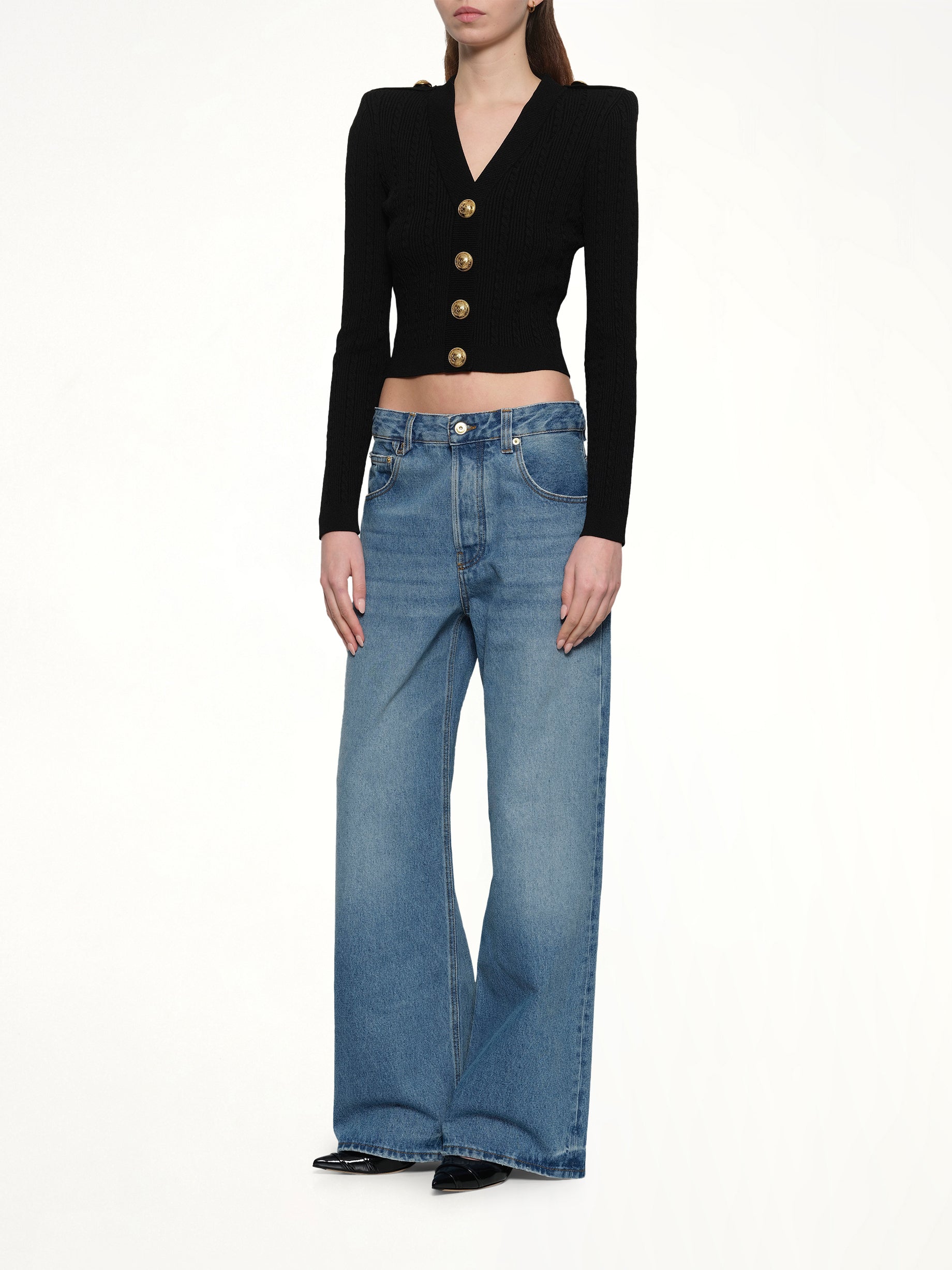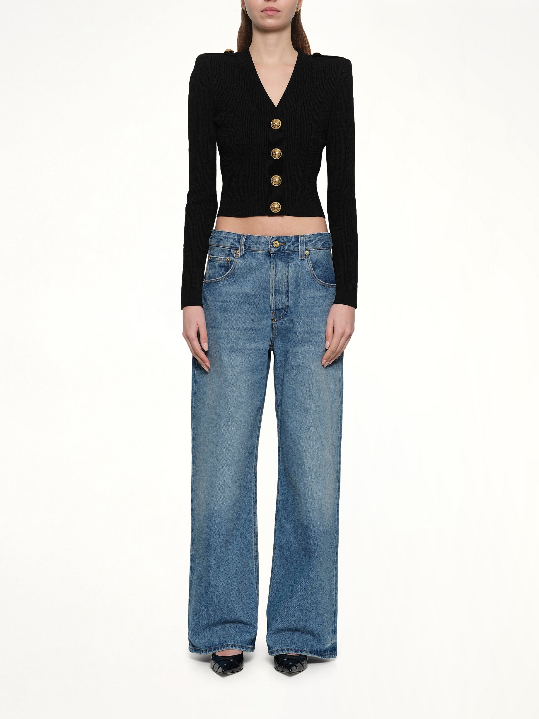 Balmain's LS Buttoned V-Neck Torsade Knit Cardigan in Black is a sophisticated addition to any wardrobe. This elegant piece combines classic design with modern detailing for a timeless look.