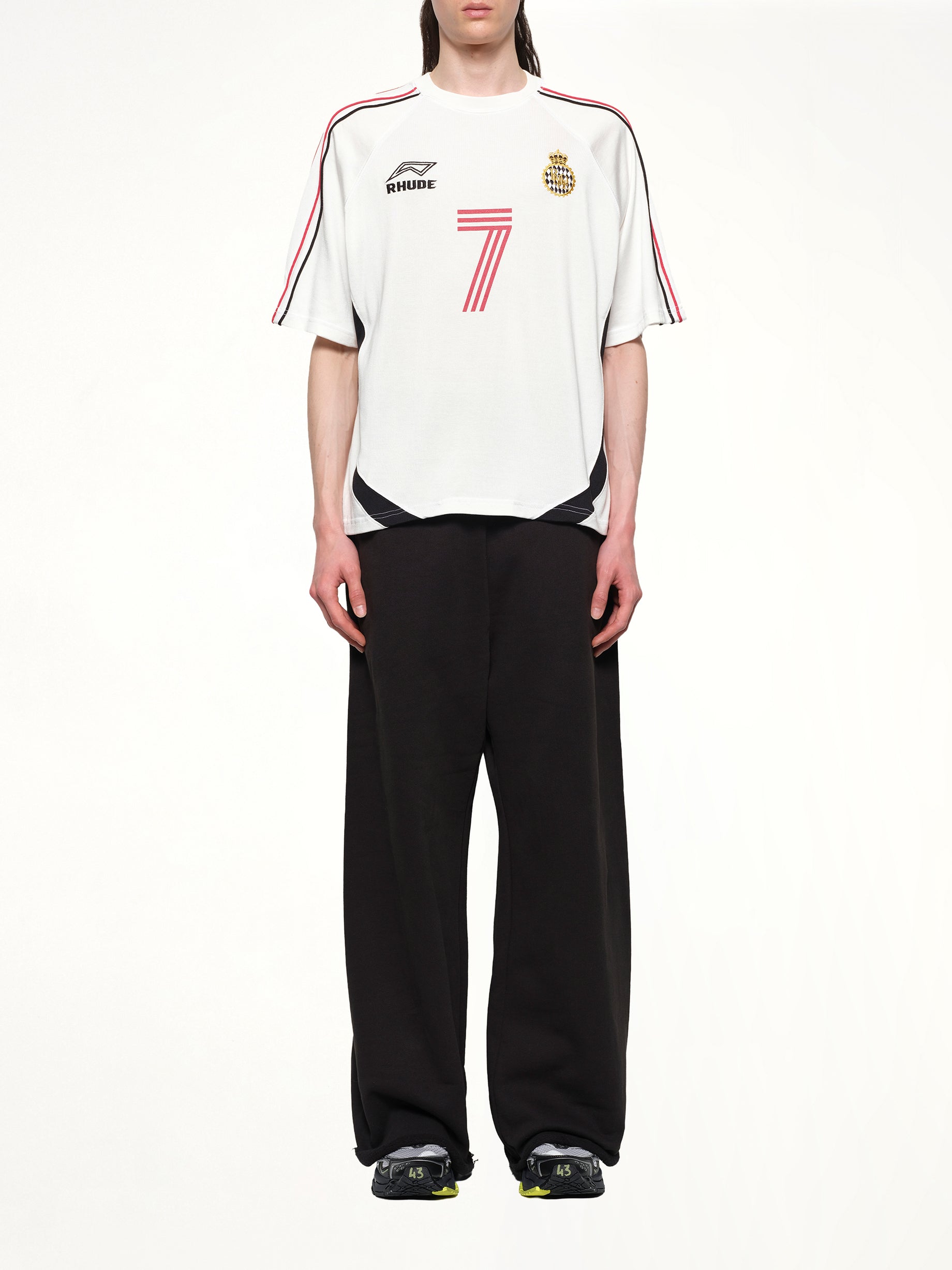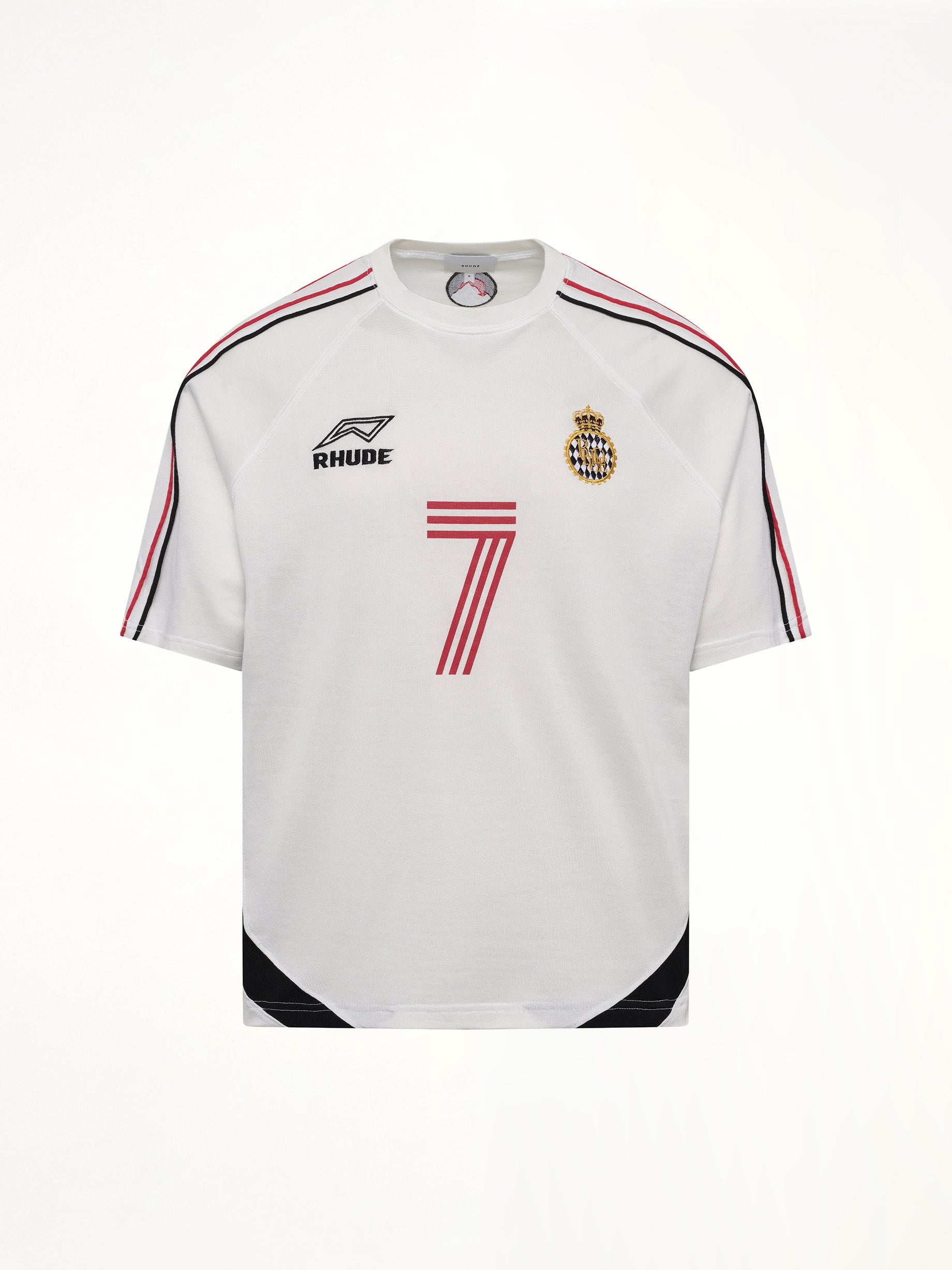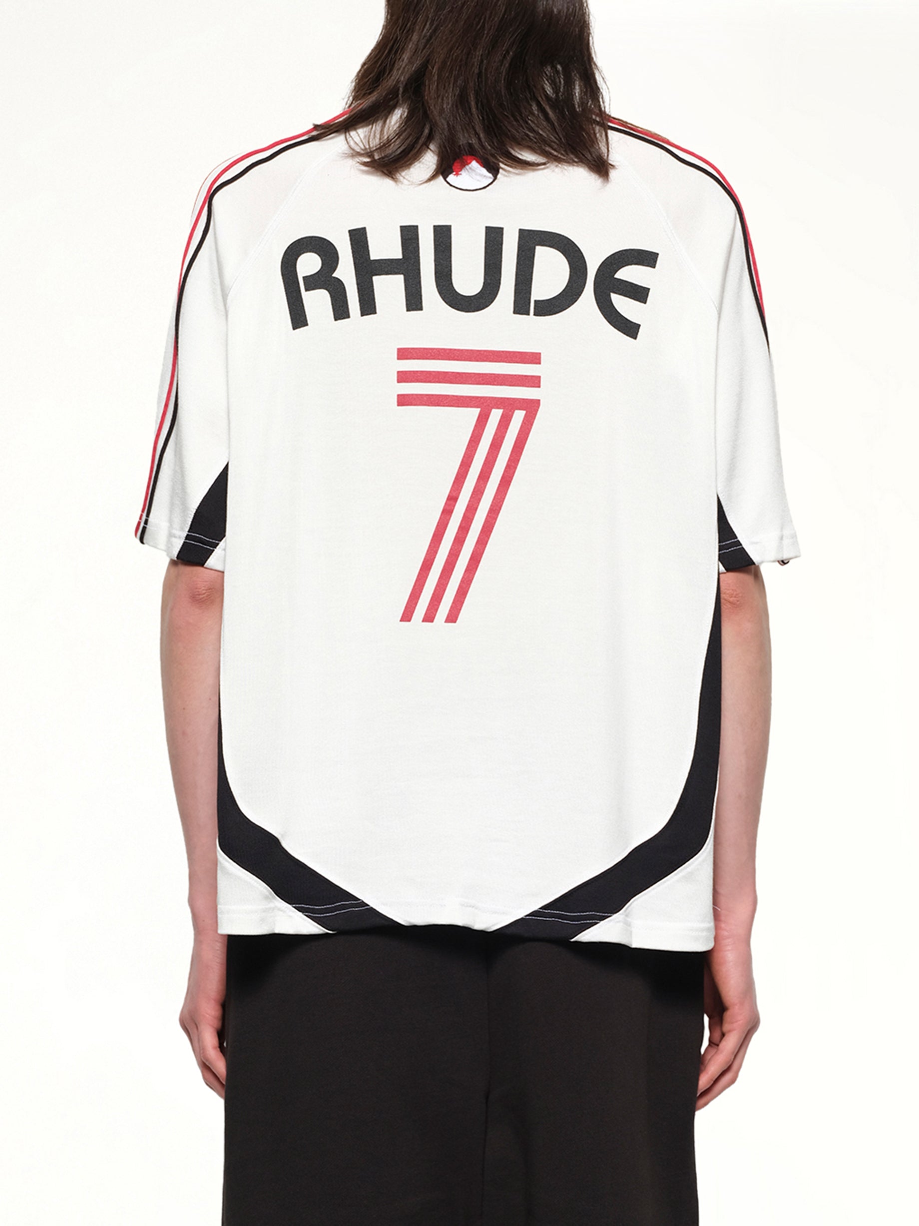 Rhude's Lundun Soccer Jersey in White/Black/Red is a stylish and contemporary take on classic sportswear. This jersey combines bold color blocking with a sleek design, making it a standout piece for any wardrobe.
