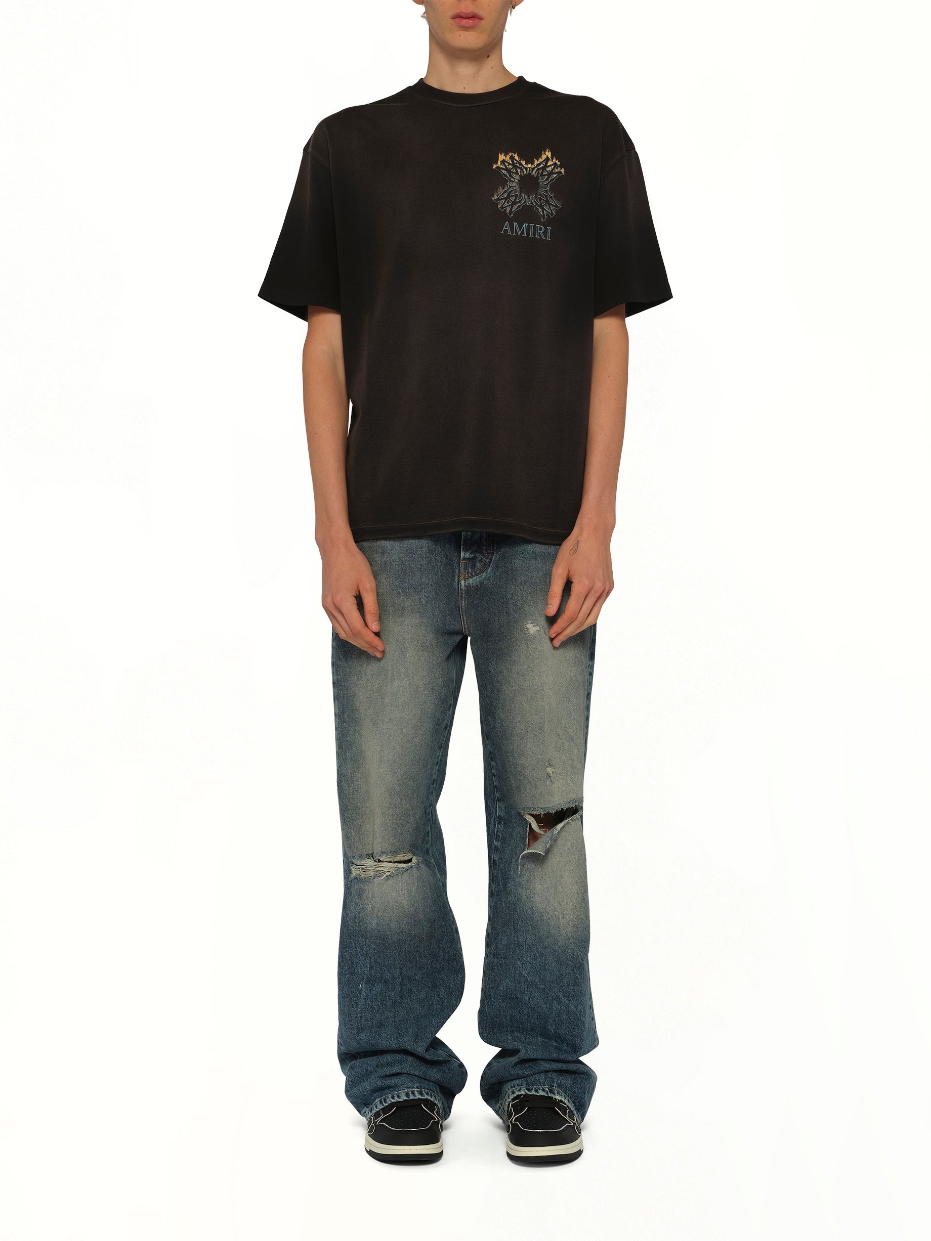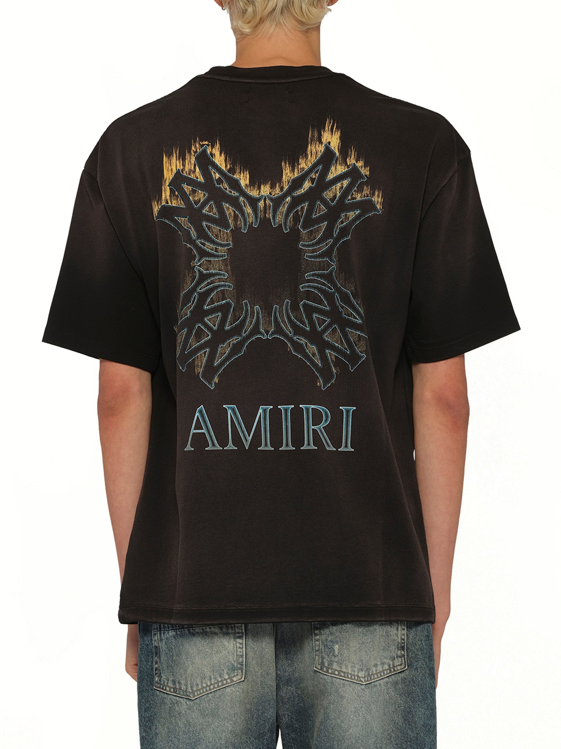 Amiri's MA Quad Flames Oversized T-Shirt in Black is a bold statement piece that combines comfort with a striking design. This t-shirt features a unique flame graphic that adds an edgy touch to any casual outfit.