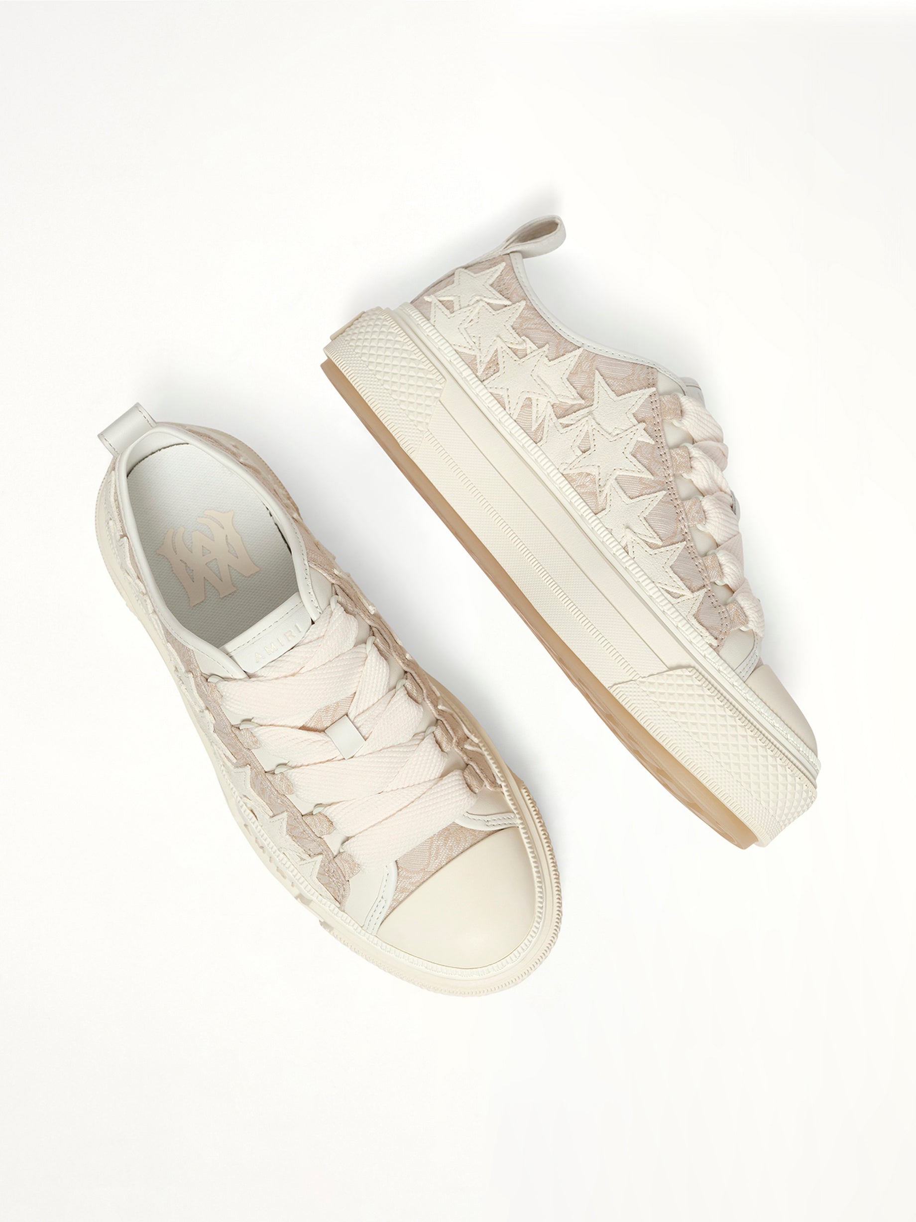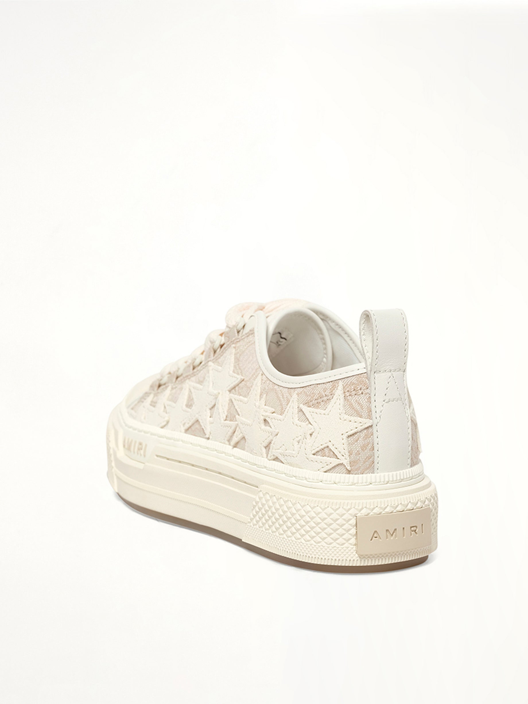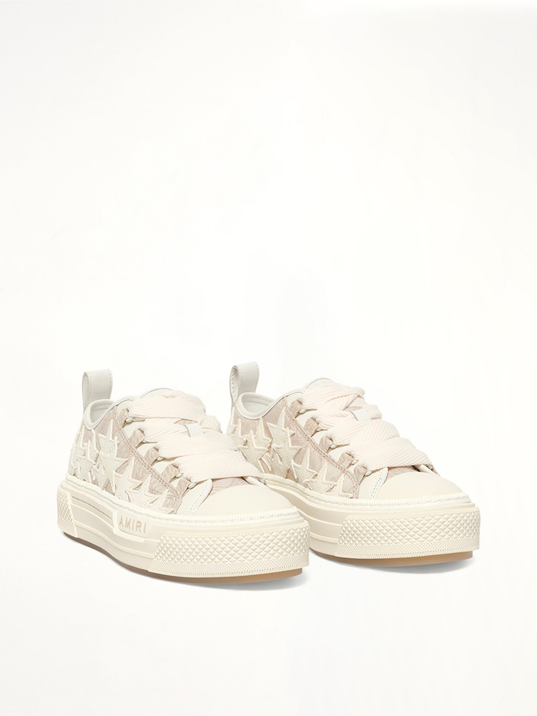 Amiri's MA Quad Stars Court Low in Alabaster is a stylish and contemporary sneaker that combines luxury with streetwear aesthetics. This footwear piece is designed to offer both comfort and a bold fashion statement.