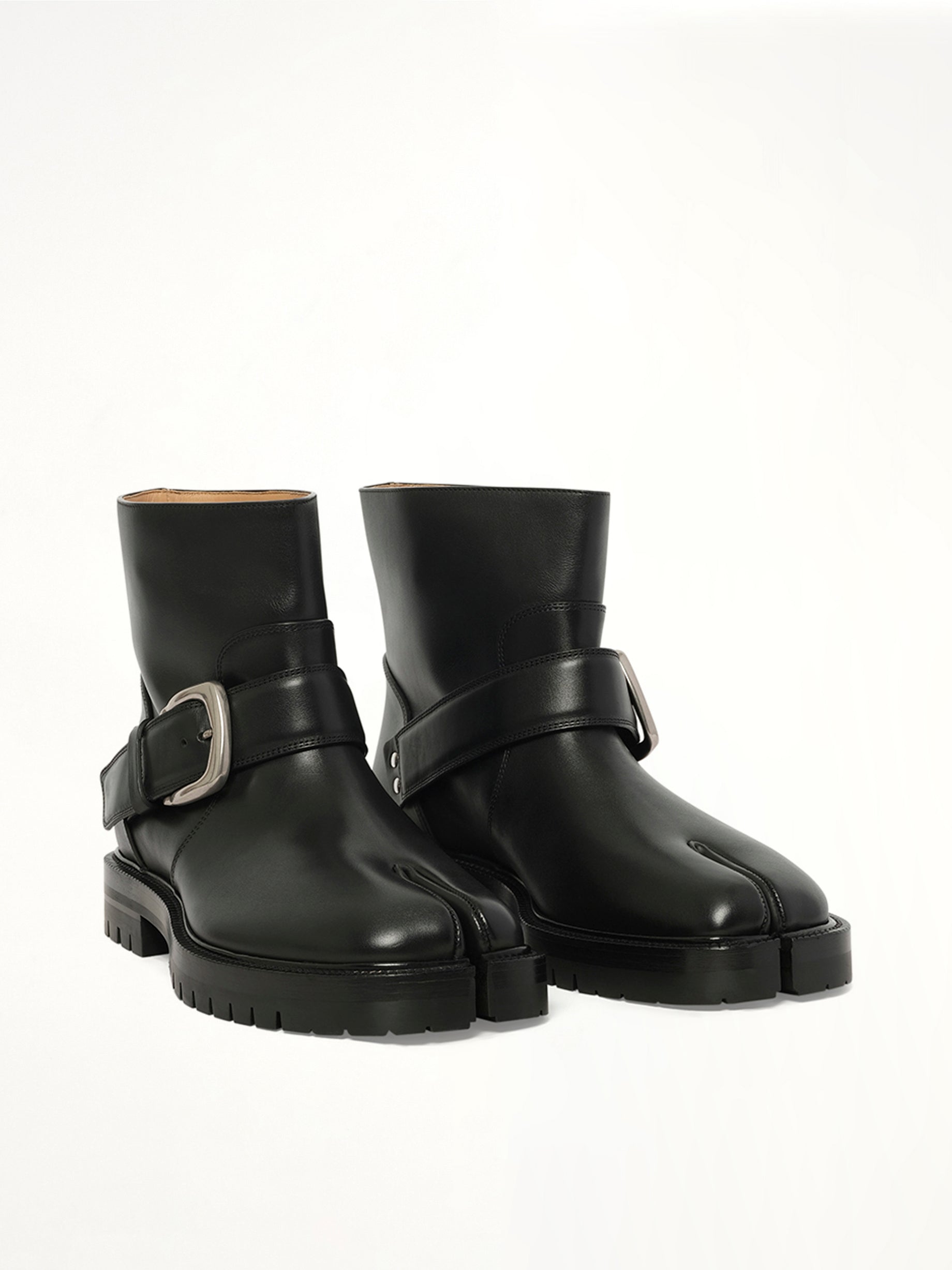 Maison Margiela's Tabi County Buckle Ankle Boots in Black is a unique blend of avant-garde design and classic elegance. These boots feature the iconic split-toe Tabi silhouette, offering a bold statement for any fashion-forward wardrobe.