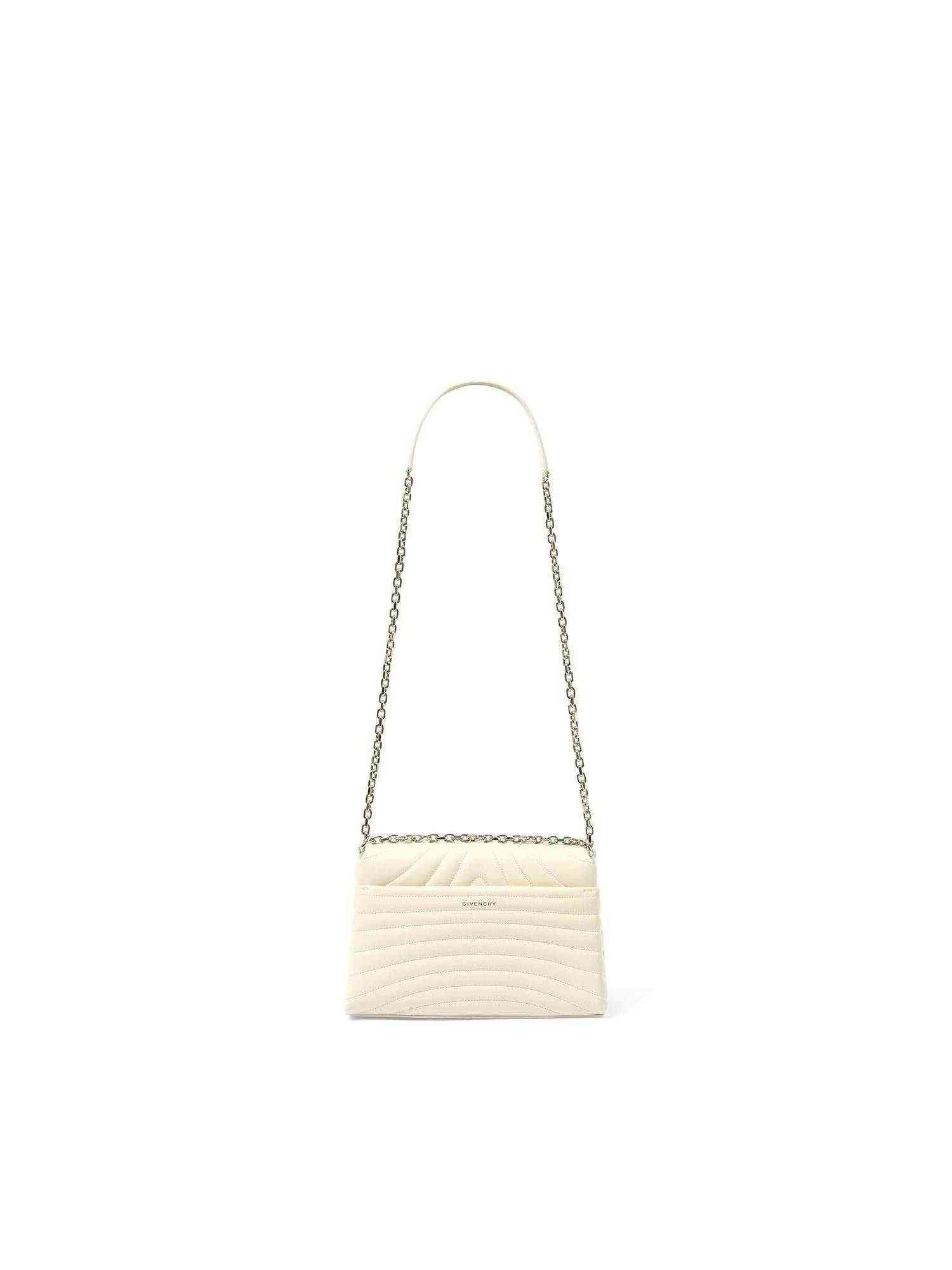 Givenchy's Medium 4G Soft Bag with Sliding Chain in Ivory is a sophisticated accessory that combines the brand's signature design with functional elements. Crafted from quilted calfskin leather, it features the iconic 4G emblem and a versatile sliding chain strap.