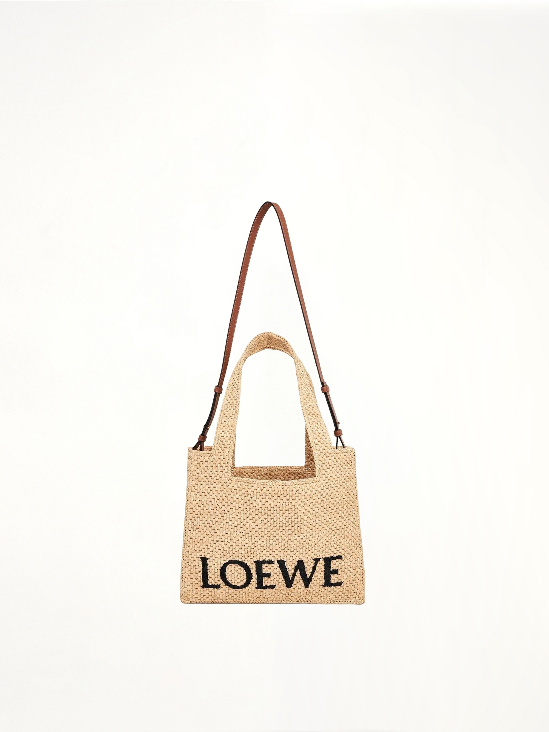 Medium Logo Font Tote Bag in Raffia and Calfskin in Natural