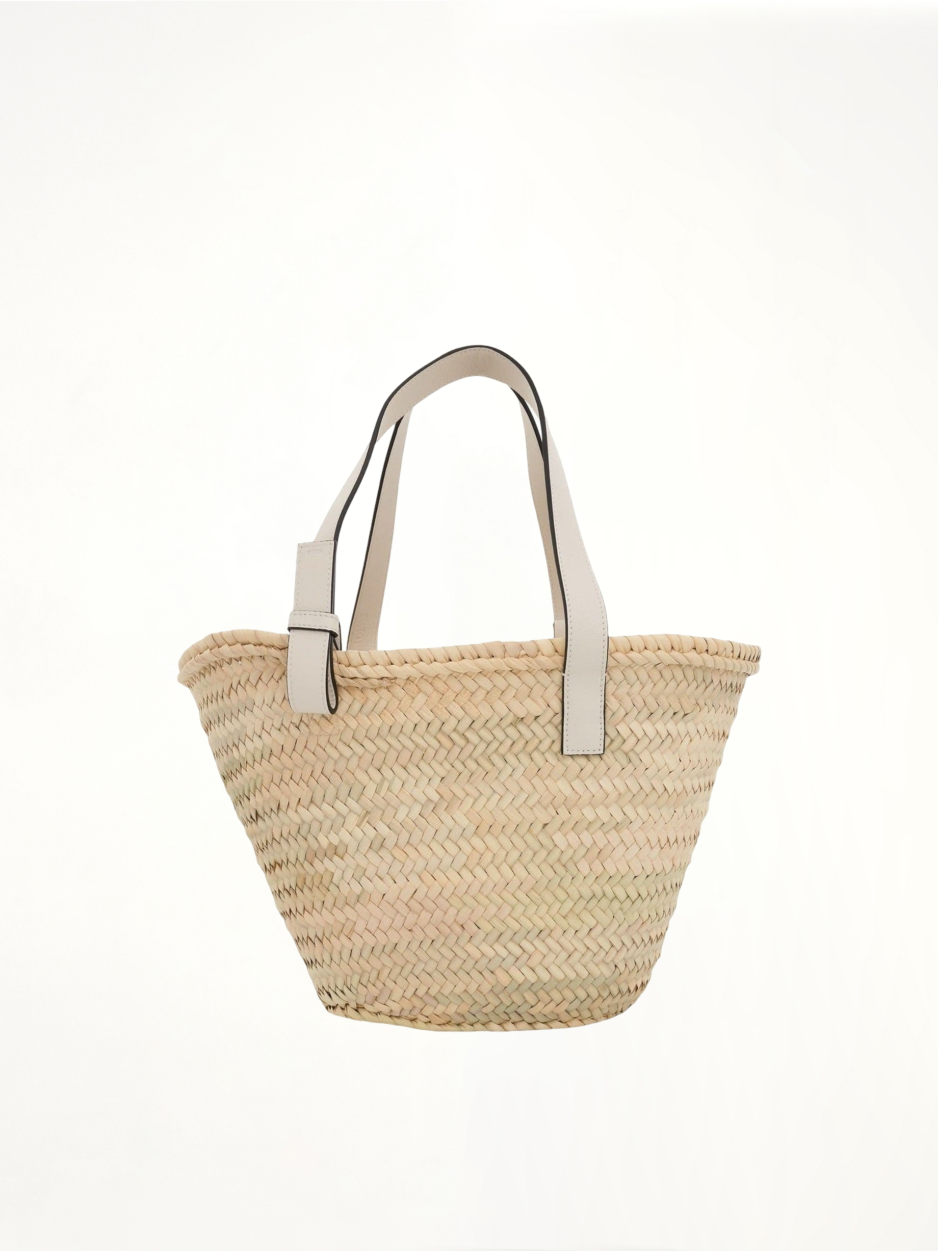 Medium Palm Leaf and Calfskin Basket Bag in Natural/White