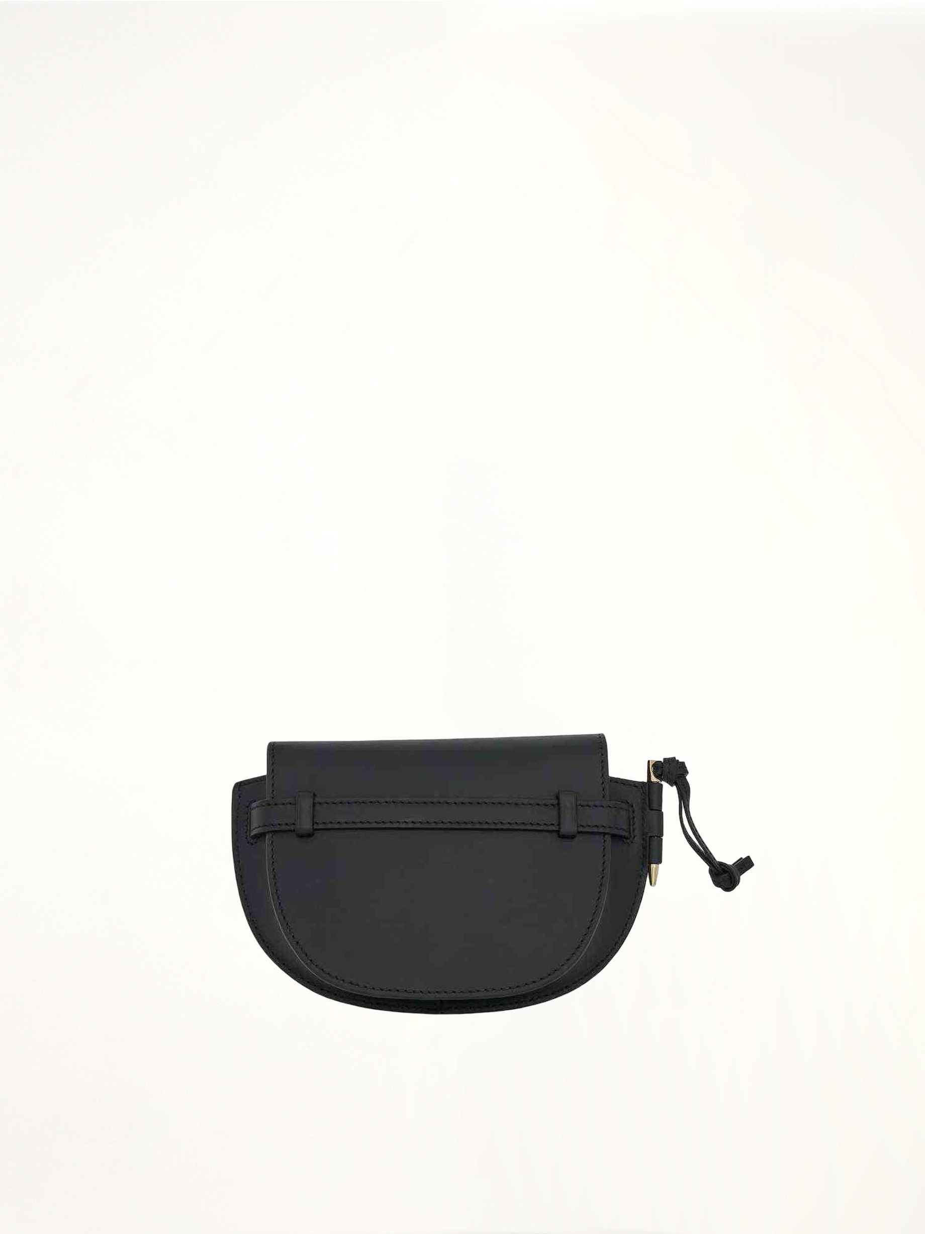 Mini Gate Dual bag crafted in black soft calfskin and displays LOEWE´s unrivalled leather craftsmanship with a saddle-stitched knotted leather strap and a side-latched metal pin that gives the bag its name.