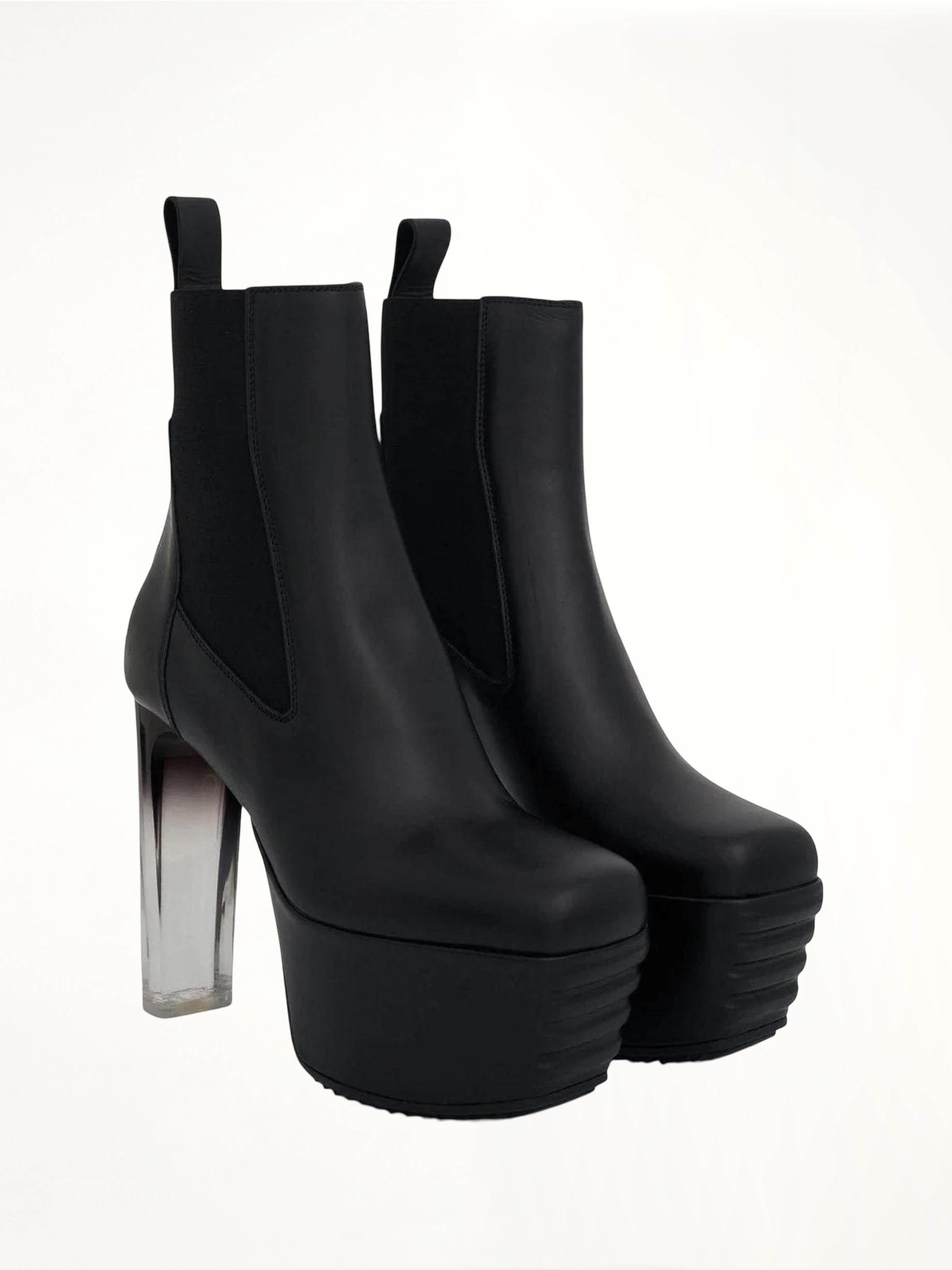 Minimal Grill Beatle ankle boots from renowned designer Rick Owens. Exuding a captivating allure, these ankle boots are crafted from sleek black leather. The standout feature of these boots is the sky-high gradient transparent heel, adding a mesmerizing and futuristic touch to the design.