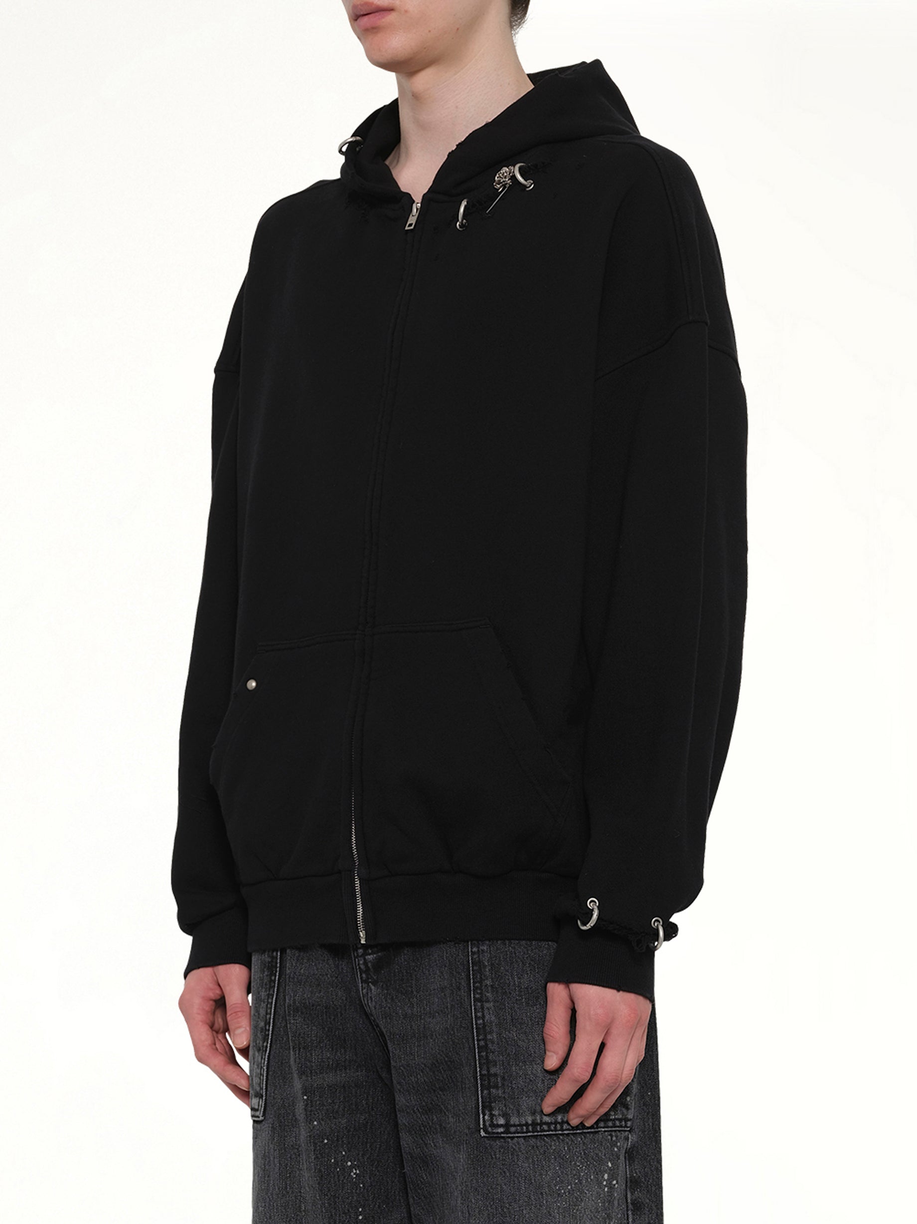 Piercing Detail Zip-Up Hoodie in Black