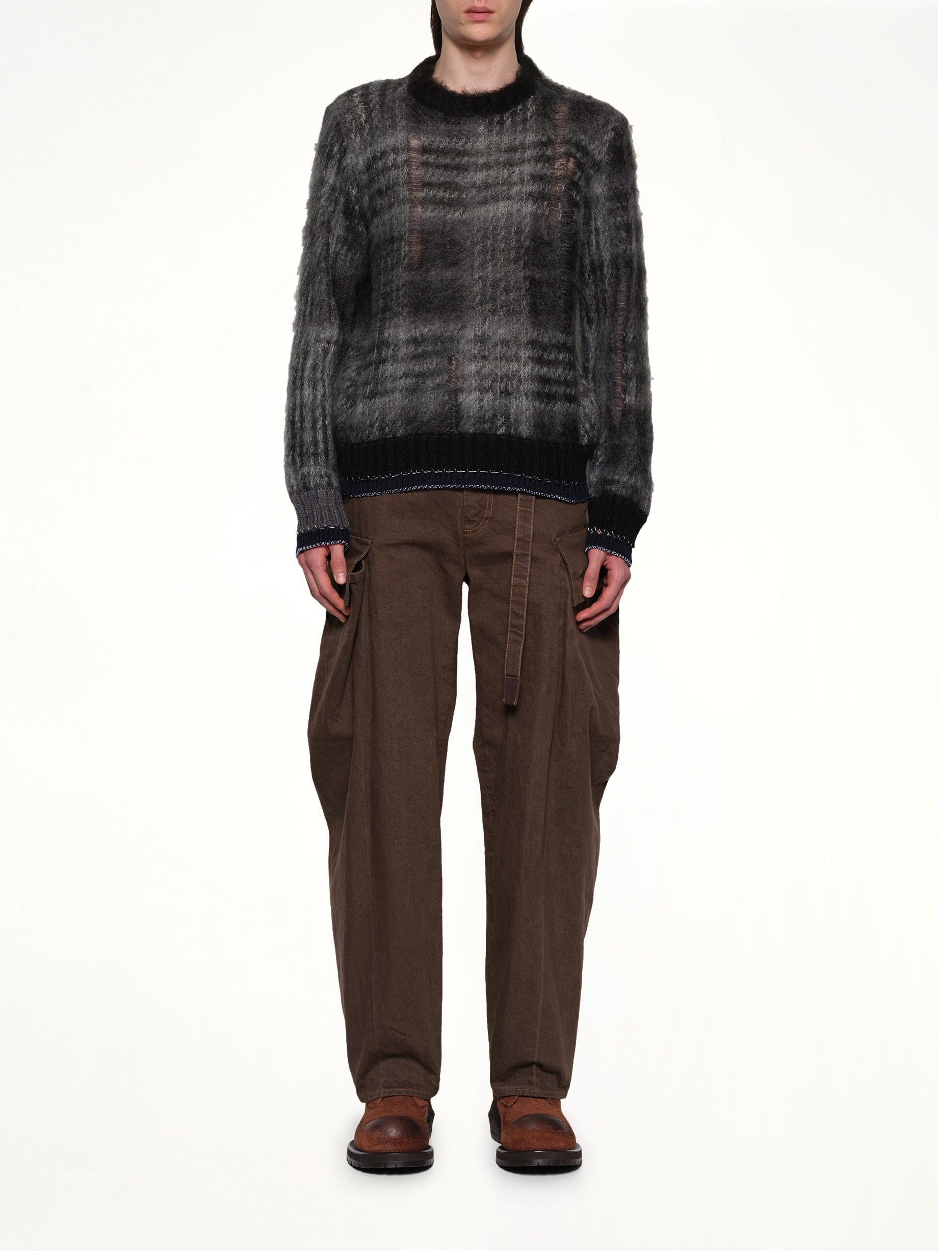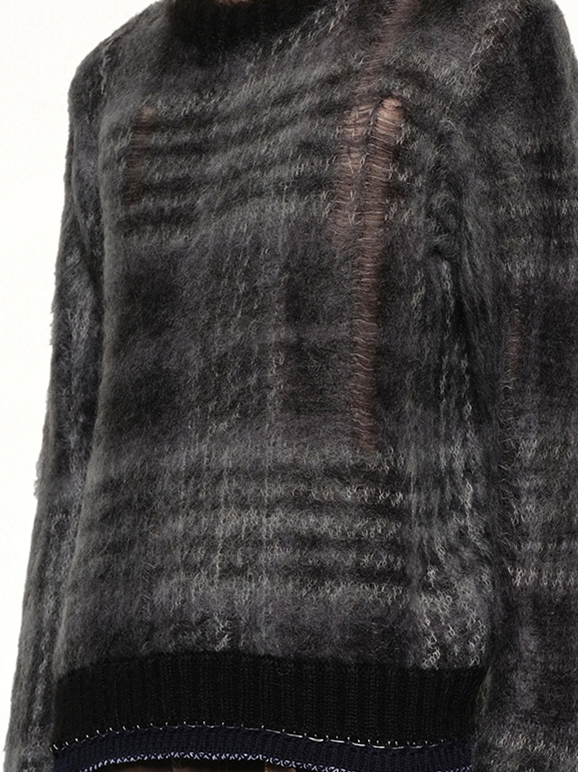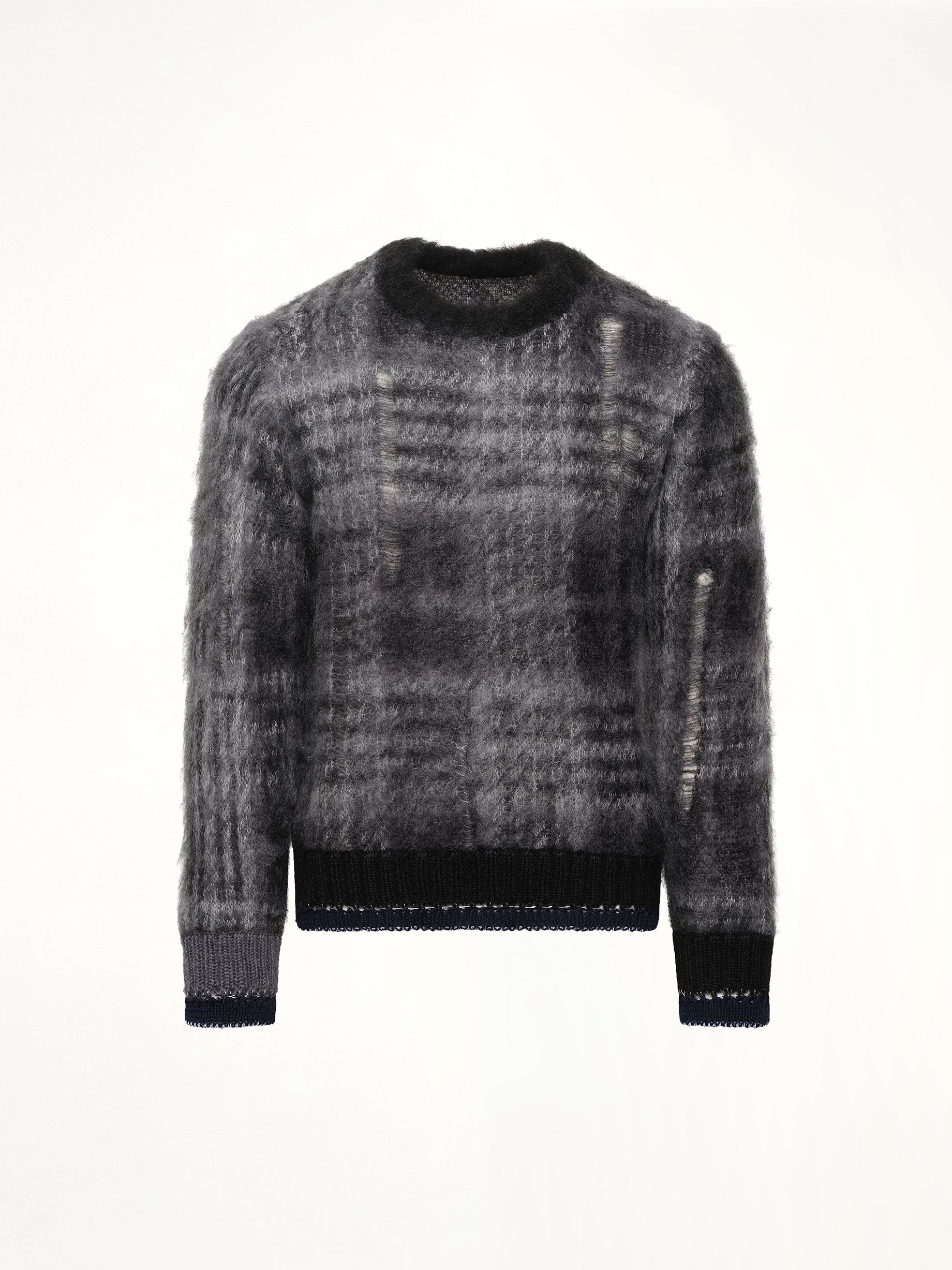 Sacai's Plaid Mohair Knit Pullover in Black is a stylish and cozy addition to any wardrobe. This pullover combines a classic plaid pattern with a modern silhouette, making it perfect for both casual and dressy occasions.