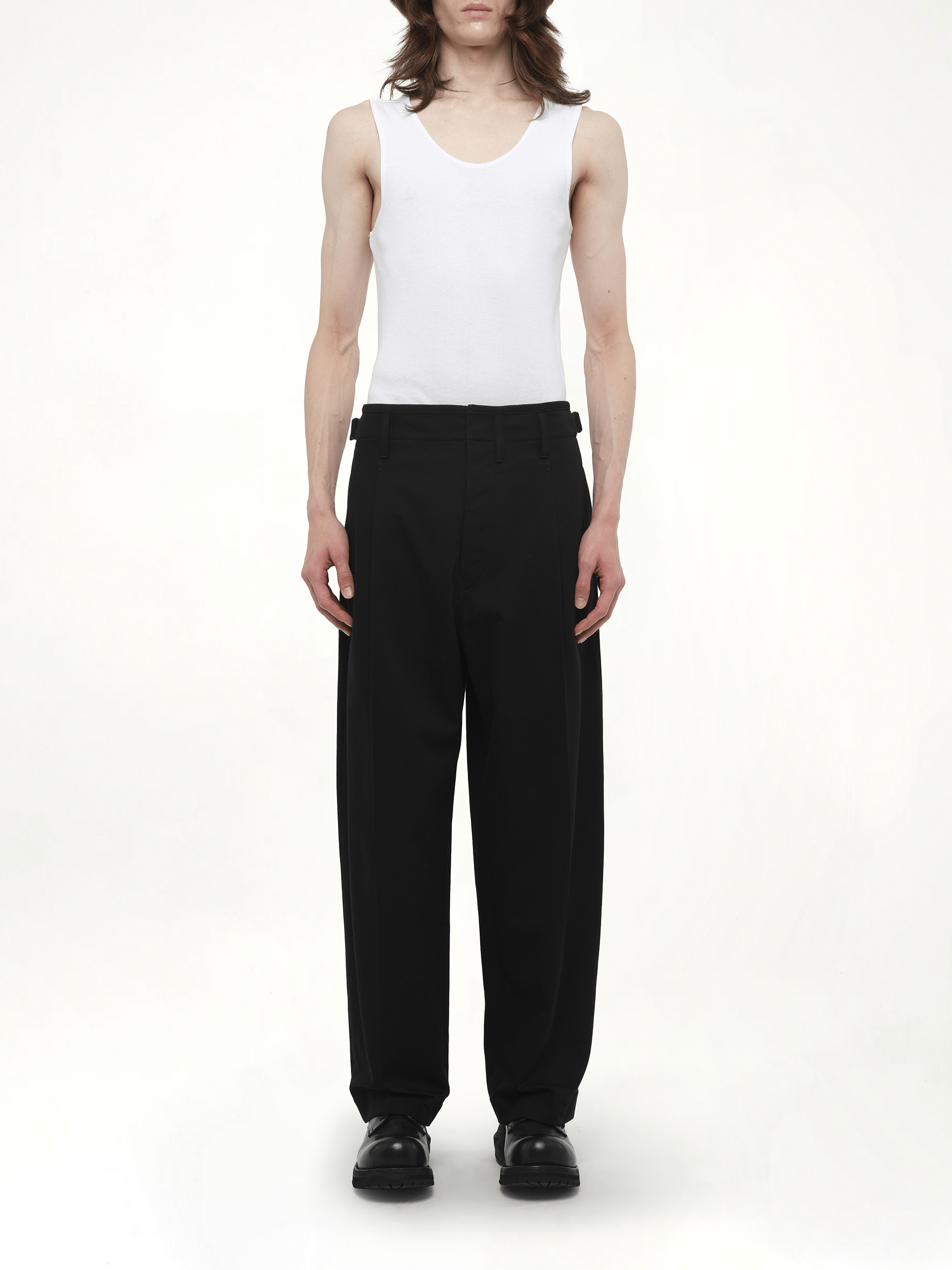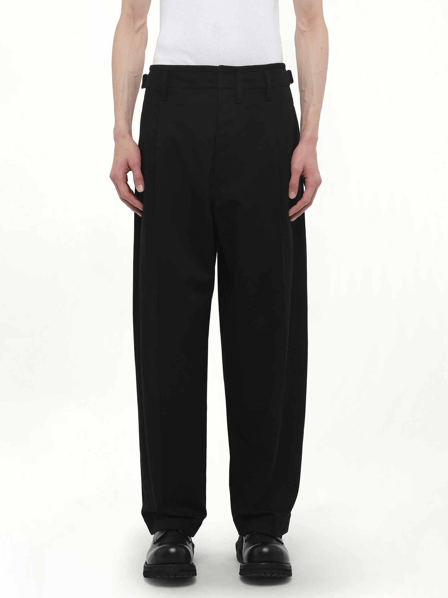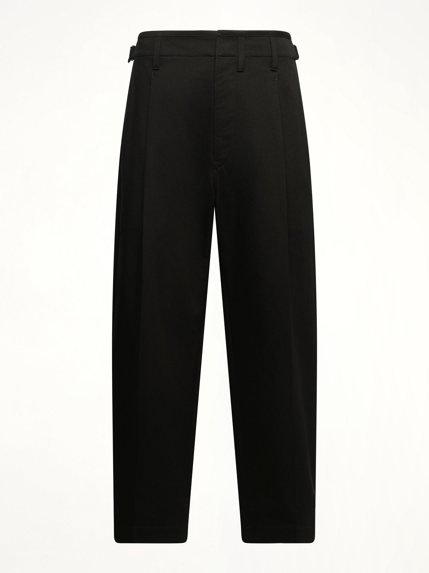 Lemaire's Pleated Carrot Pants in Black, crafted from soft, durable fabric with a distinctive pleated design that enhances their relaxed, tapered silhouette. These pants offer a contemporary take on classic tailoring, providing both style and comfort for various occasions.