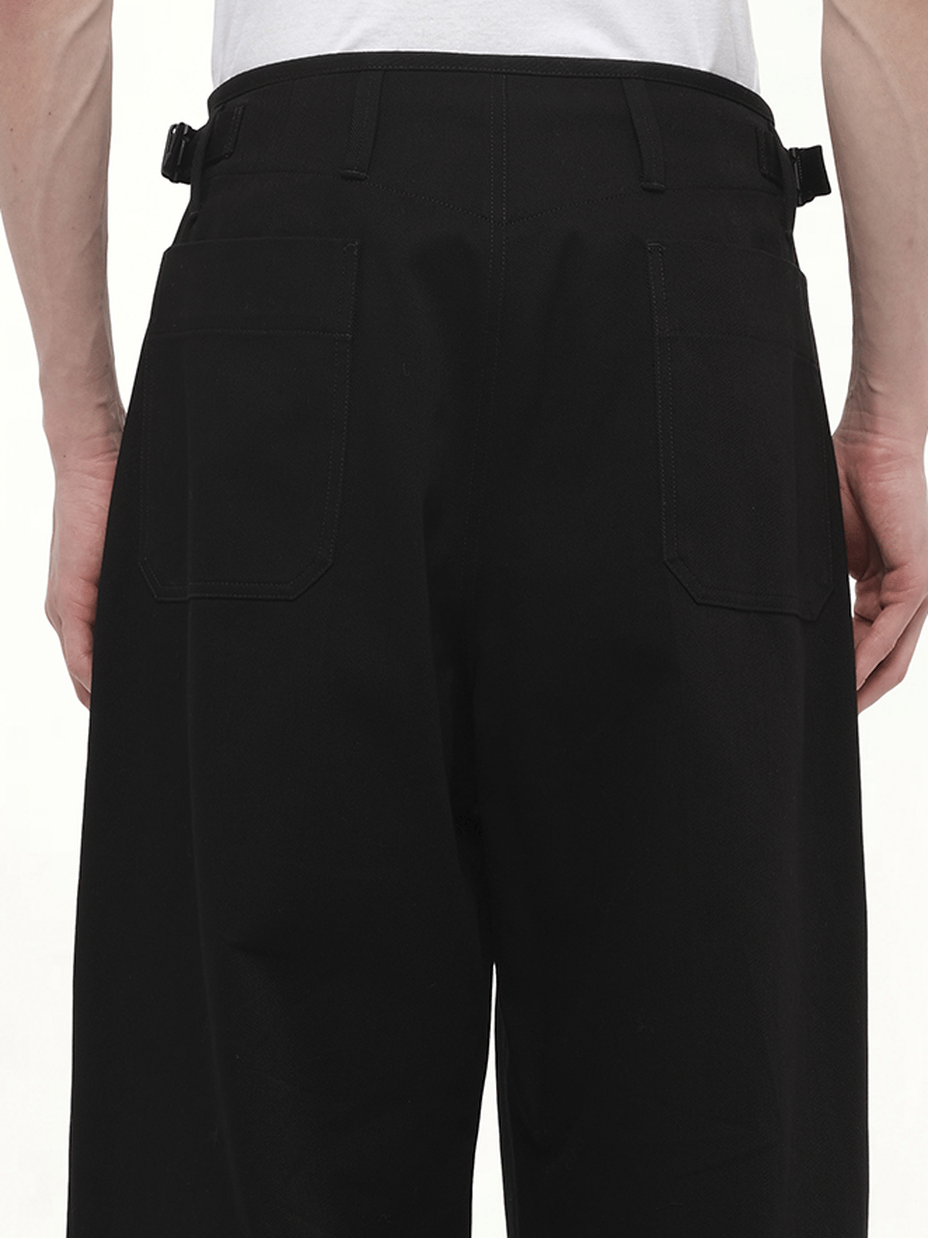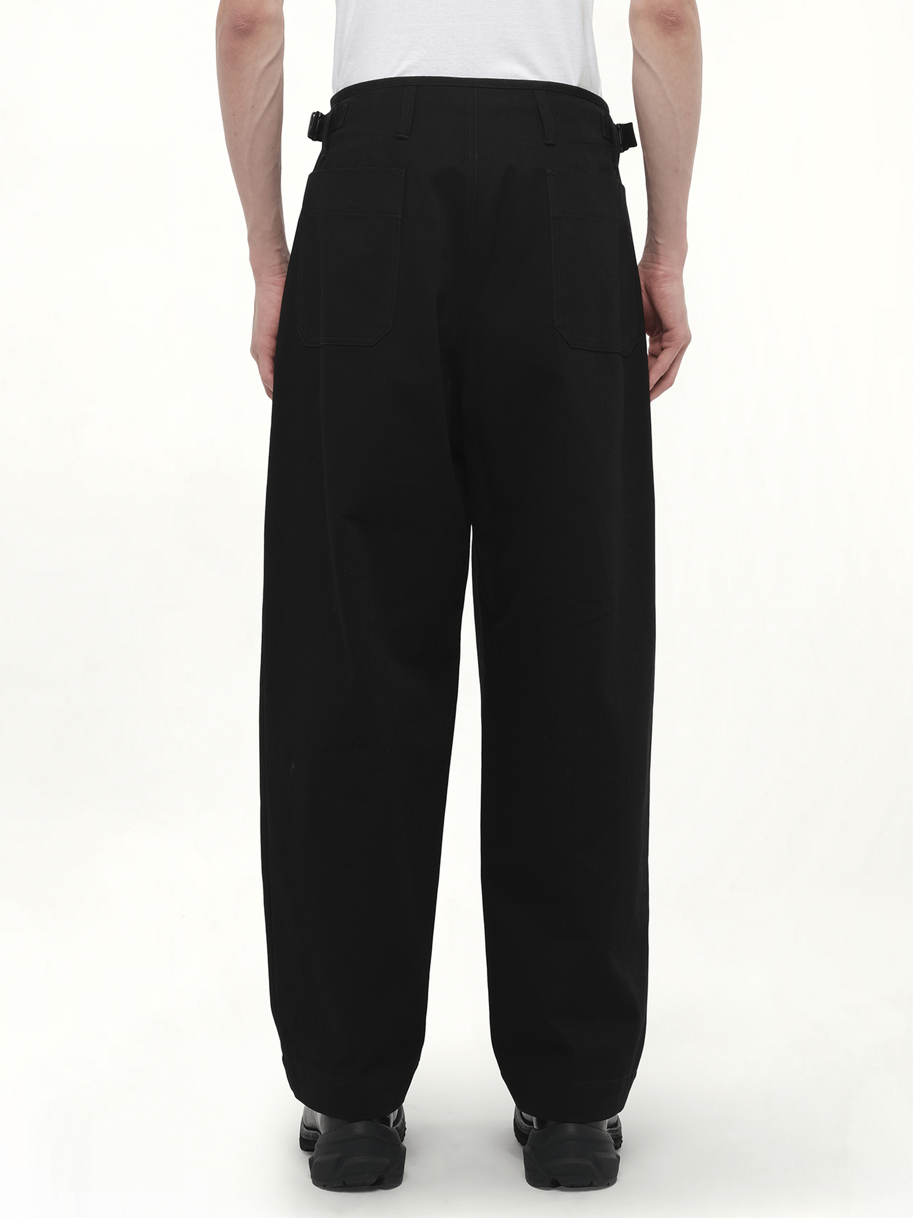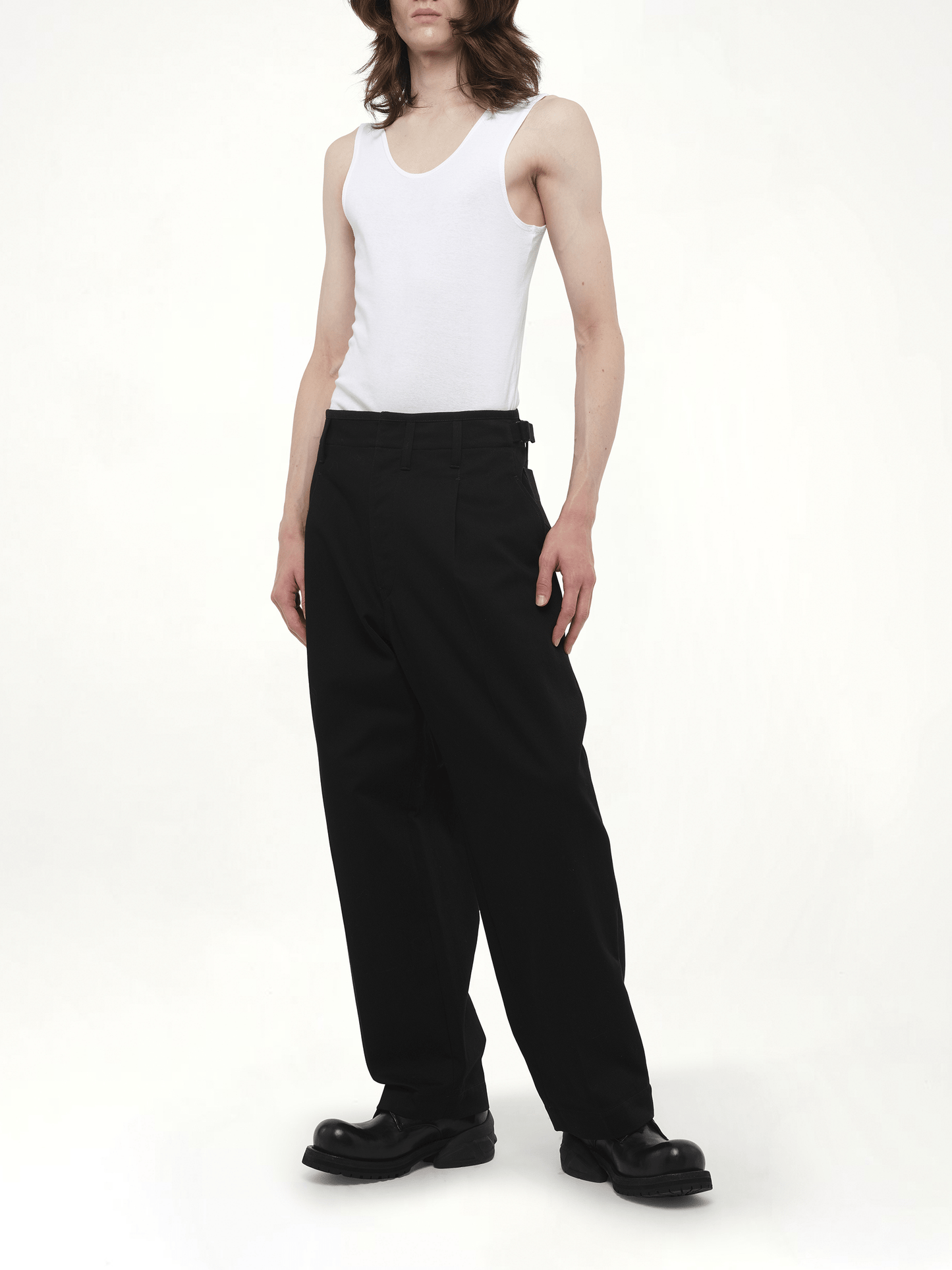 Lemaire's Pleated Carrot Pants in Black, crafted from soft, durable fabric with a distinctive pleated design that enhances their relaxed, tapered silhouette. These pants offer a contemporary take on classic tailoring, providing both style and comfort for various occasions.