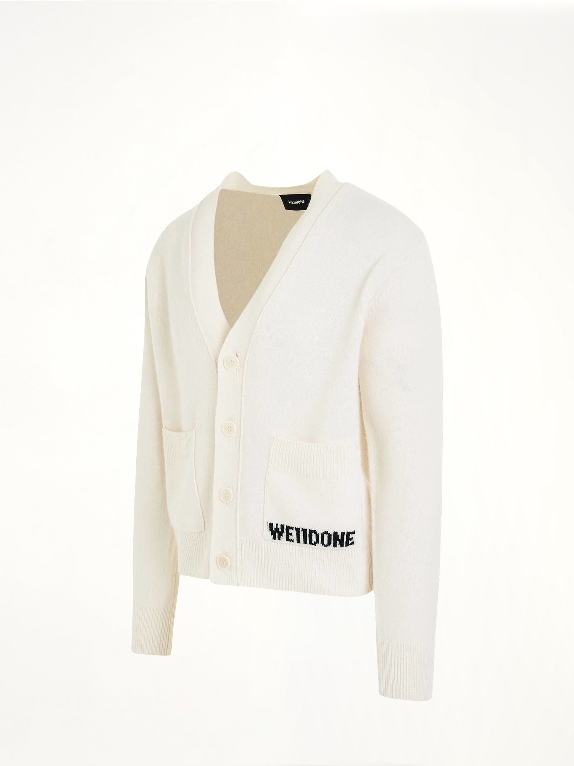 We11done's Pocket Logo Knit Cardigan in Ivory is a stylish and versatile addition to any wardrobe. This cardigan combines contemporary design with classic elements for a chic look.