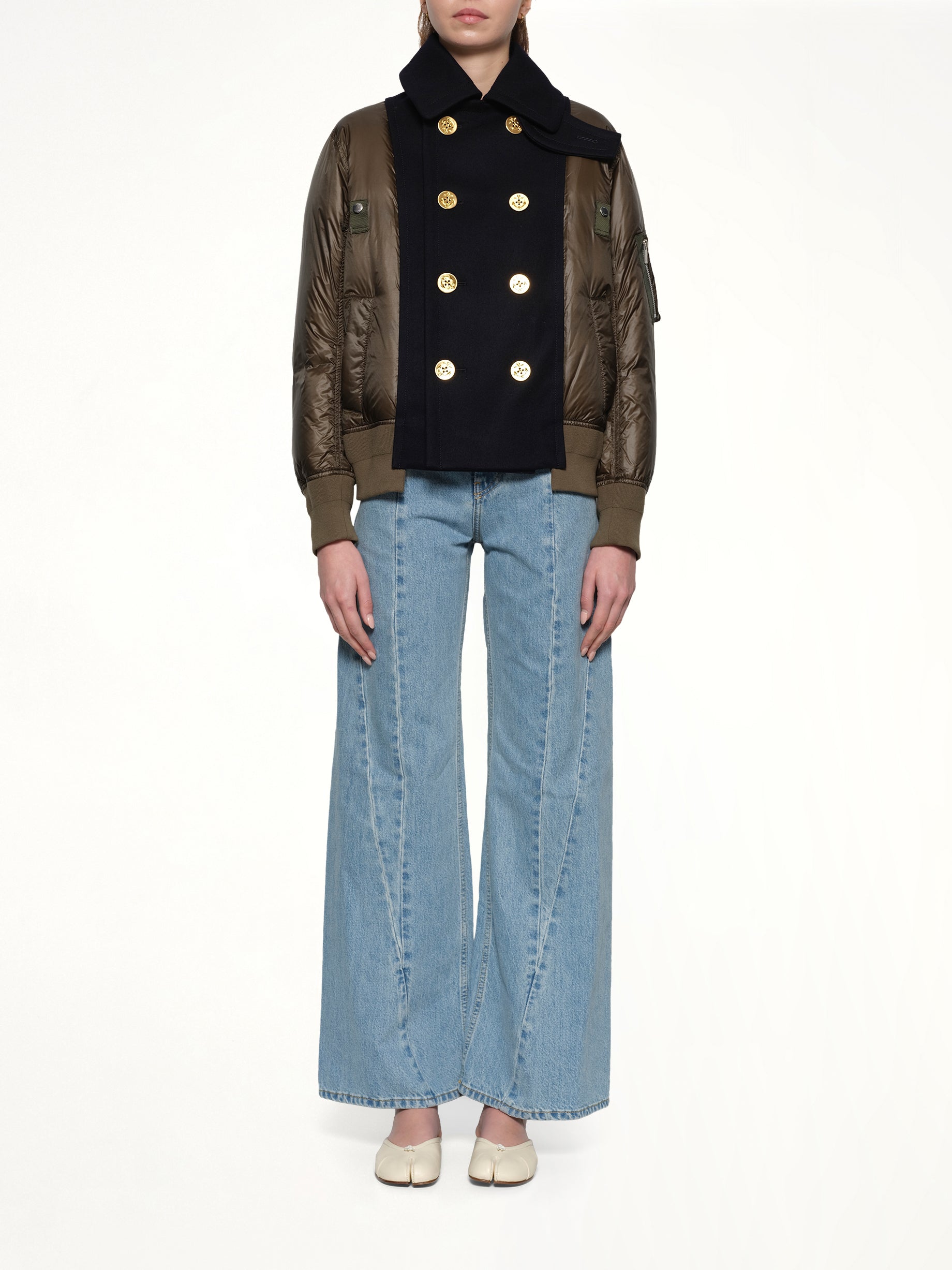 Sacai's Puffer Blouson in Navy/Khaki is a stylish and versatile outerwear piece that combines functionality with modern design. Perfect for transitional weather, this blouson offers a unique blend of colors and textures.