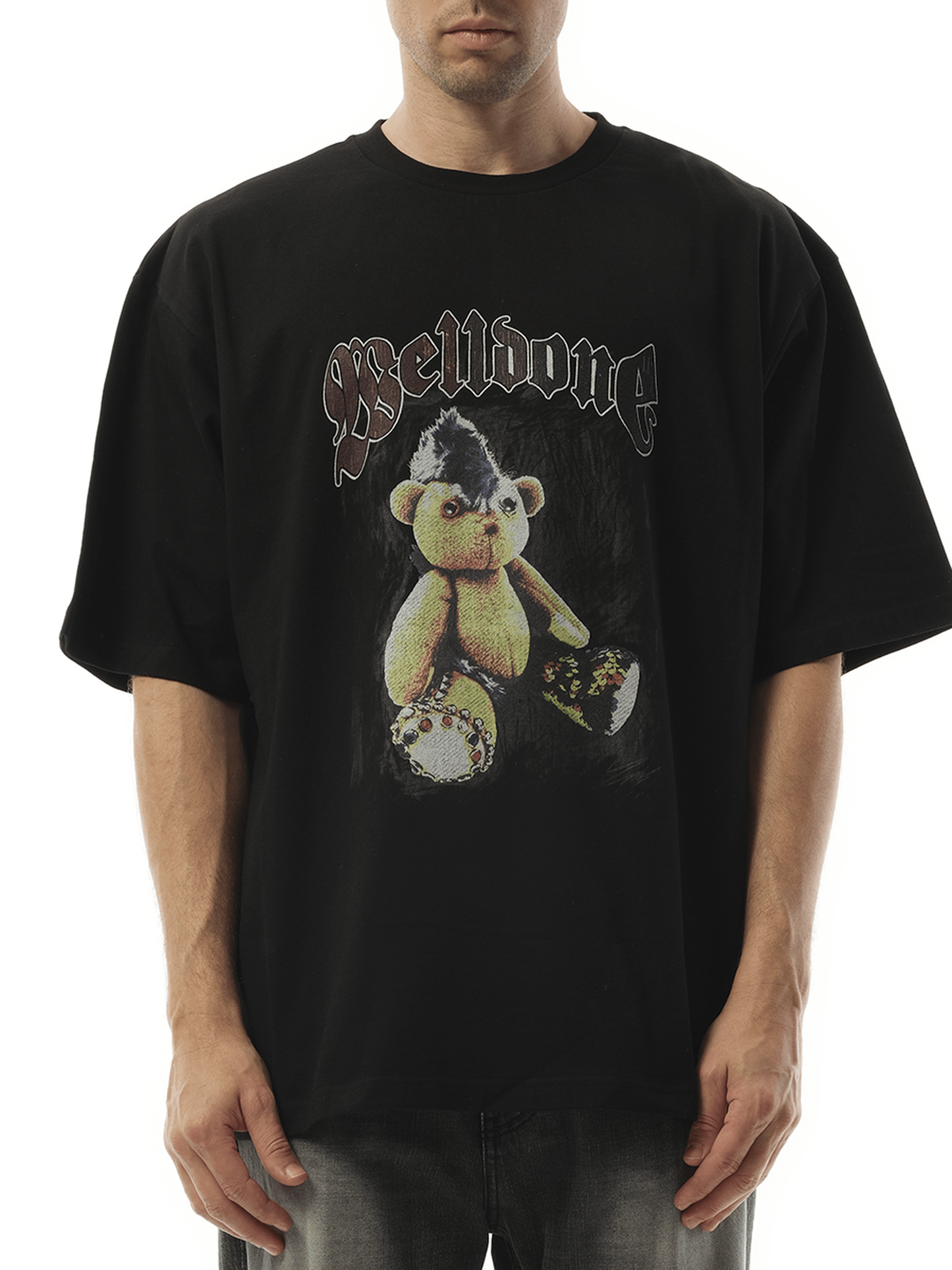 This trendy and edgy Punk Teddy T-Shirt in Black is a must-have for any fashion-forward individual. Made from high-quality materials, this t-shirt features a unique punk teddy design that will make you stand out from the crowd. With its comfortable fit and stylish look, you'll love wearing this t-shirt for any occasion.