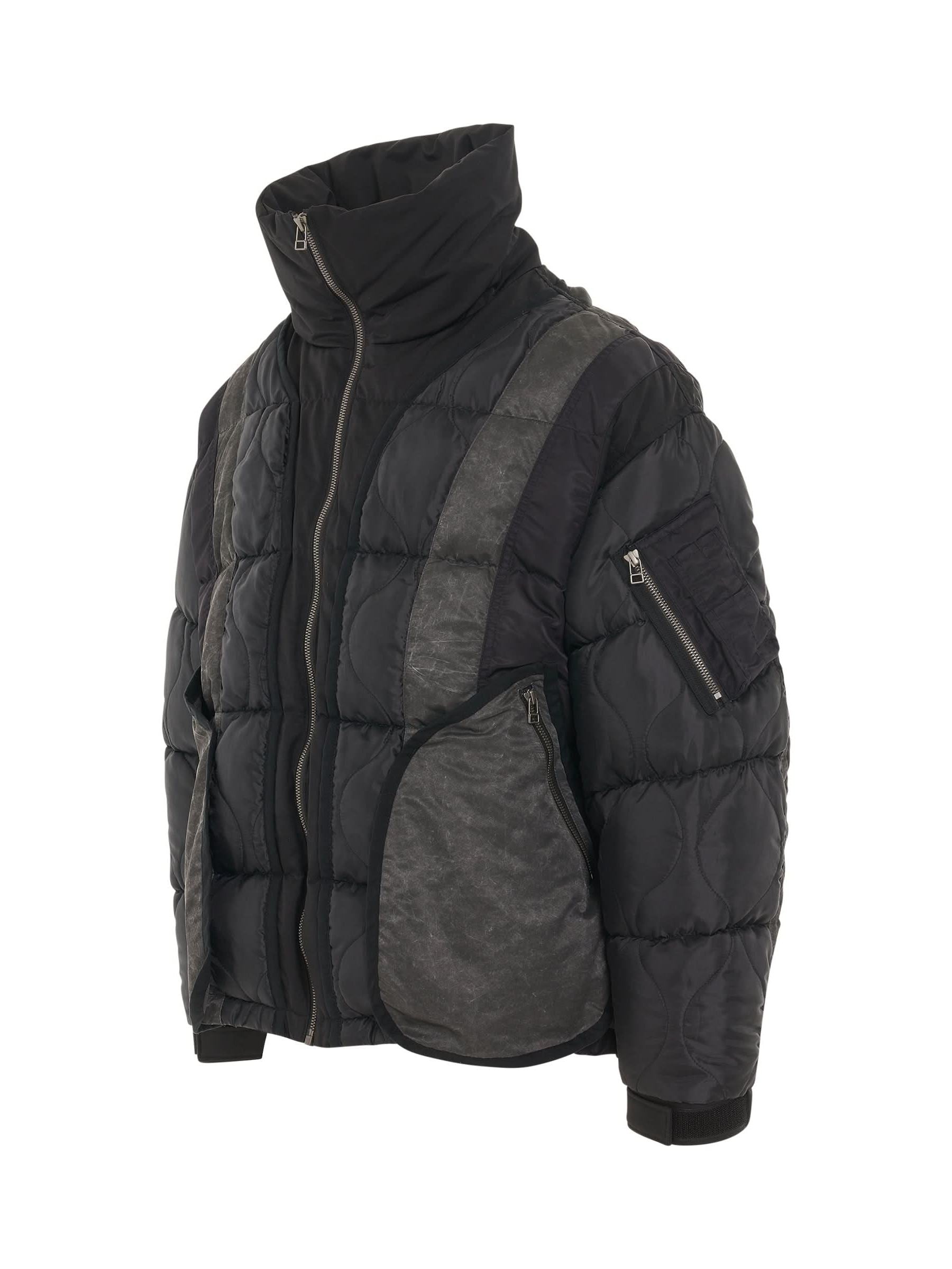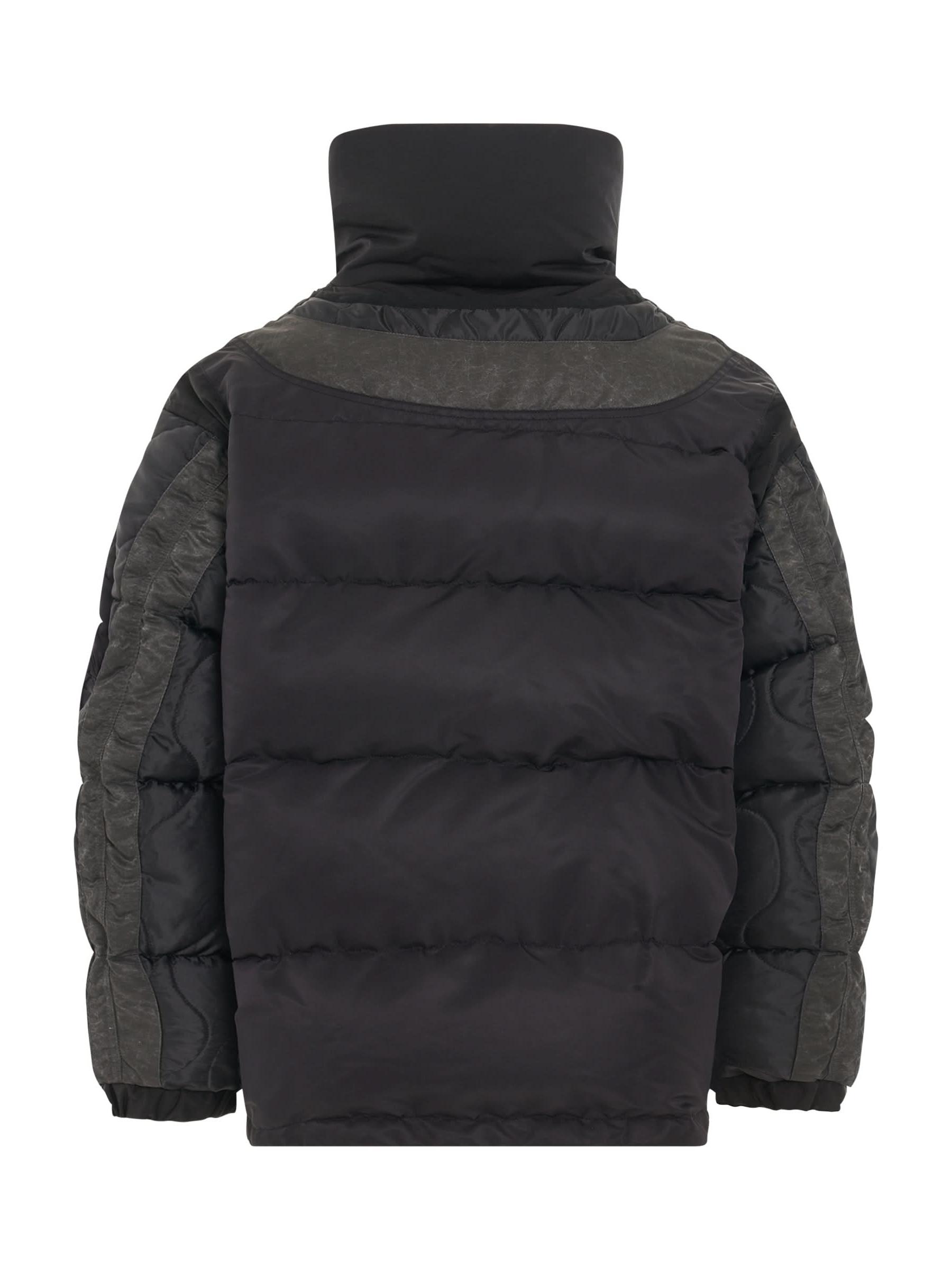 Long sleeves quilted down jacket in black with front zipper fastening, two front pouch pocket and zippered pouch pocket on the sleeve