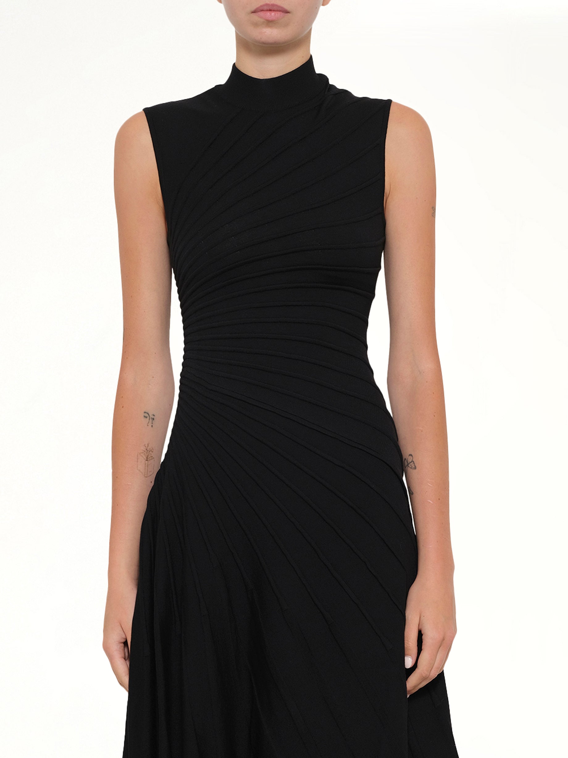 Alaia's Ray Dress in Black is a sophisticated and timeless piece, perfect for any elegant occasion. Its sleek design and flattering silhouette make it a must-have for any wardrobe.