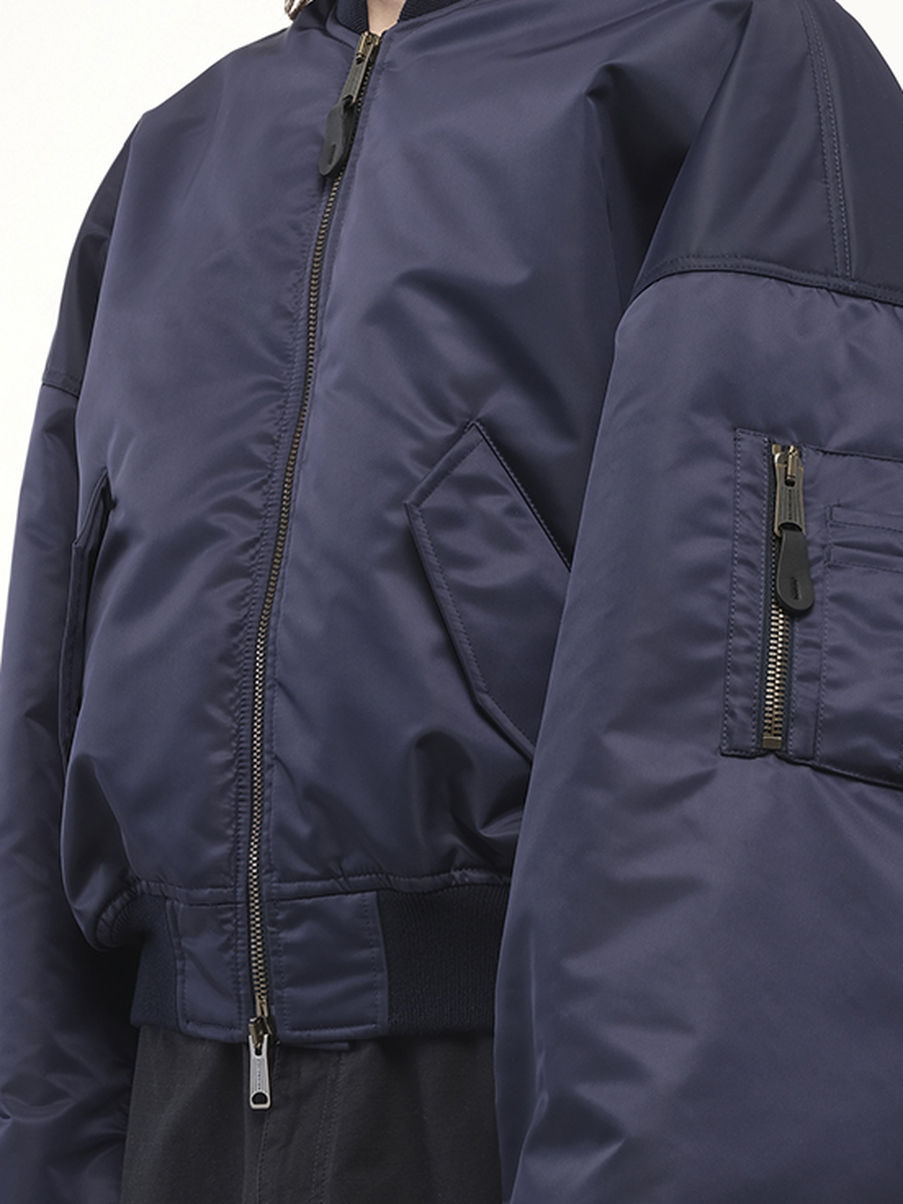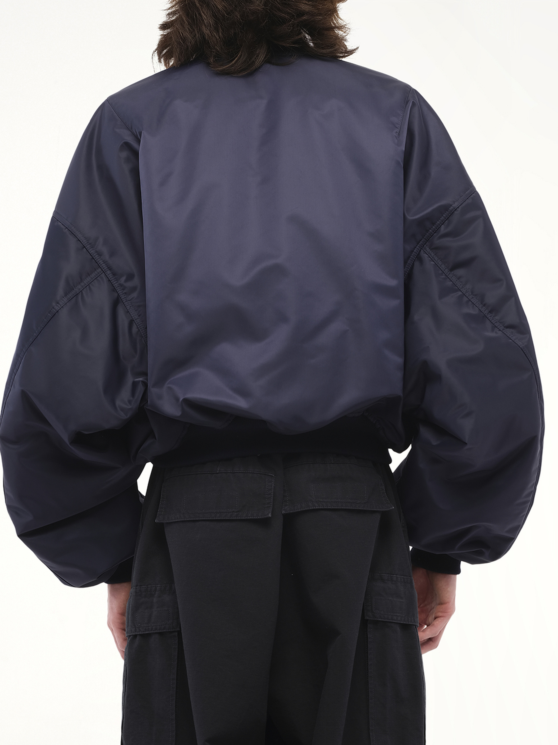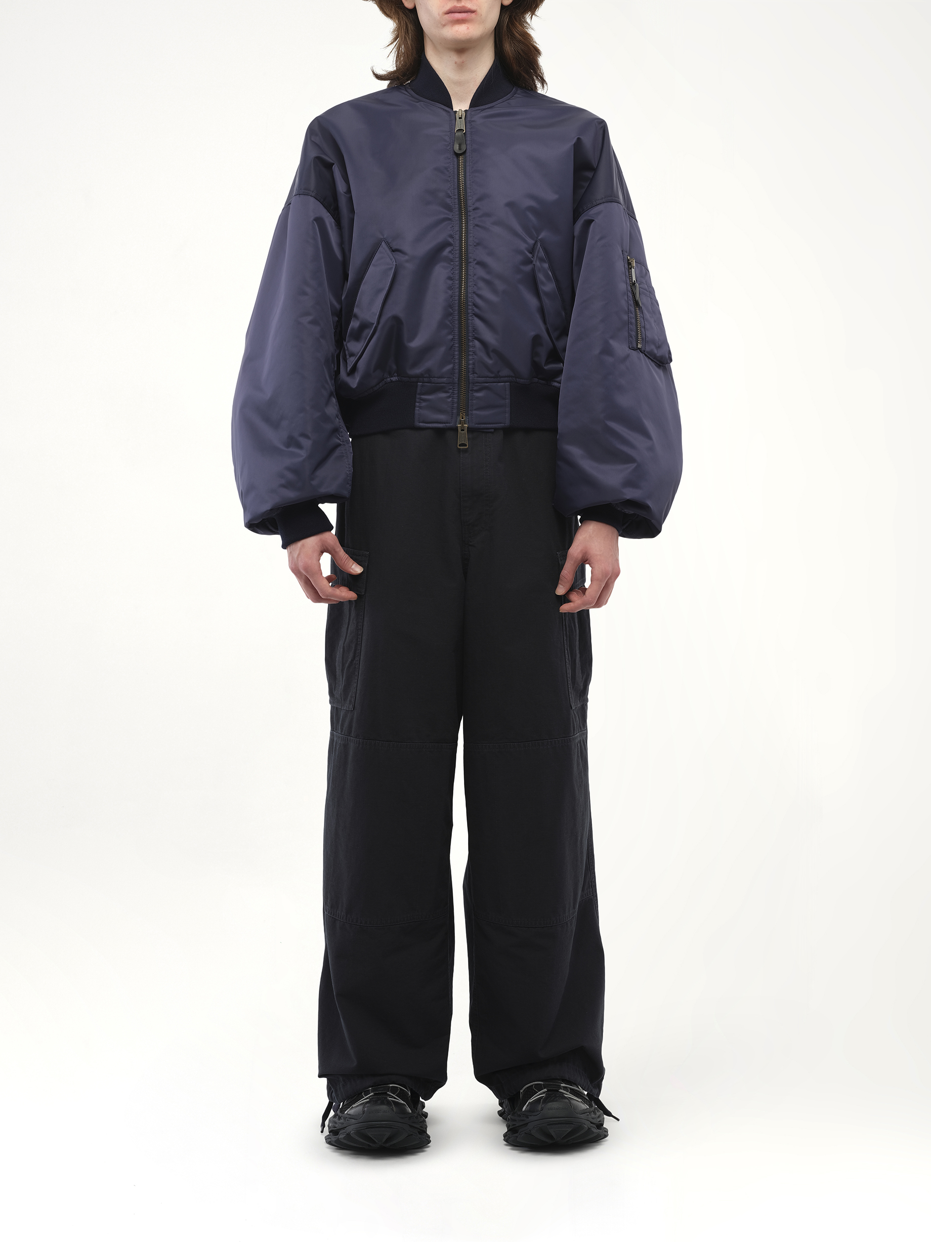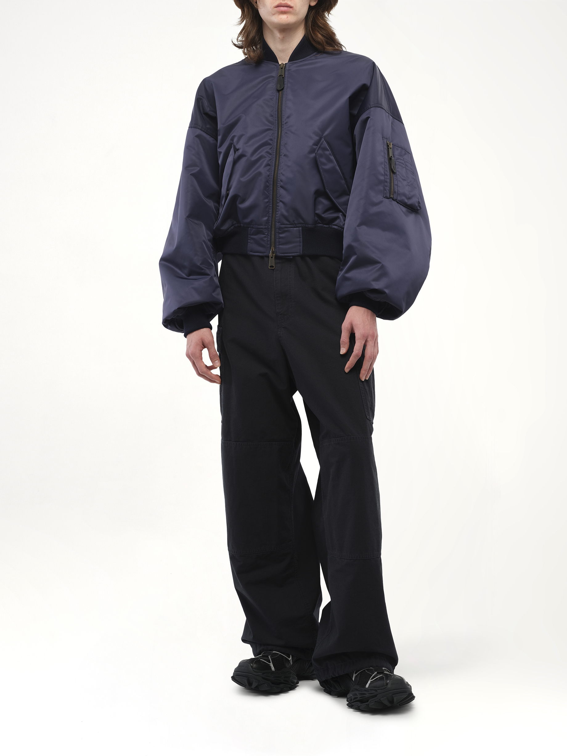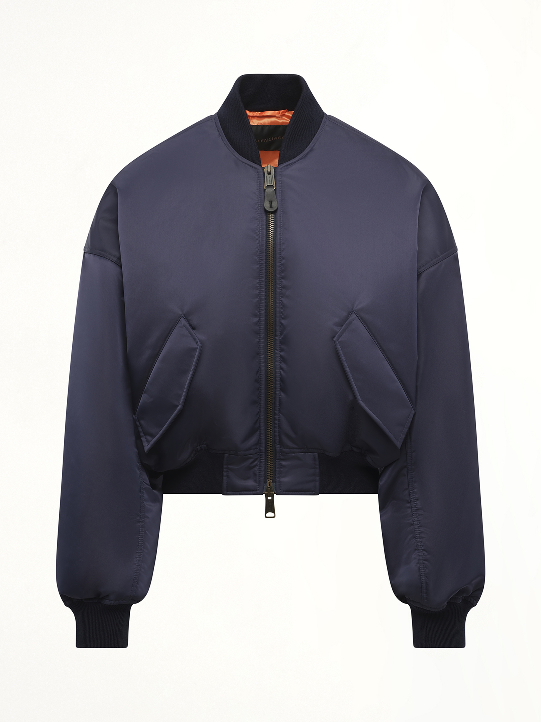 Balenciaga's Round Bomber in Dark Navy is a bold take on the classic bomber jacket, featuring an oversized silhouette with exaggerated sleeves for a contemporary look. Crafted with precision, this jacket combines style and functionality for a truly unique statement piece.