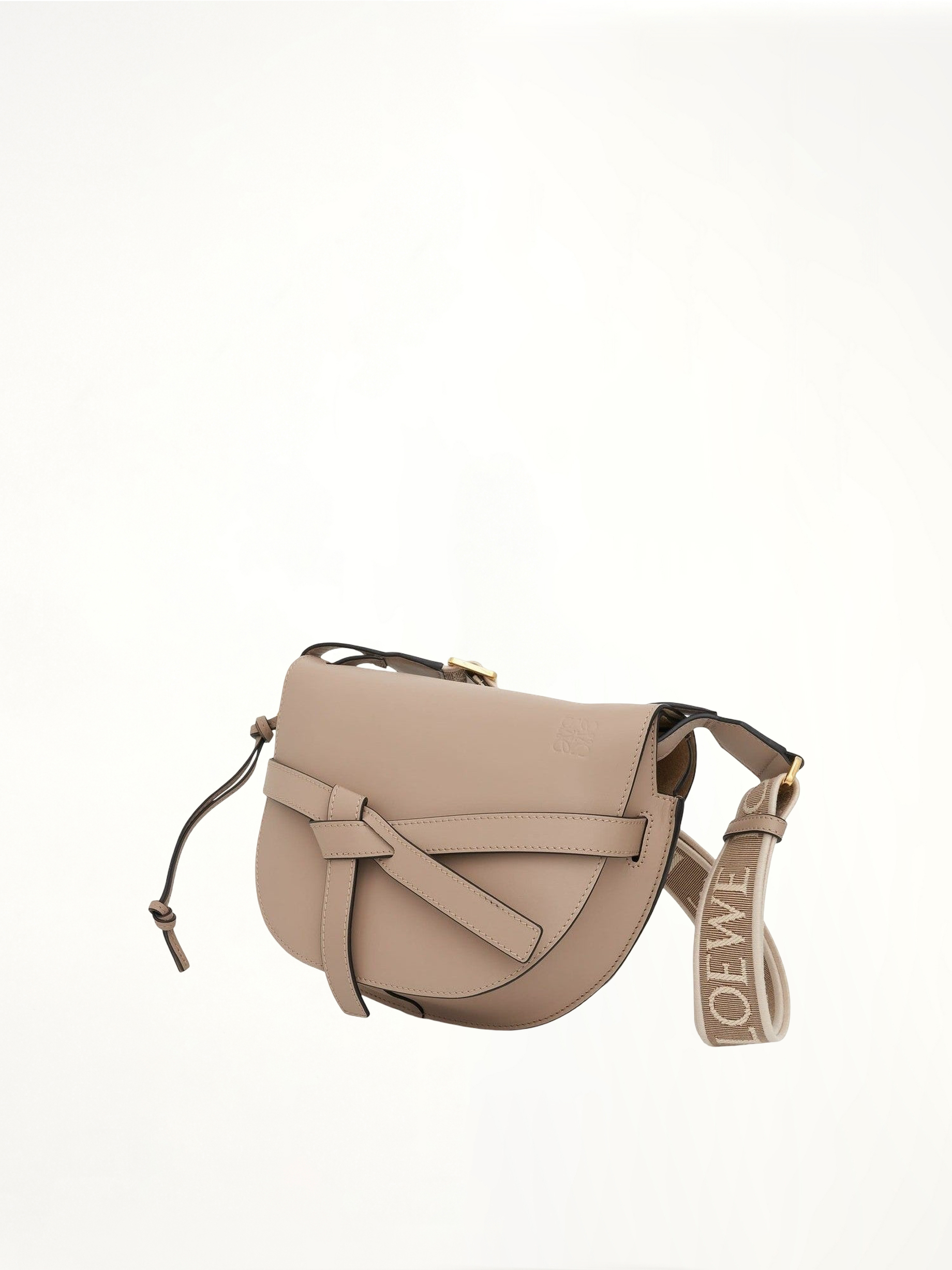 Small gate bag in soft calfskin and jacquard strap in sand with logo shoulder strap, knot detailing, foldover top